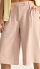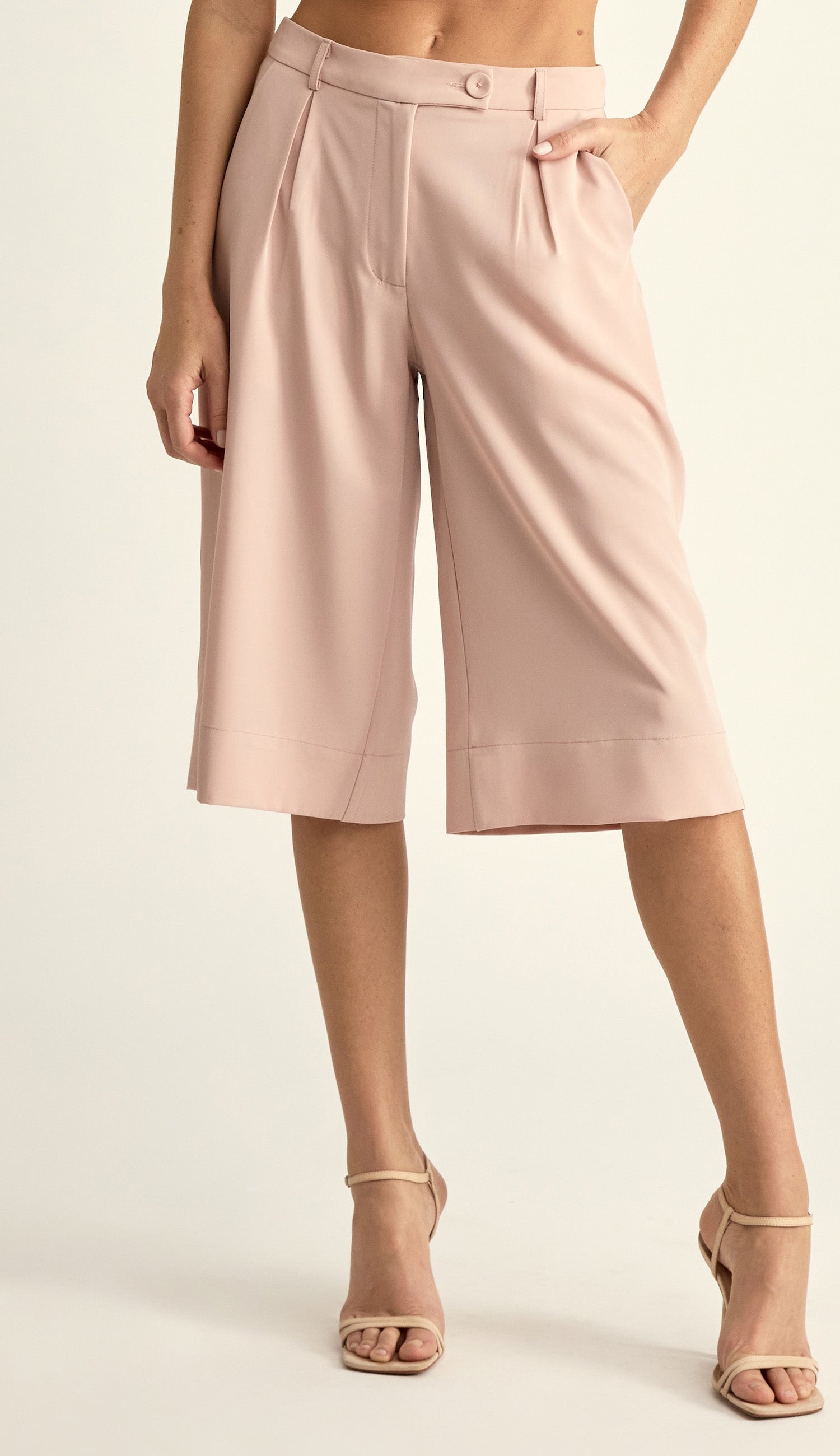 Bermuda com forro na peça toda; confeccionada em crepe de alfaiataria com toque levemente acetinado. Possui modelagem soltinha, pregas frontais, bolsos faca nas laterais, bolso embutido nas costas, passantes no cós e fechamento frontal por zíper, botão transparente interno e botão forrado deslocado no cós.