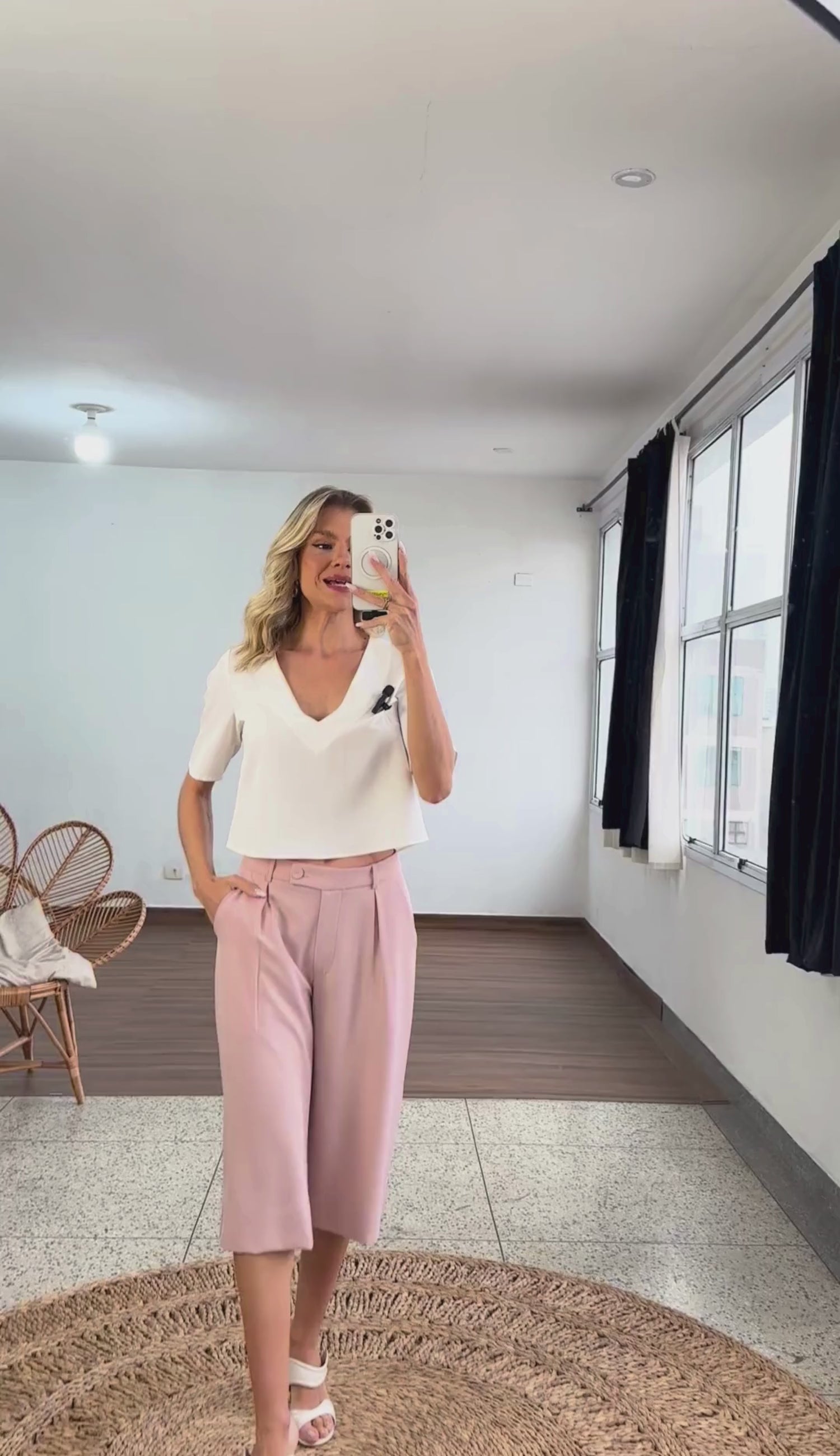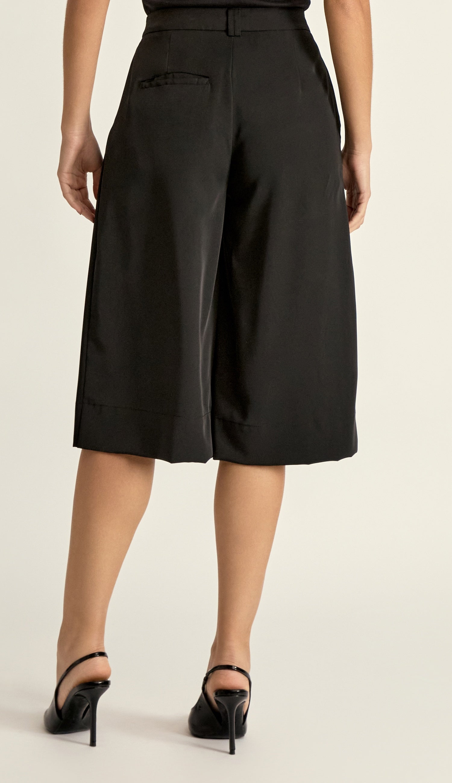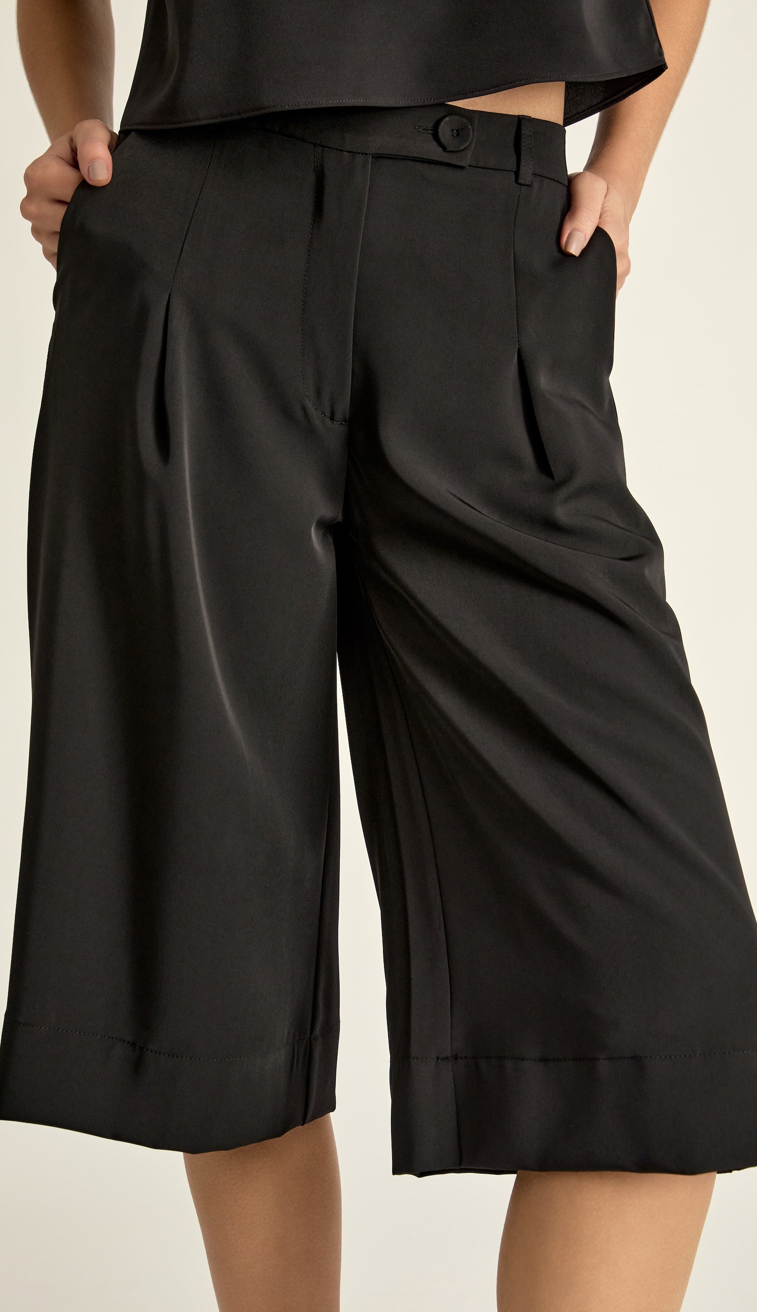 Bermuda com forro na peça toda; confeccionada em crepe de alfaiataria com toque levemente acetinado. Possui modelagem soltinha, pregas frontais, bolsos faca nas laterais, bolso embutido nas costas, passantes no cós e fechamento frontal por zíper, botão transparente interno e botão forrado deslocado no cós.