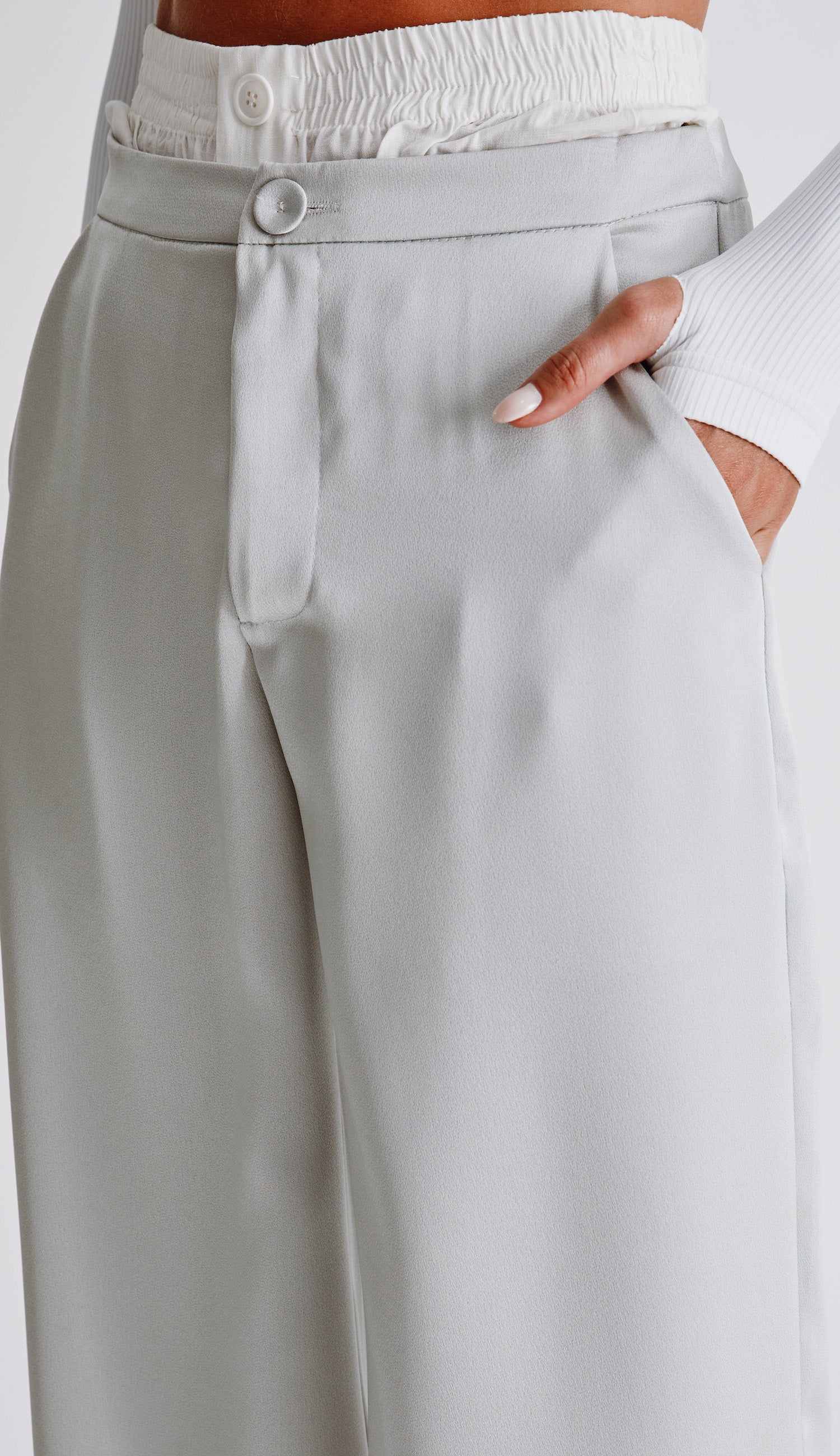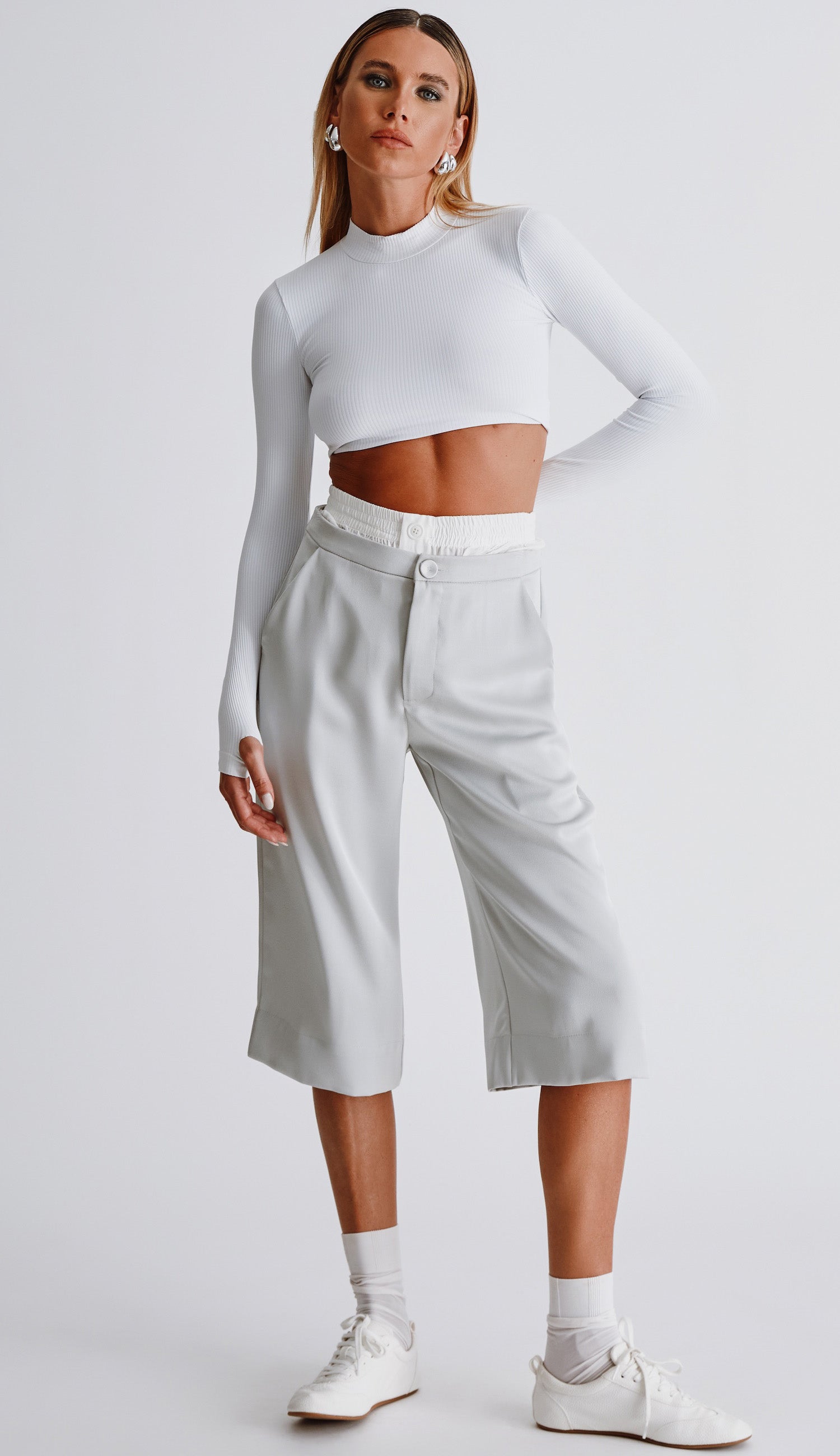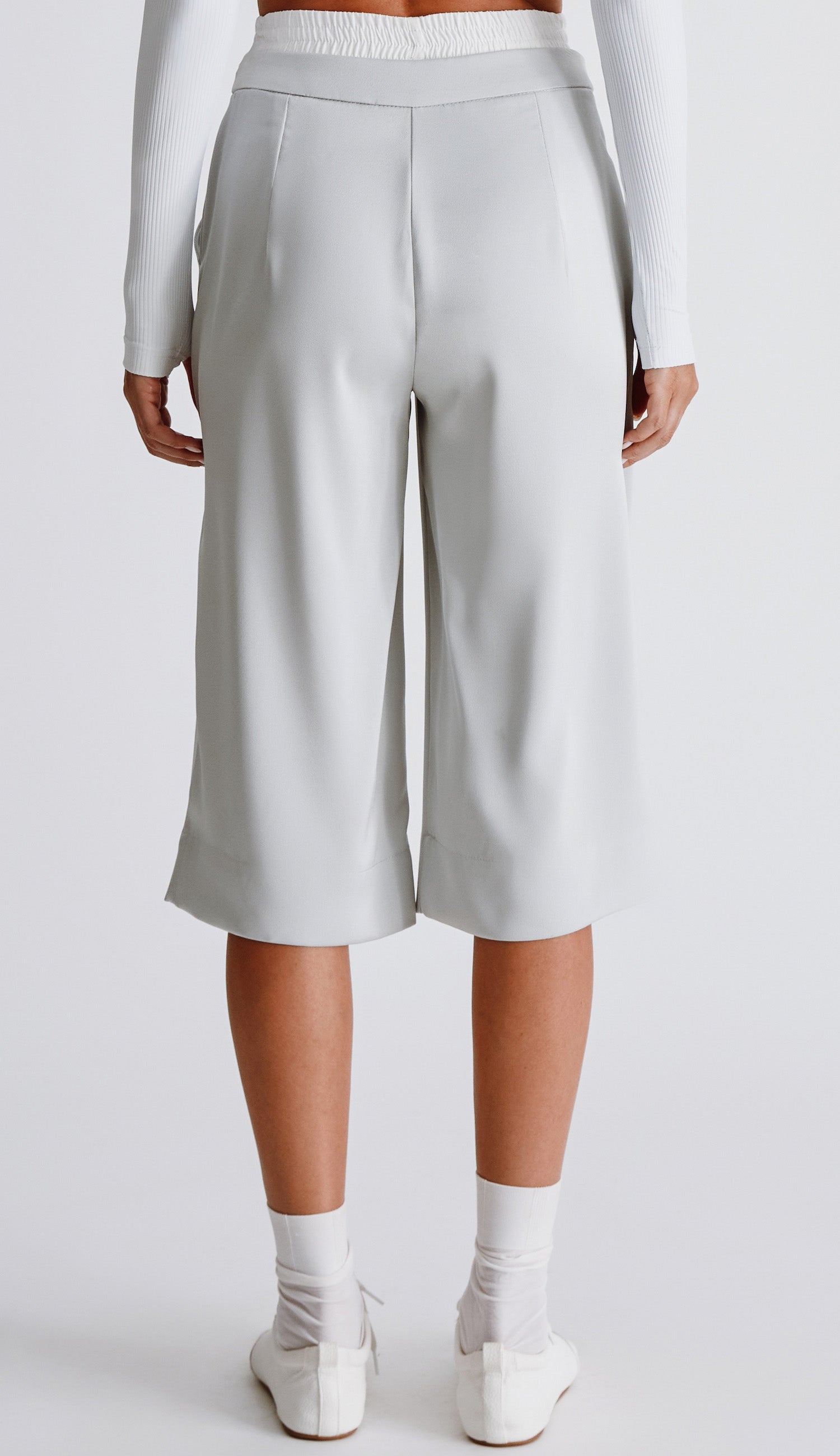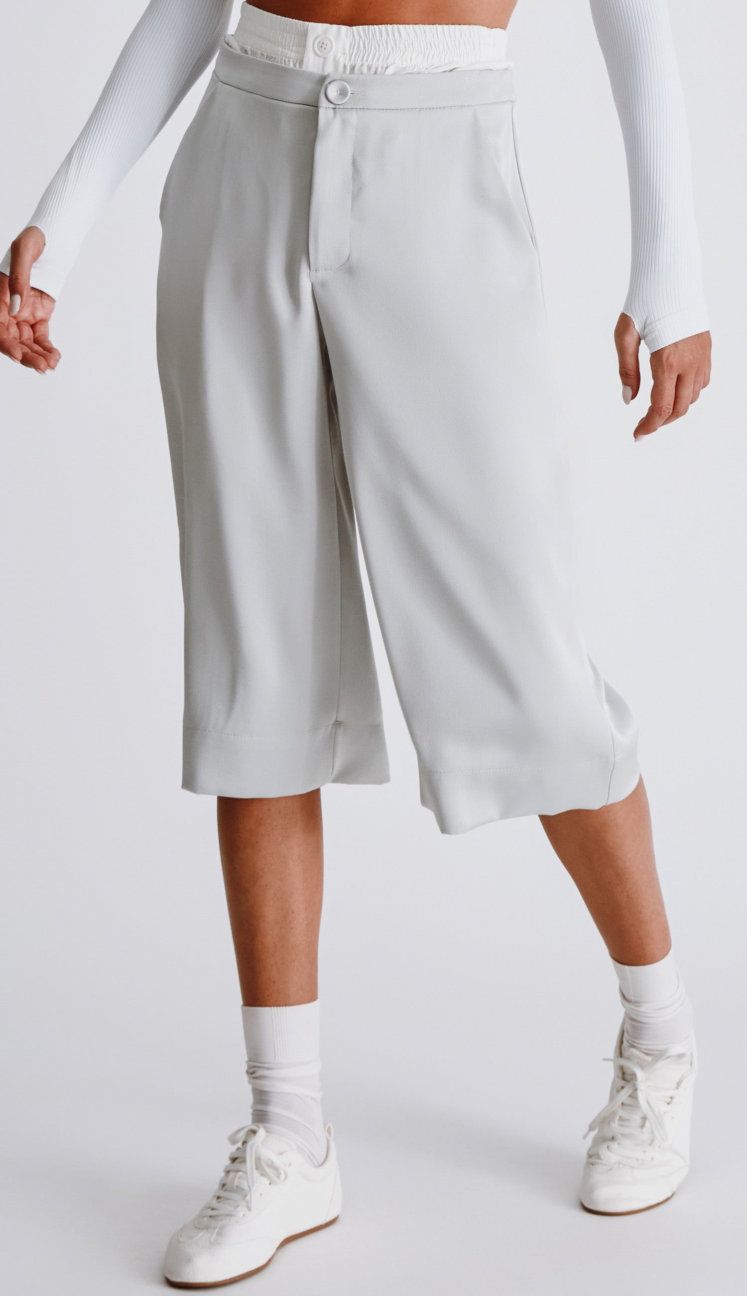 Bermuda confeccionada em alfaiataria levemente acetinada. Conta com o detalhe de cós em poliviscose sobreposto ao cós verdadeiro da calça, estilo samba canção com elástico franzido na cintura e botão de massa no centro. A bermuda possui bolsos faca laterais, fechamento frontal por botão forrado e zíper.
