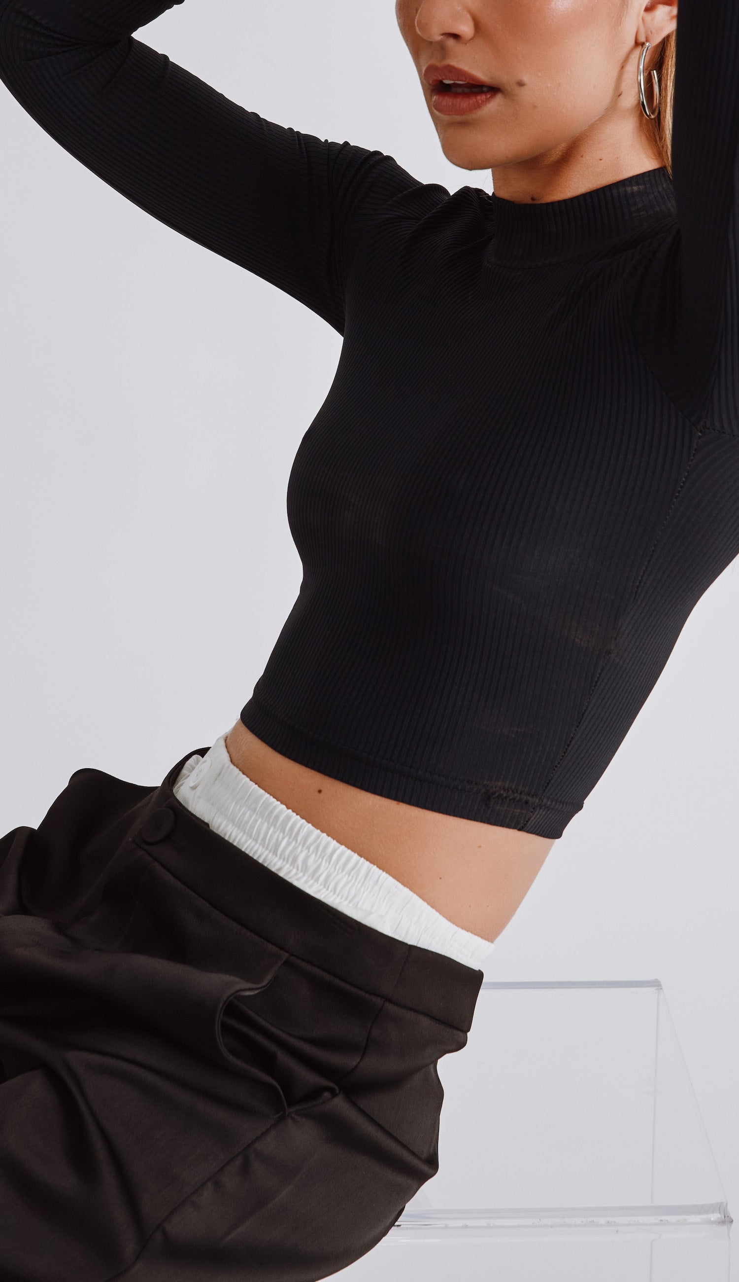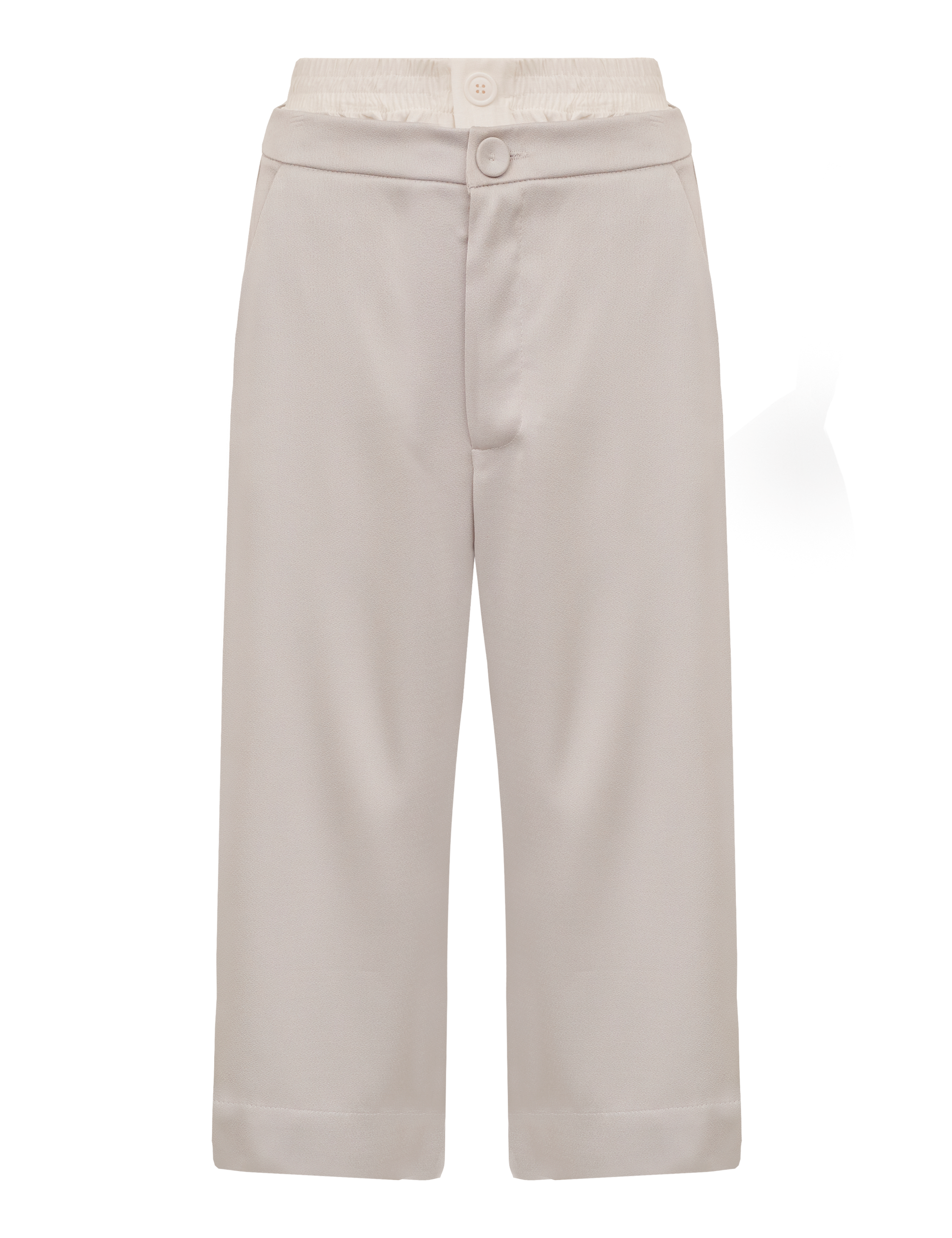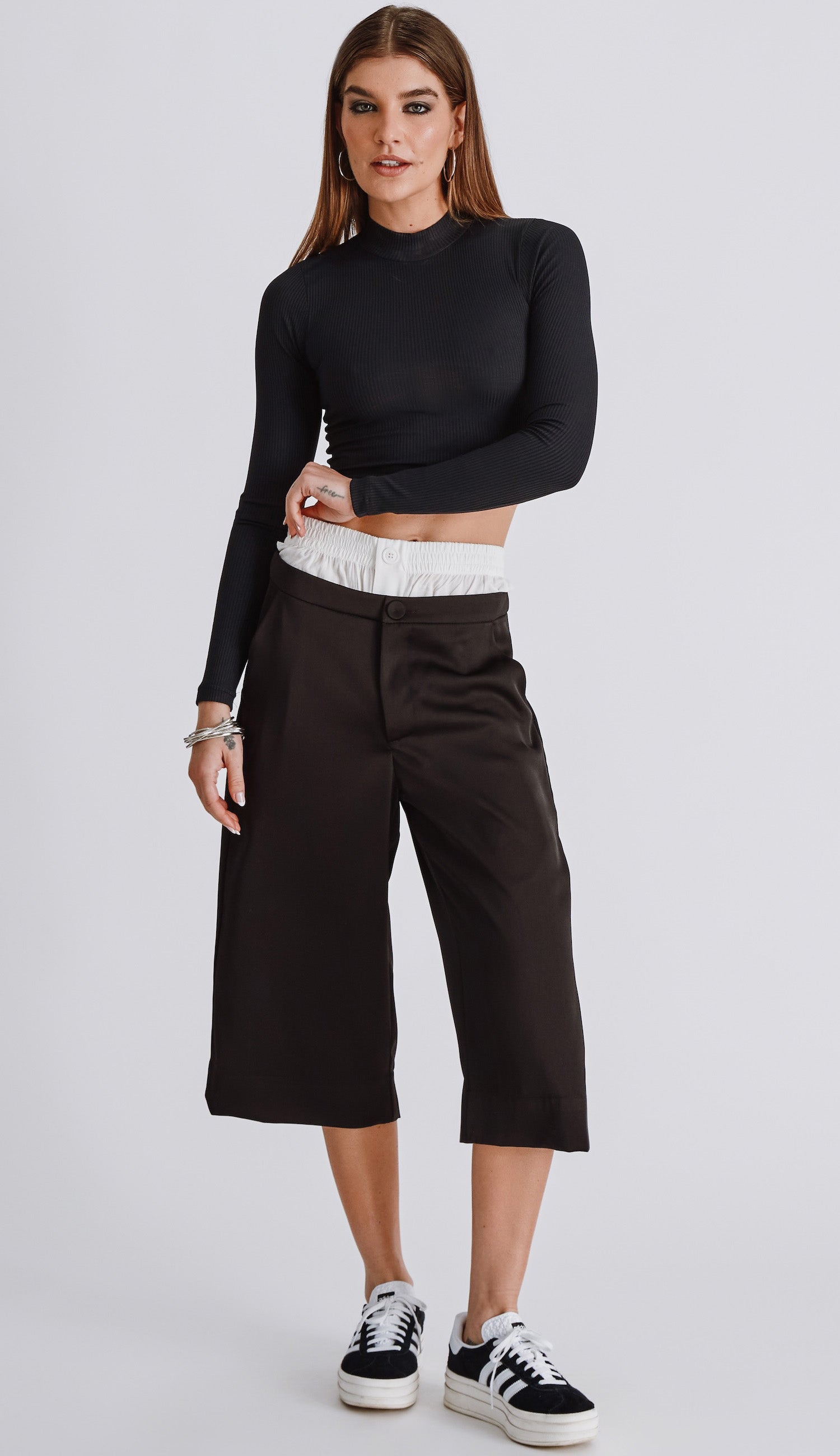 Bermuda confeccionada em alfaiataria levemente acetinada. Conta com o detalhe de cós em poliviscose sobreposto ao cós verdadeiro da calça, estilo samba canção com elástico franzido na cintura e botão de massa no centro. A bermuda possui bolsos faca laterais, fechamento frontal por botão forrado e zíper.
