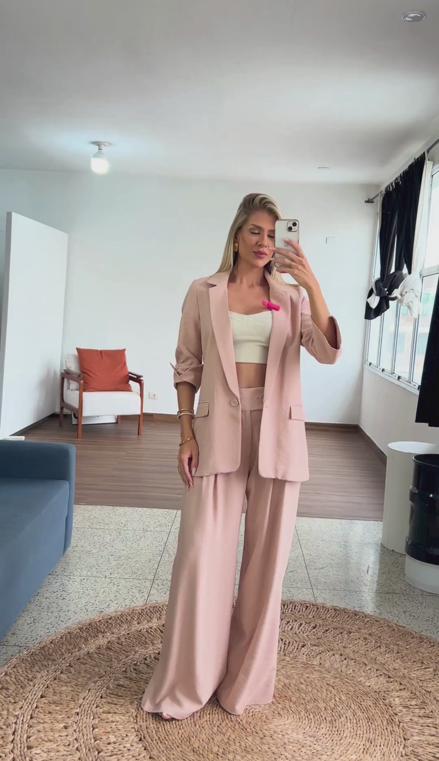 Blazer com forro, confeccionado em alfaiataria de poliviscose com aspecto levemente amassadinho. Possui modelagem soltinha e alongada, lapela dobrada na gola, decote em V profundo com fechamento frontal por único botão forrado, bolsos frontais falsos com lapela e mangas 7/8 aberturinha no punho seguida de detalhe franzido.