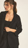Blazer com forro, confeccionado em alfaiataria de poliviscose com aspecto levemente amassadinho. Possui modelagem soltinha e alongada, lapela dobrada na gola, decote em V profundo com fechamento frontal por único botão forrado, bolsos frontais falsos com lapela e mangas 7/8 aberturinha no punho seguida de detalhe franzido.
