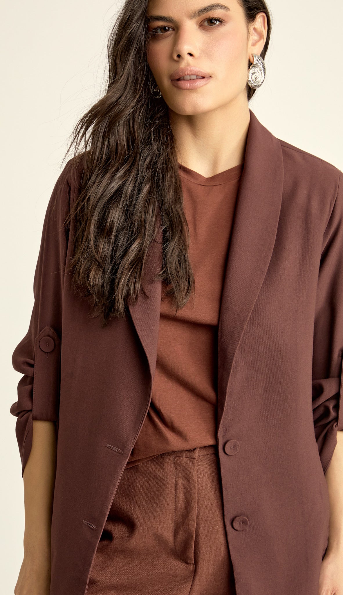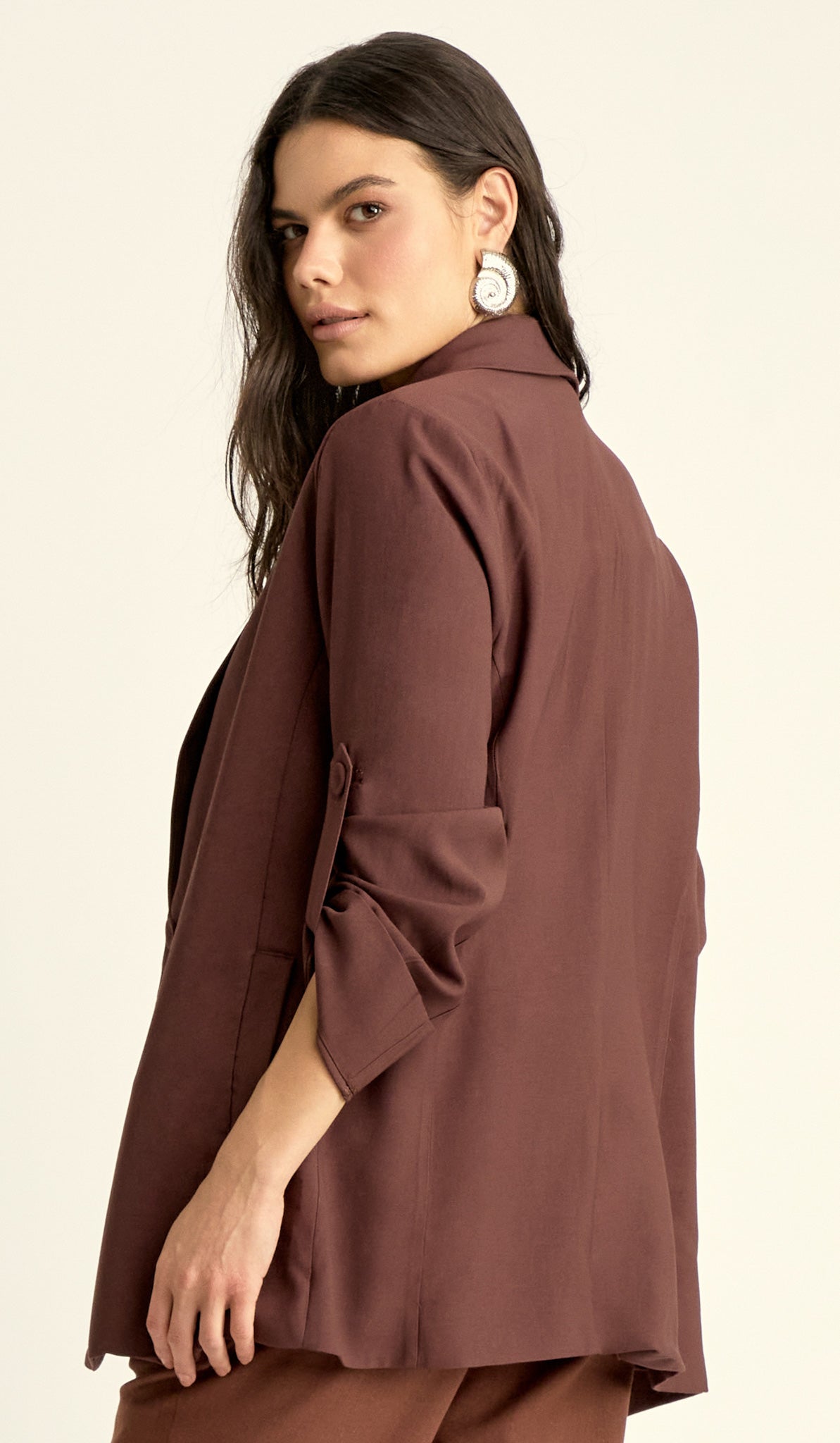 Blazer com forro, confeccionado em sarja de alfaiataria em poliviscose mais encorpada com aspecto amassadinho. Possui modelagem ajustada e alongada, ombreiras para estruturar a peça, decote em V com lapela na gola, fechamento frontal por botões forrados, bolsos laterais e mangas longas com martingale para ajuste do comprimento.