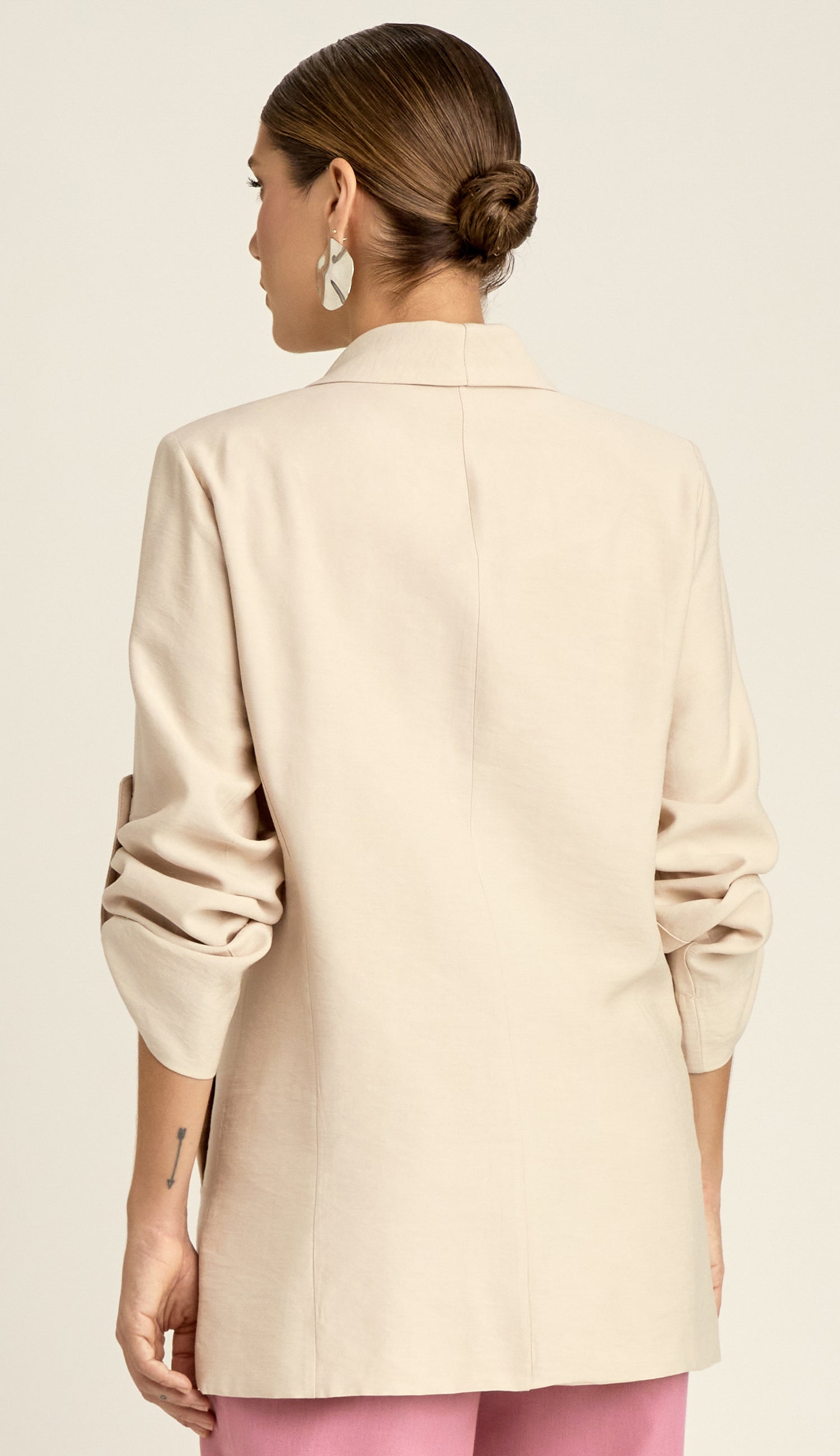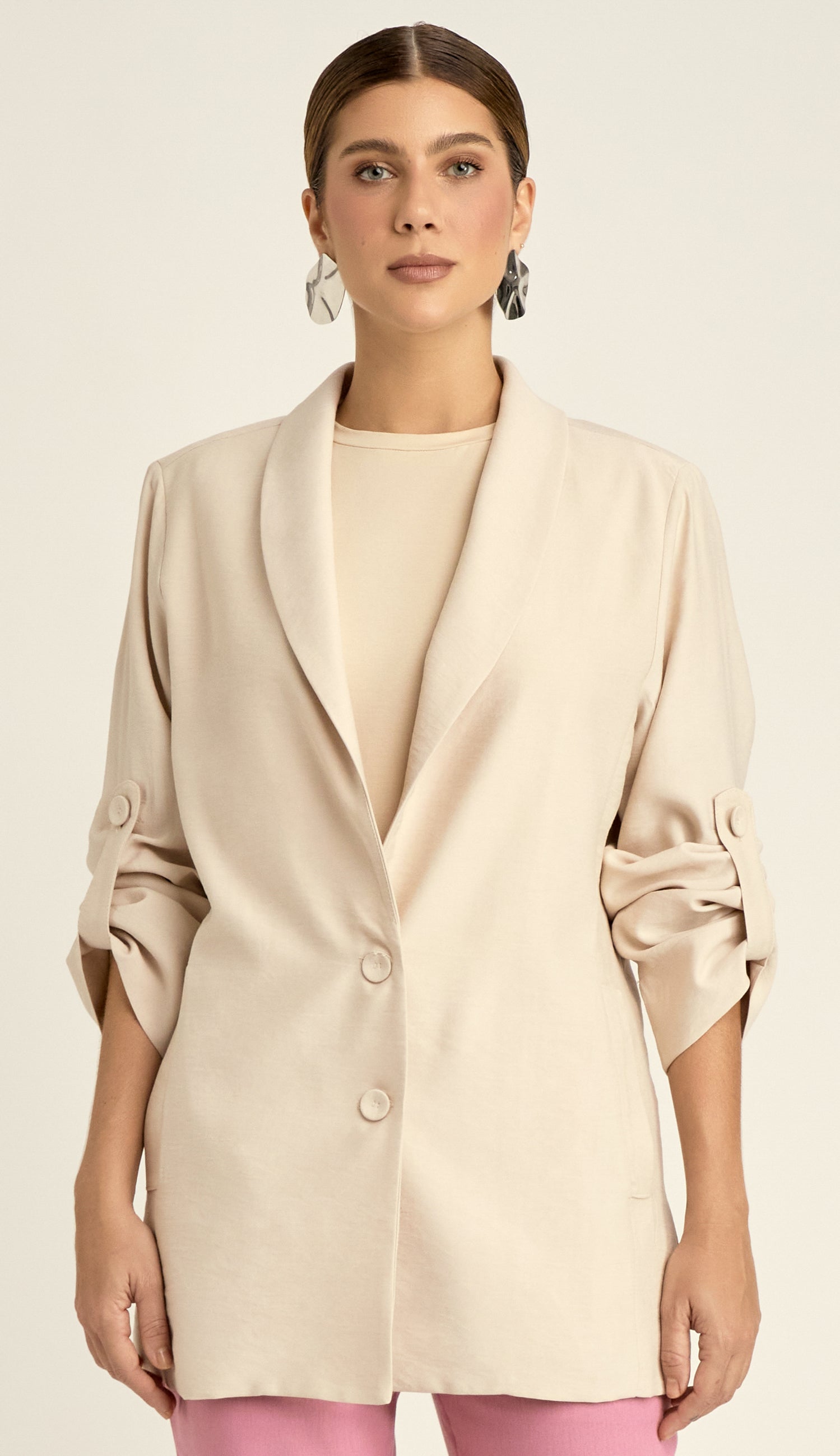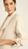 Blazer com forro, confeccionado em sarja de alfaiataria em poliviscose mais encorpada com aspecto amassadinho. Possui modelagem ajustada e alongada, ombreiras para estruturar a peça, decote em V com lapela na gola, fechamento frontal por botões forrados, bolsos laterais e mangas longas com martingale para ajuste do comprimento.