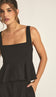 Blusa confeccionada em crepe de alfaiataria. Possui tecido duplo no busto para não ficar transparente, decote quadrado, alças largas com reguladores de metal, lastex franzido nas costas para melhor ajuste ao corpo e babado na cintura estilo peplum.
