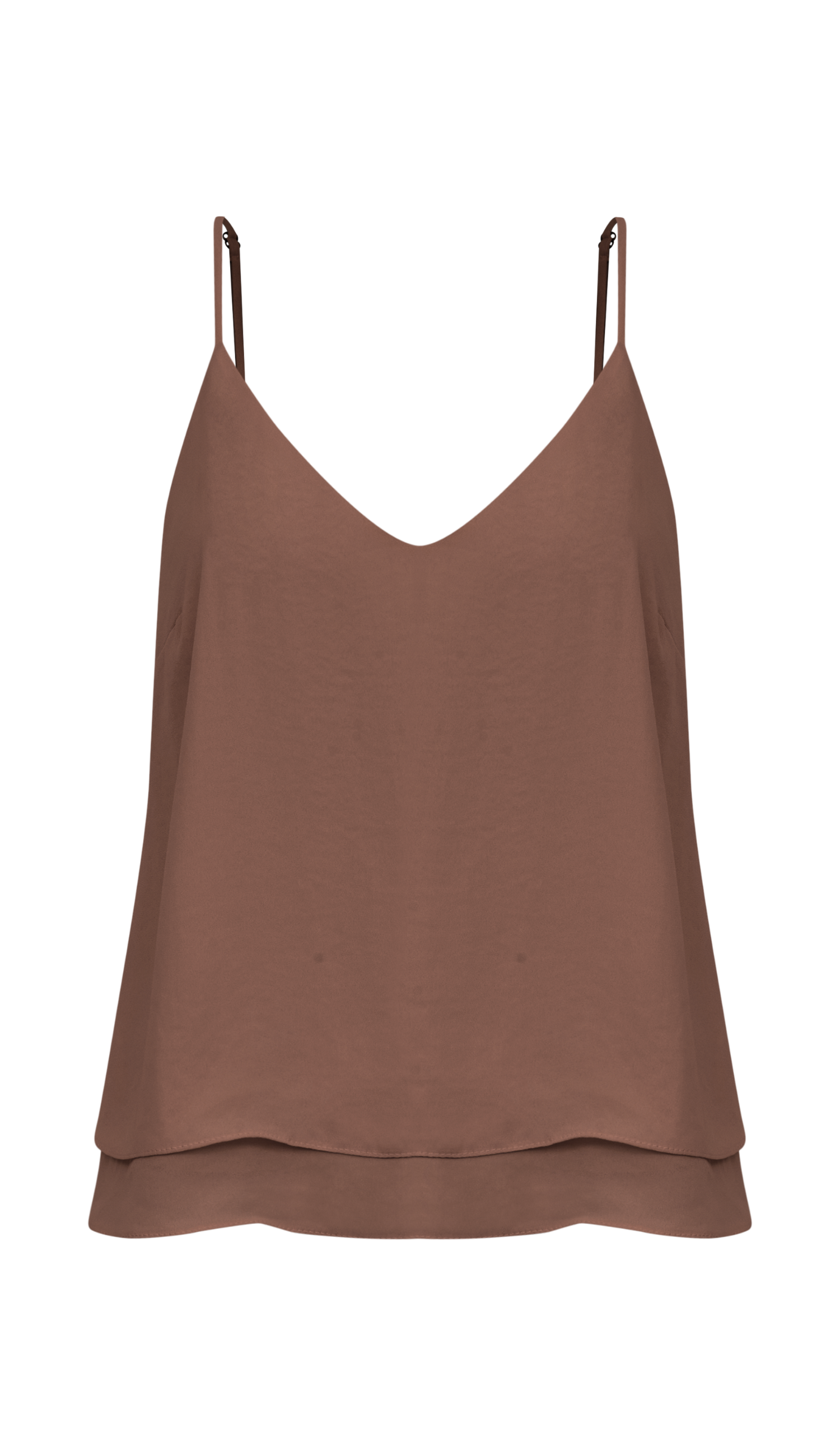 Regata confeccionada em crepe leve com sobreposição de tecidos, criando efeito de camadas. Possui modelagem soltinha, decote em V e alcinhas reguláveis.