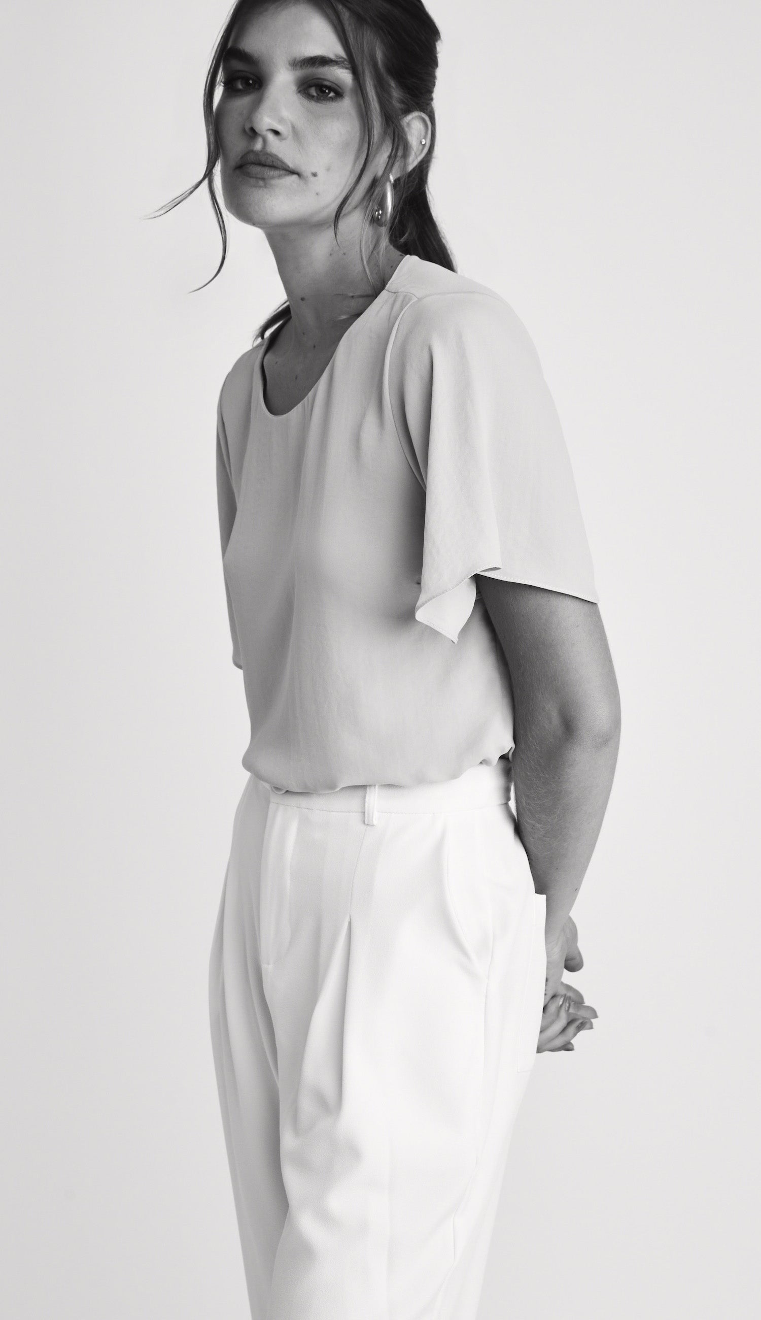 Blusa confeccionada em crepe leve. Possui tecido duplo na frente para não ficar transparente, modelagem soltinha, decote redondo e mangas curtas sino. A peça clássica e versátil que não pode faltar no seu guarda-roupa.