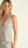 Blusa regata confeccionada em crepe de alfaiataria. Possui tecido duplo, modelagem ajustada, decote em V profundo, fechamento frontal por zíper de metal com pingente que tem a conchinha da Laguna gravada, pala abaixo do busto e recortes que modelam a peça.