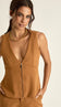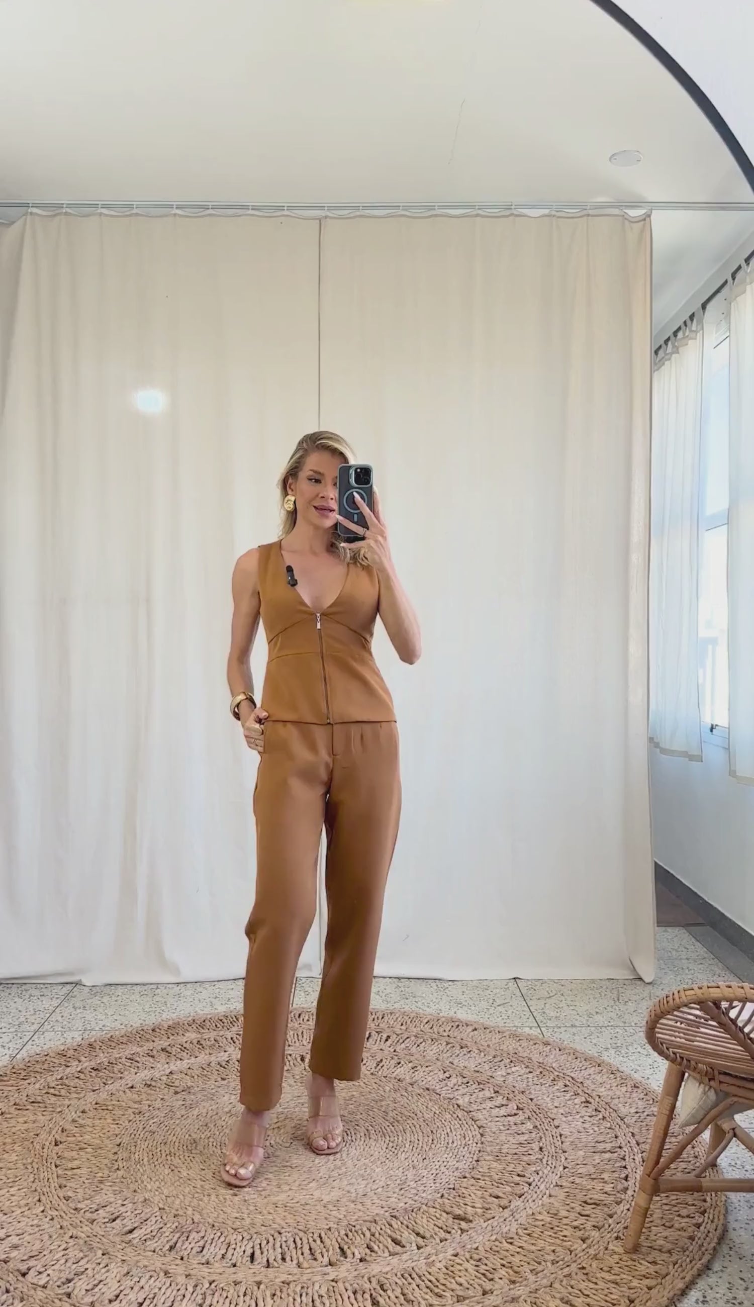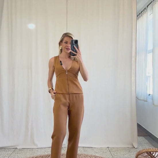 Blusa regata confeccionada em crepe de alfaiataria. Possui tecido duplo, modelagem ajustada, decote em V profundo, fechamento frontal por zíper de metal com pingente que tem a conchinha da Laguna gravada, pala abaixo do busto e recortes que modelam a peça.
