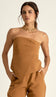 Blusa cropped confeccionada em crepe de alfaiataria com tecido duplo para não ficar transparente. Não possui mangas e conta com decote reto com silicone elástico interno para maior segurança, modelagem ajustada no busto e soltinha logo abaixo, detalhe de pregas laterais no busto que dão um volume sutil muito lindo; sobreposição de tecidos com barrado assimétrico na frente, lastex franzido nas costas para melhor ajuste ao corpo e fechamento traseiro por zíper de metal destacável com pingente em formato de conchinha.