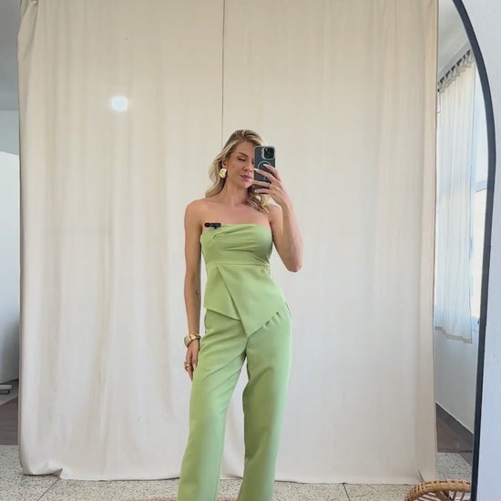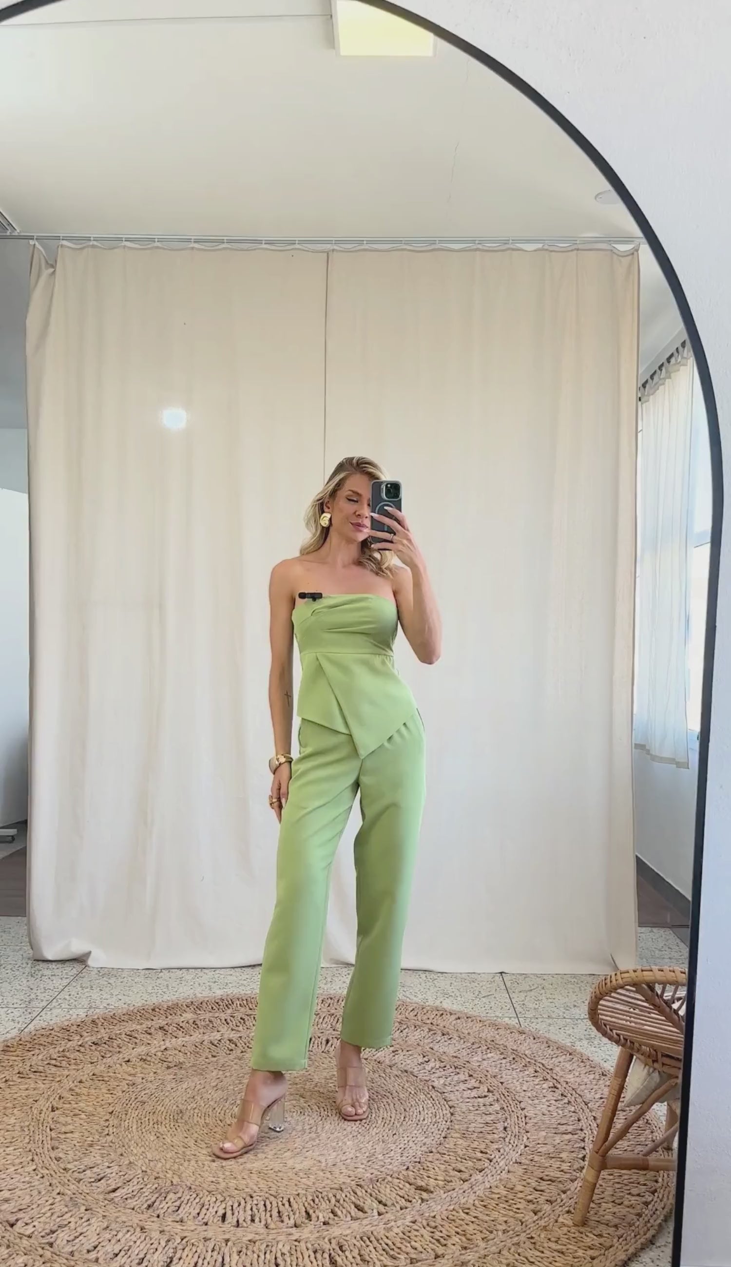 Blusa cropped confeccionada em crepe de alfaiataria com tecido duplo para não ficar transparente. Não possui mangas e conta com decote reto com silicone elástico interno para maior segurança, modelagem ajustada no busto e soltinha logo abaixo, detalhe de pregas laterais no busto que dão um volume sutil muito lindo; sobreposição de tecidos com barrado assimétrico na frente, lastex franzido nas costas para melhor ajuste ao corpo e fechamento traseiro por zíper de metal destacável com pingente em formato de conchinha.