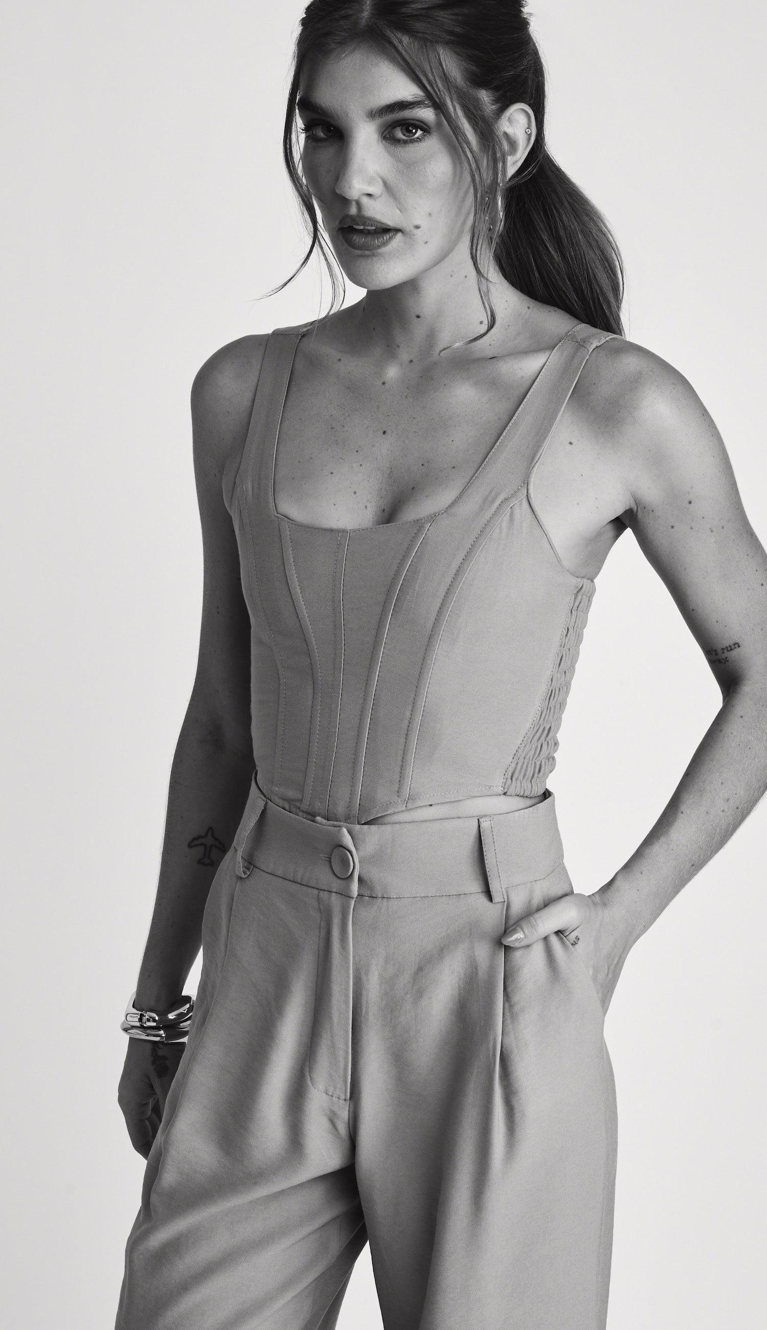 Top com forro, confeccionado em alfaiataria de poliviscose com aspecto levemente amassadinho. Possui decote quadrado, alças mais largas com reguladores de metal, lastex franzido nas costas, recortes com barbatanas no busto estilo corset e barra arredondada.