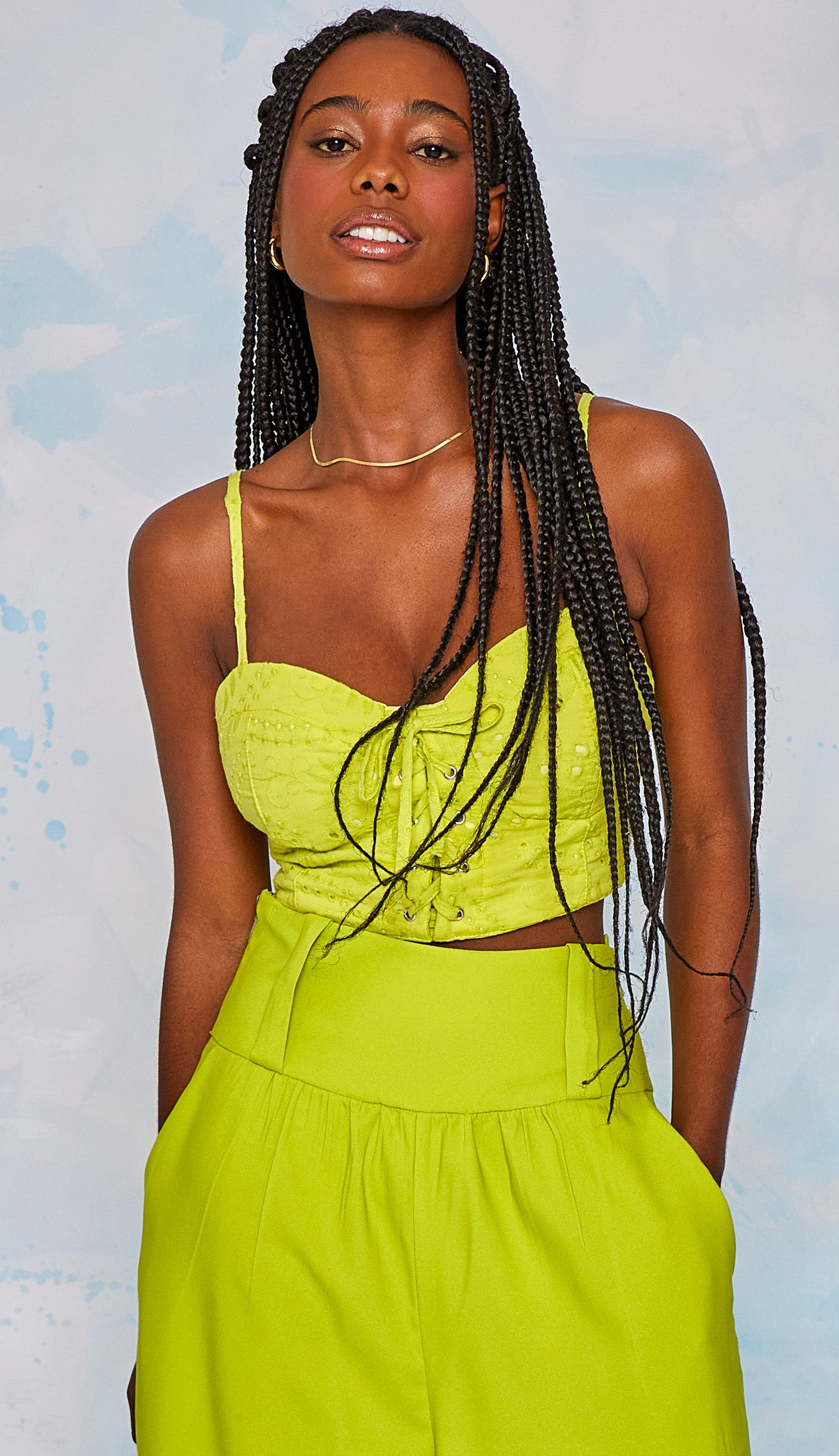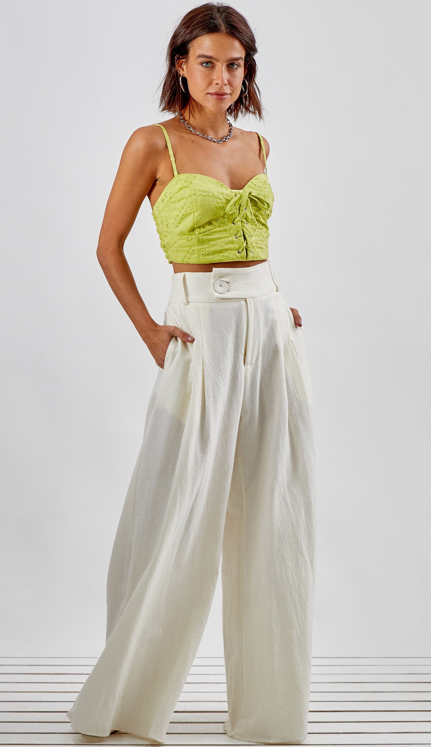 Cropped no estilo corset confeccionado em laise de algodão com forro. Possui decote coração com palas e recortes que modelam o busto, alcinhas reguláveis, lastex franzido nas costas para melhor ajuste ao corpo e detalhe frontal de ilhoses e tirinha cruzada para amarração.