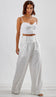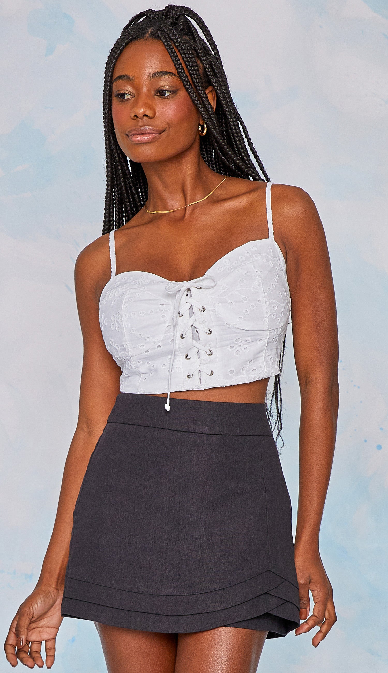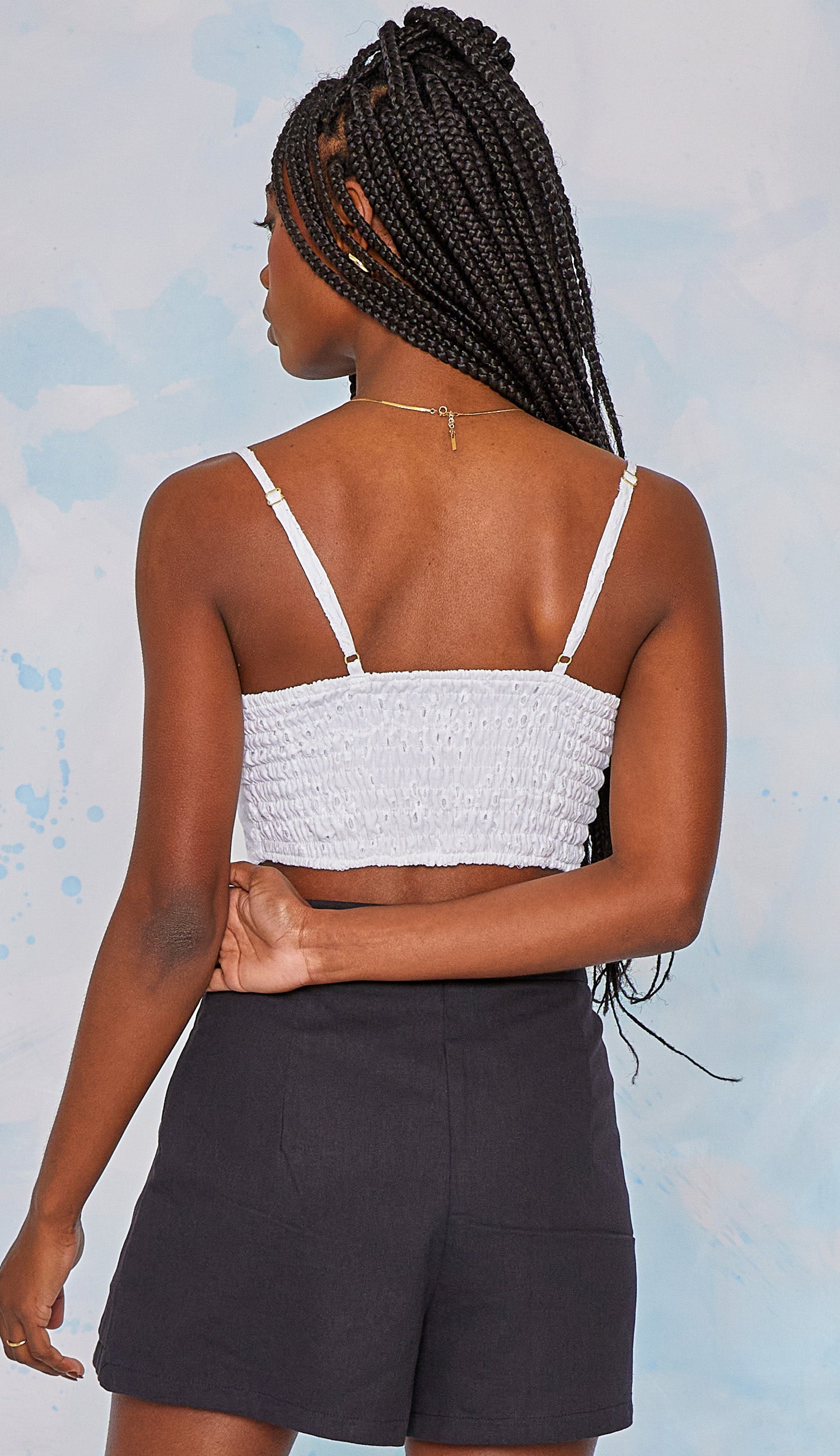 Cropped no estilo corset confeccionado em laise de algodão com forro. Possui decote coração com palas e recortes que modelam o busto, alcinhas reguláveis, lastex franzido nas costas para melhor ajuste ao corpo e detalhe frontal de ilhoses e tirinha cruzada para amarração.
