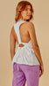 Regata confeccionada em crepe com tecido duplo para não ficar transparente. Possui modelagem soltinha, decote em V na frente e nadador nas costas com detalhe vazado, por onde passa uma faixa para amarração, ajustando a silhueta. Conta ainda com alças largas com detalhe franzidinho nos ombros e detalhe nas costas de tirinha embutida para ajuste e amarração.