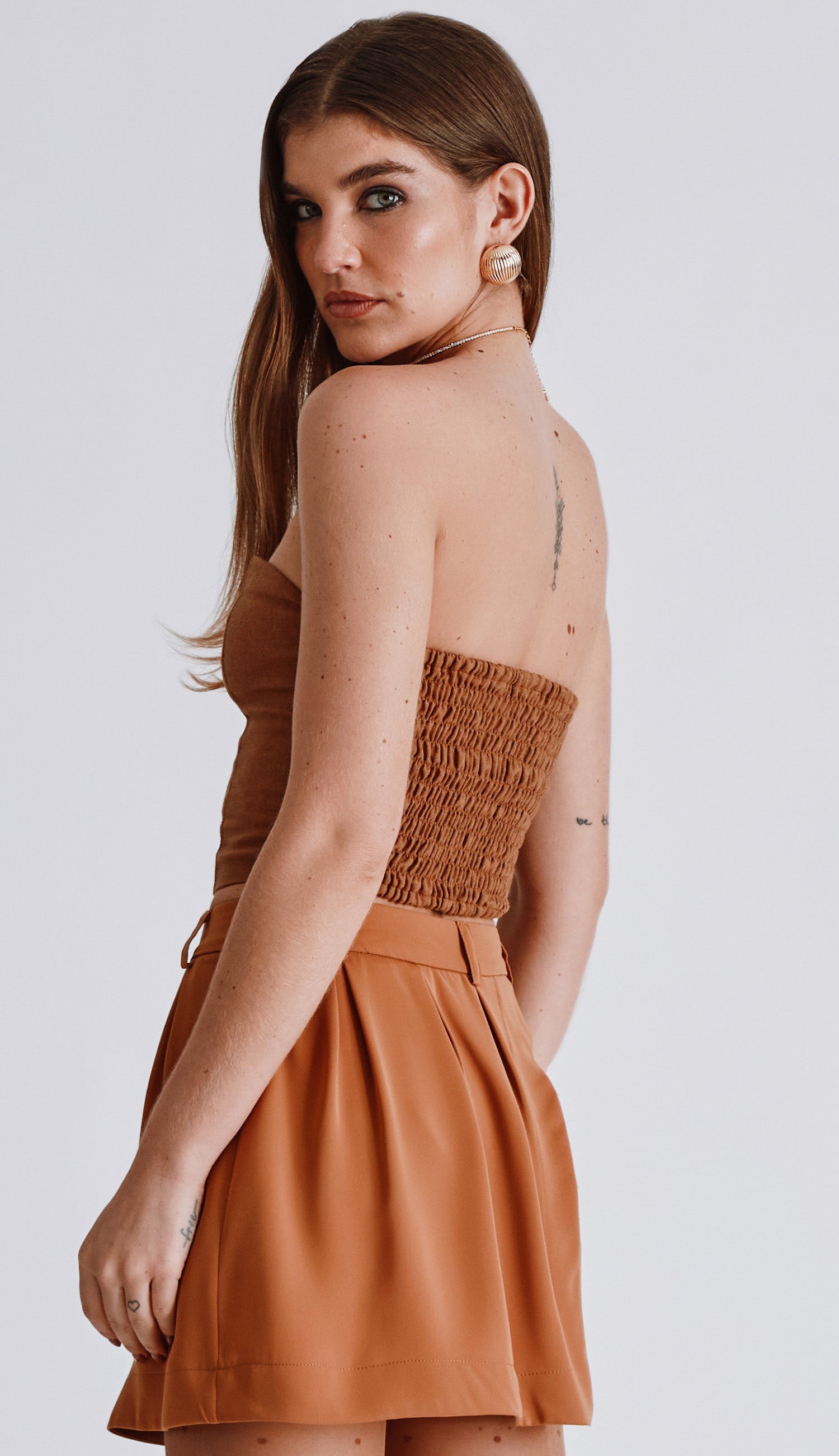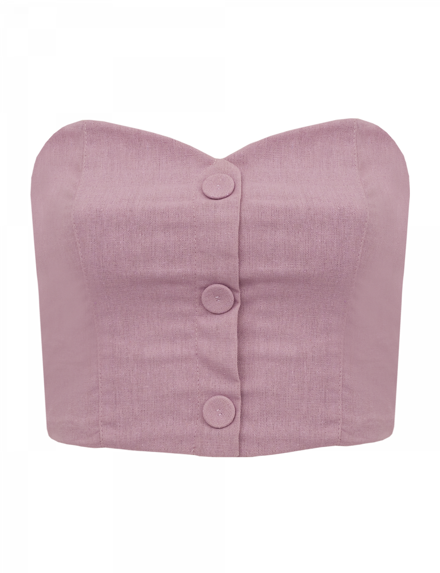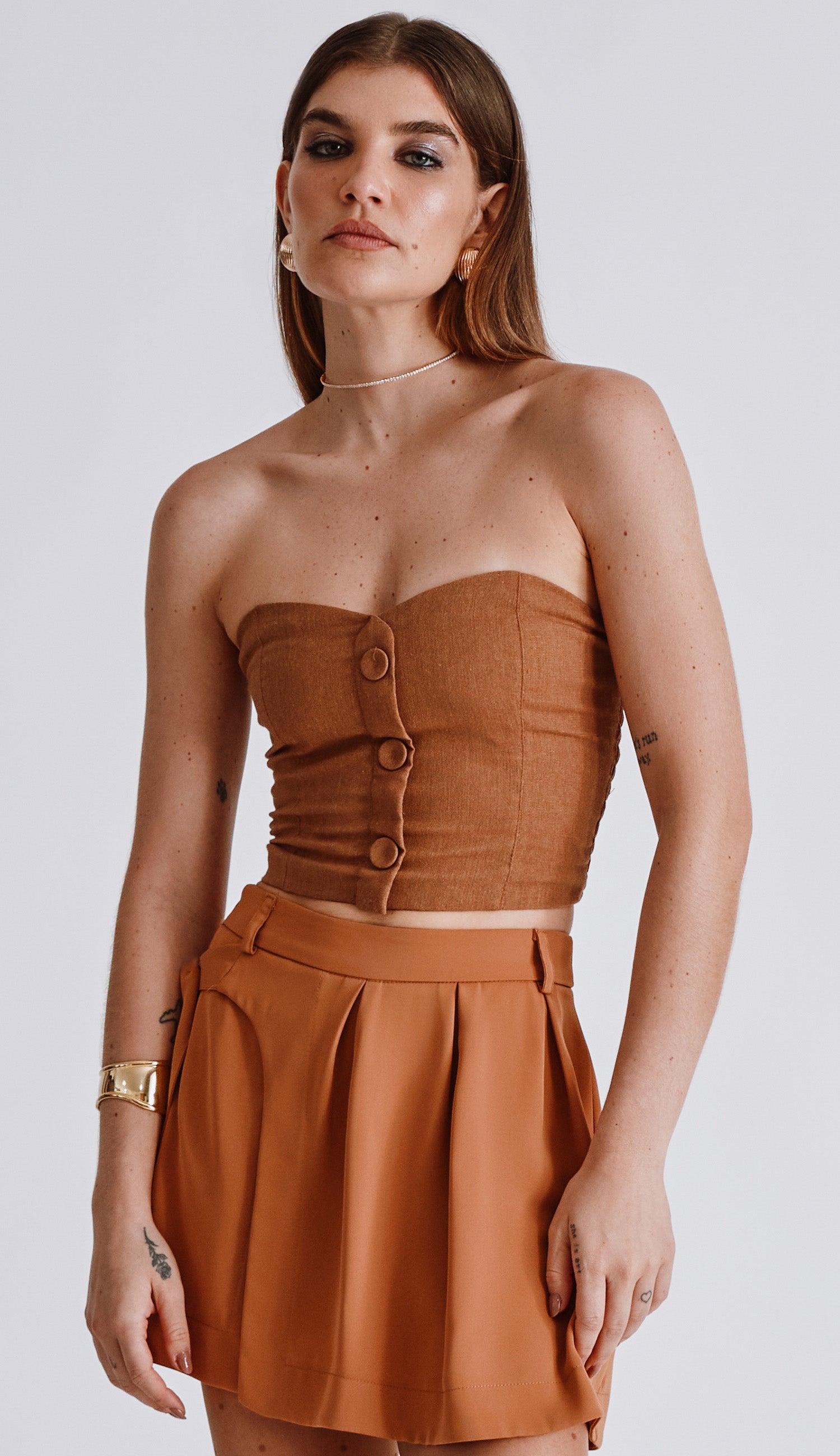 Cropped sem mangas confeccionado em linho com forro. Possui decote coração com silicone interno para dar sustentação, recortes que modelam o busto, botões de enfeite forrados que dão um charme à peça e costas em lastex franzido para melhor ajuste ao corpo.