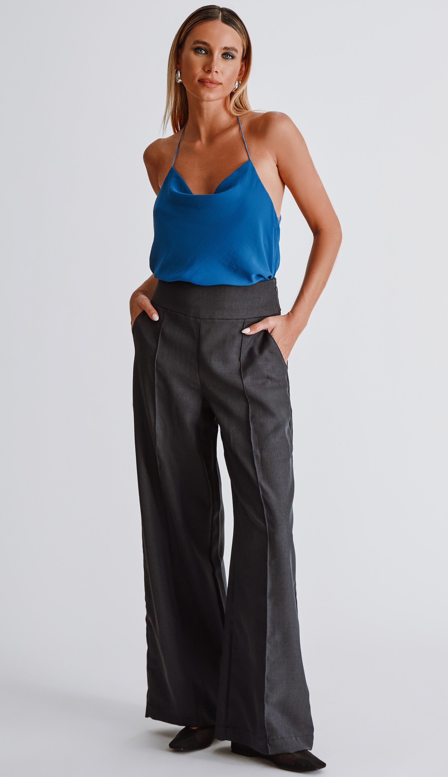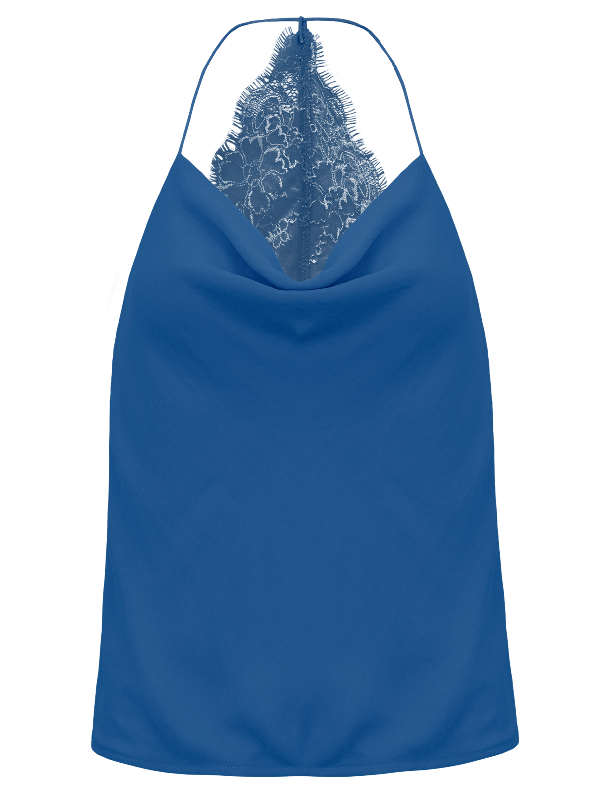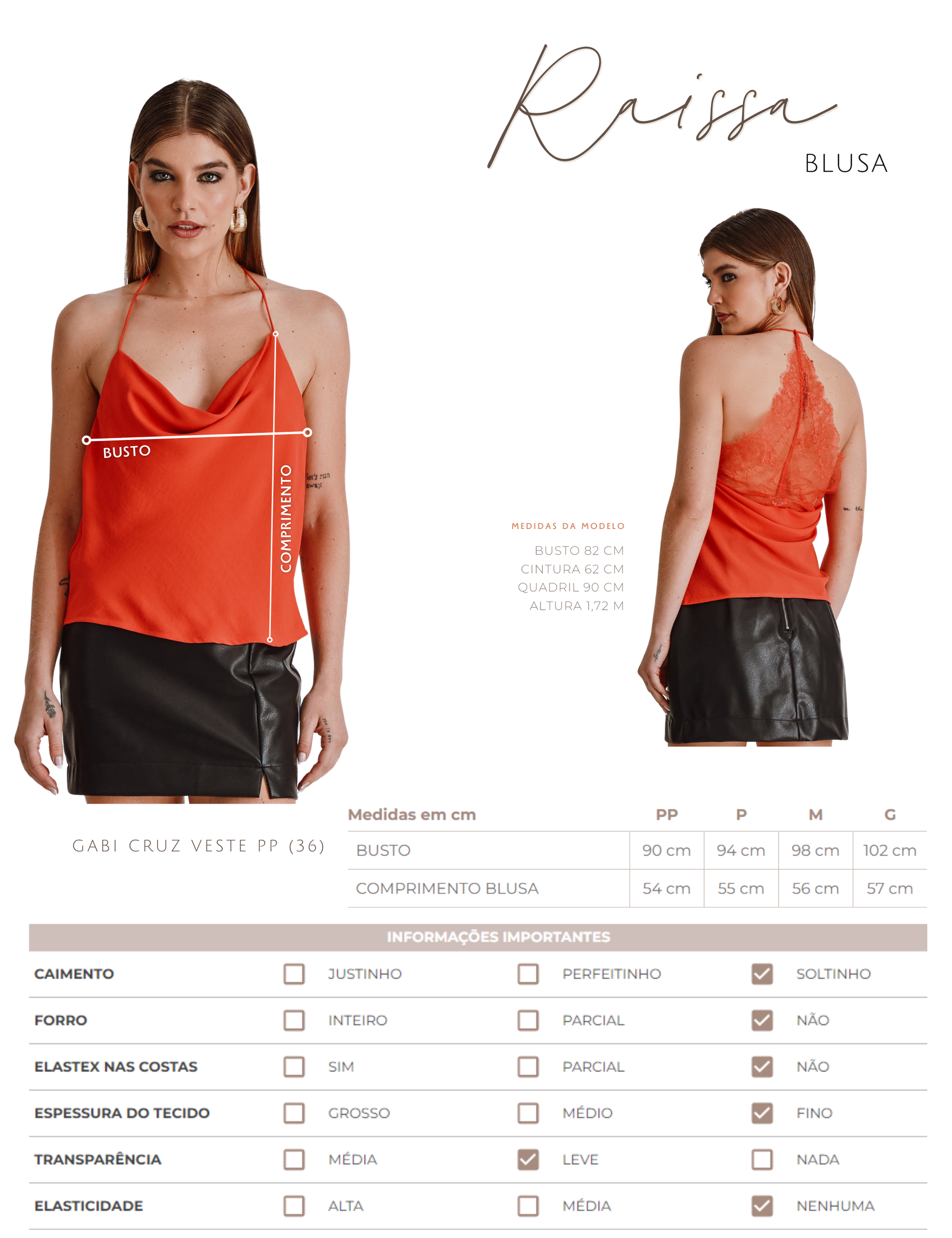 Regata confeccionada em crepe. Possui modelagem frente única com elástico fino de alça, tecido duplo na frente para não ficar transparente, elástico fino interno em toda as costas e abaixo do busto para maior sustentação, decote degagê e detalhe de renda nas costas.