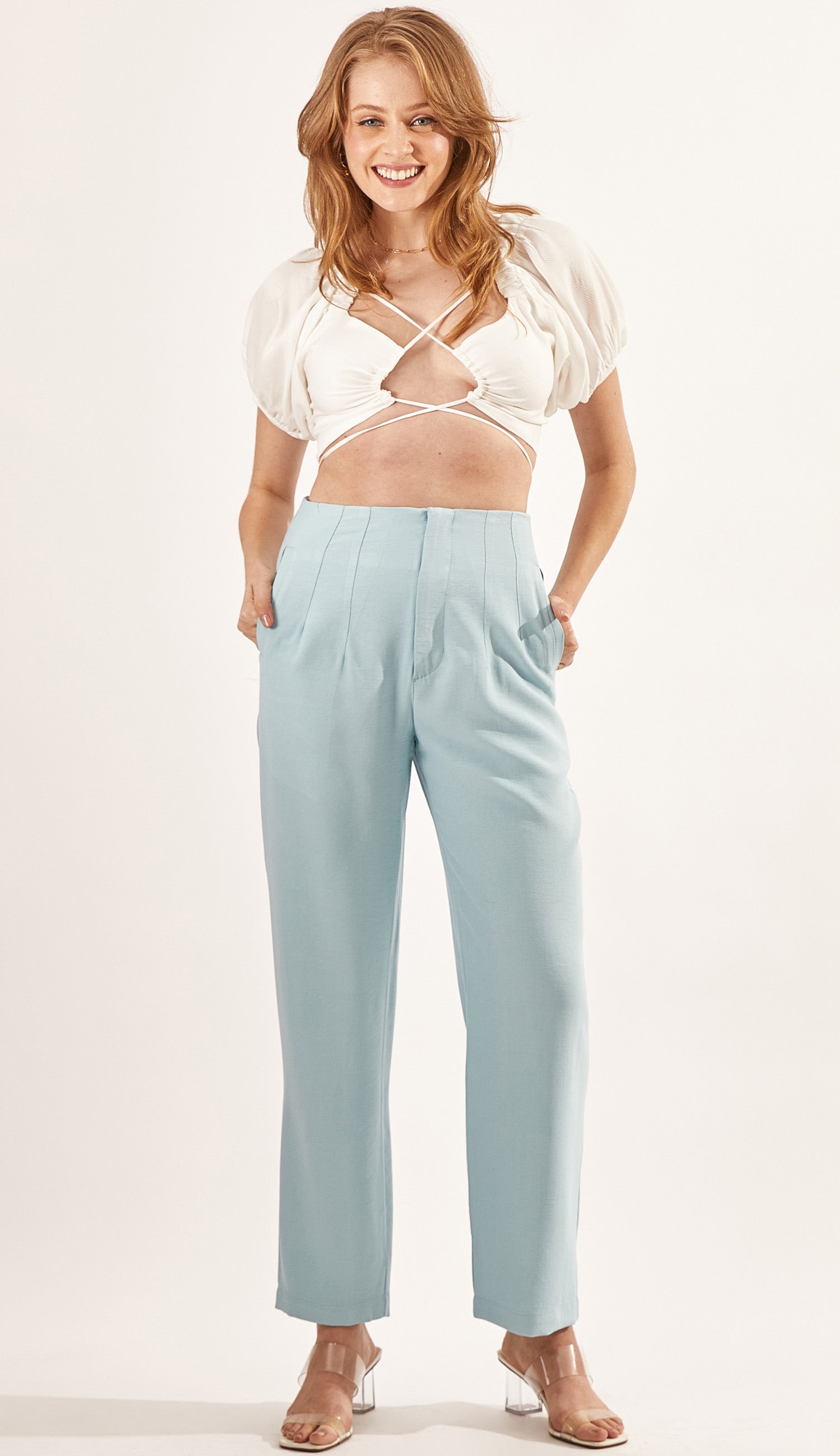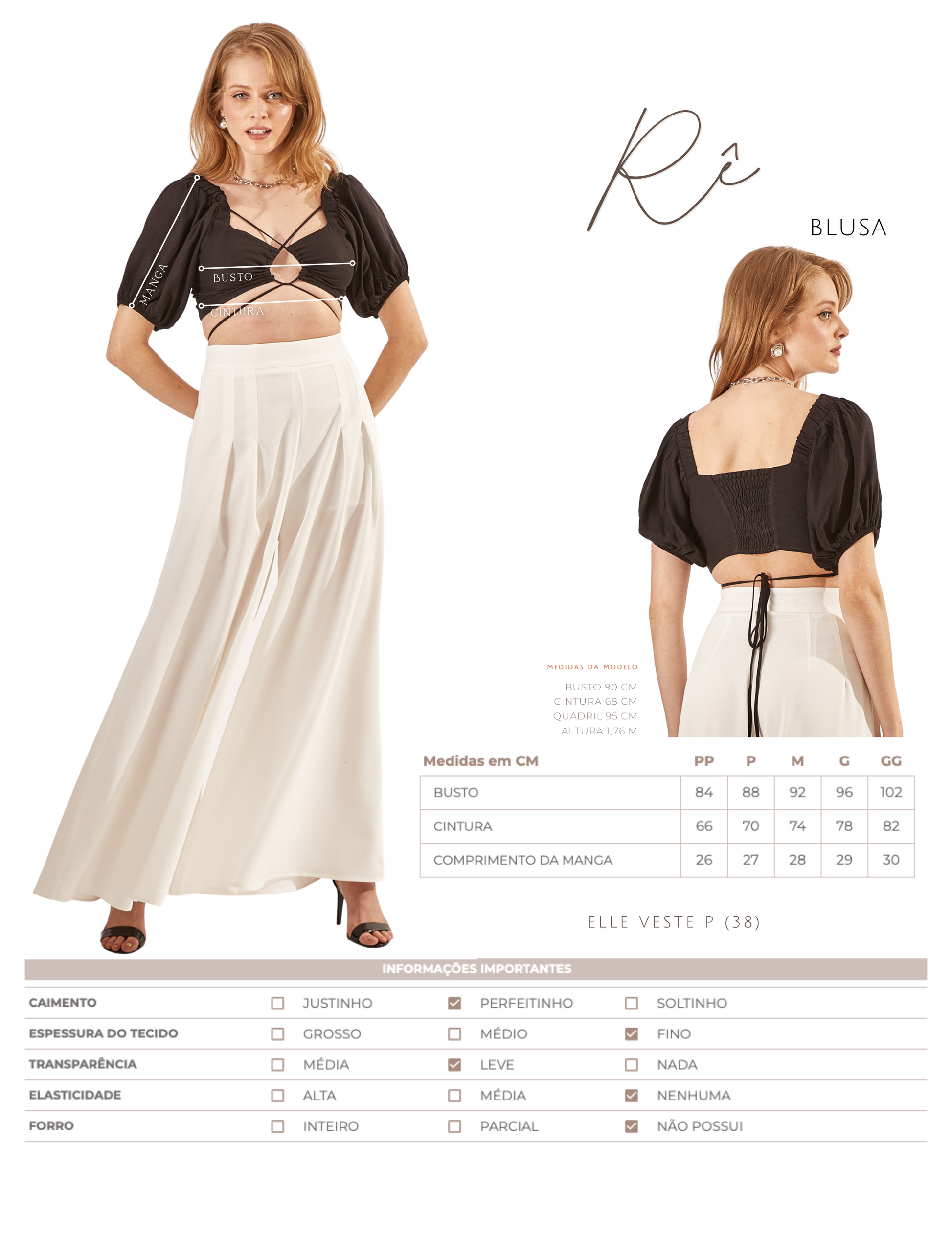 Crropped confeccionado em jacquard de viscose maquinetado. Possui decote princesa, busto aberto no centro com tirinhas fixas embutidas para ajuste e amarração, elástico mais grosso nos ombros e mais fino nos punhos, mangas curtas bufantes e lastex franzido nas costas para melhor ajuste ao corpo.
