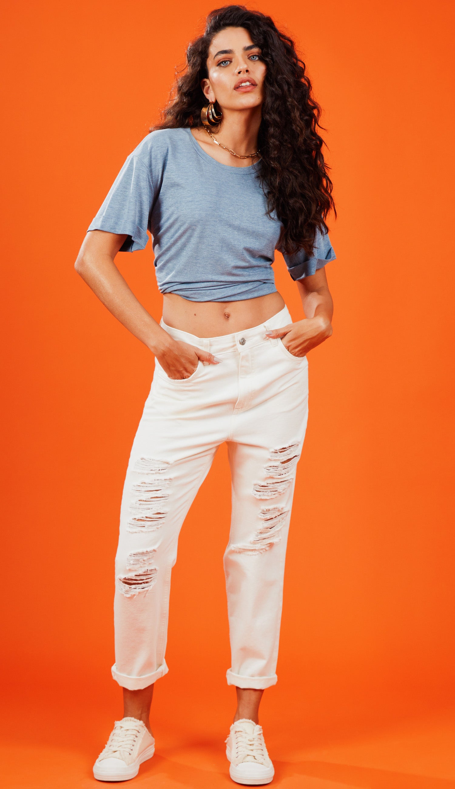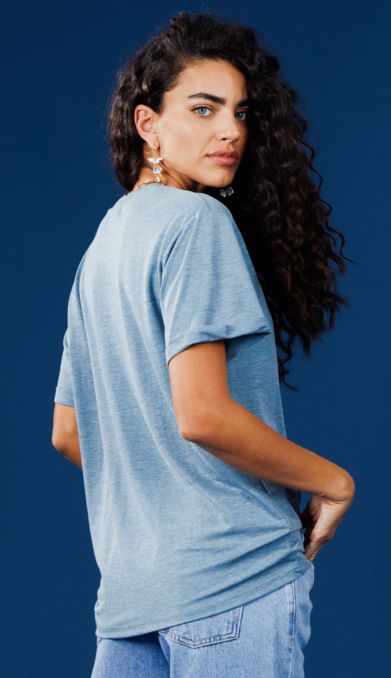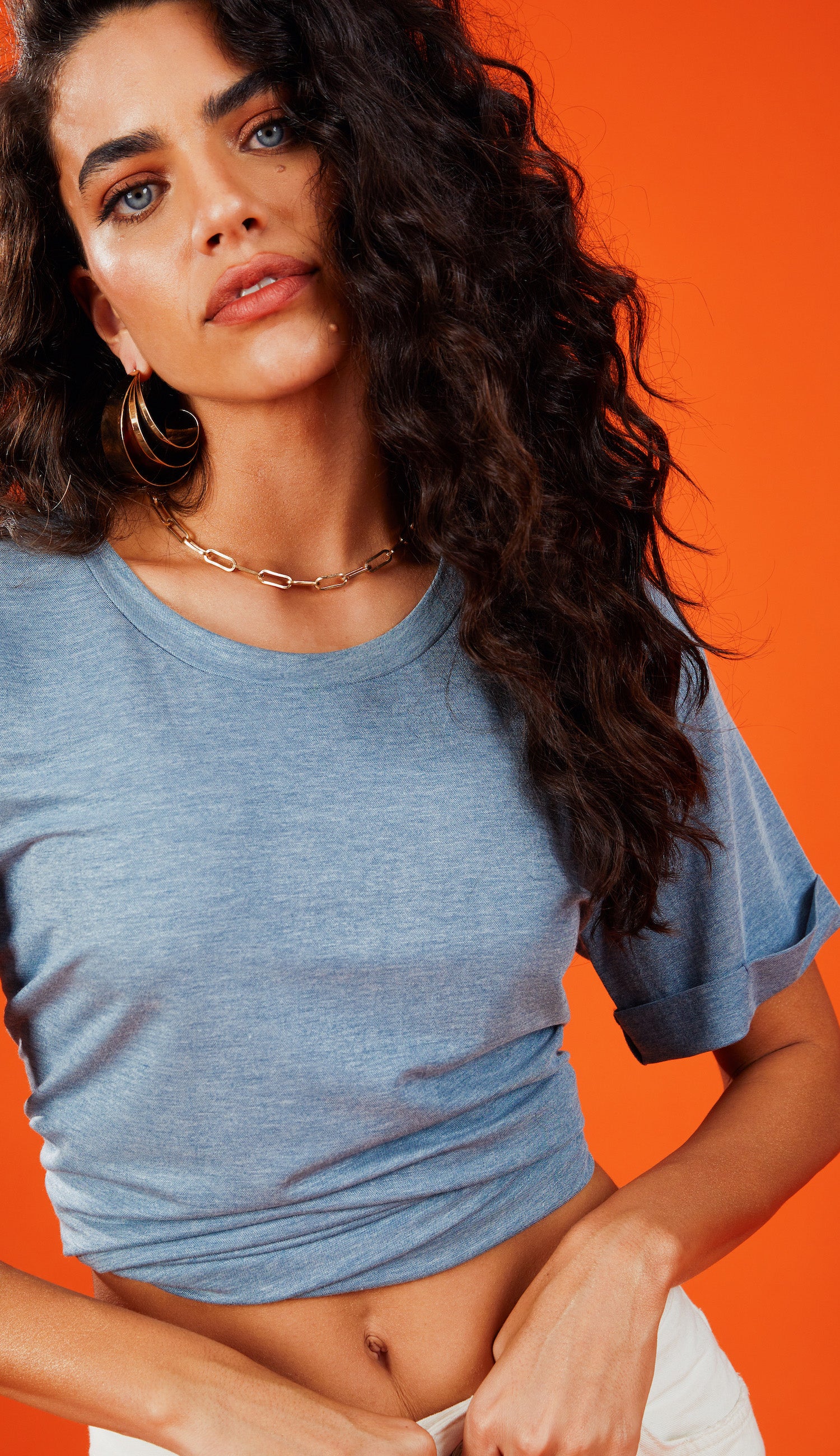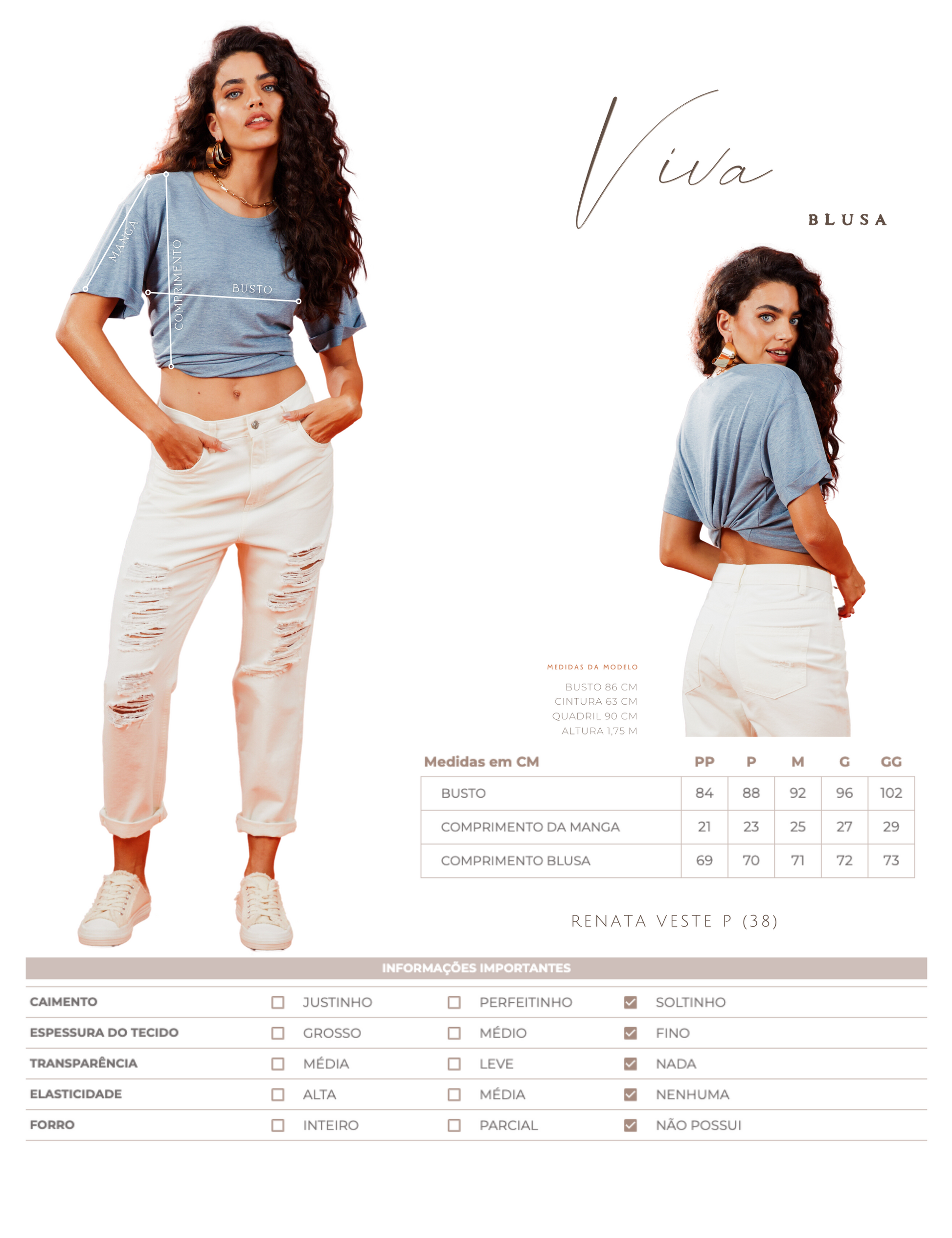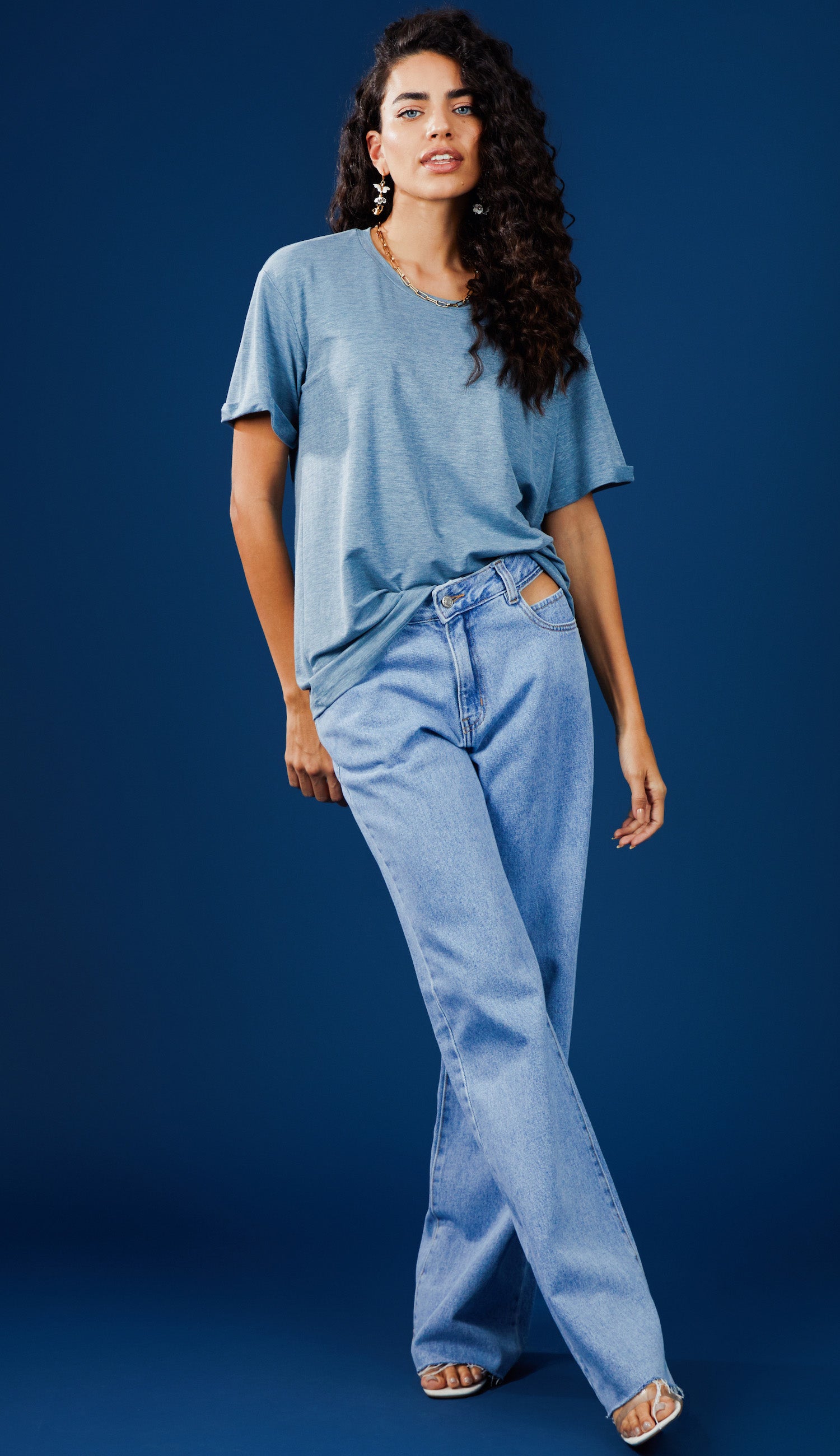 Blusa confeccionada em malha de poliviscose com aspecto rajado. Possui modelagem ampla e alongada, que permite maior versatilidade da peça, podendo ser usada de várias formas: solta, com nó por dentro da calça, etc. Conta ainda com gola redonda e mangas curtas dobradas. Com seu tecido macio e confortável, essa é a "camisetinha básica" que combina com tudo.