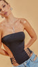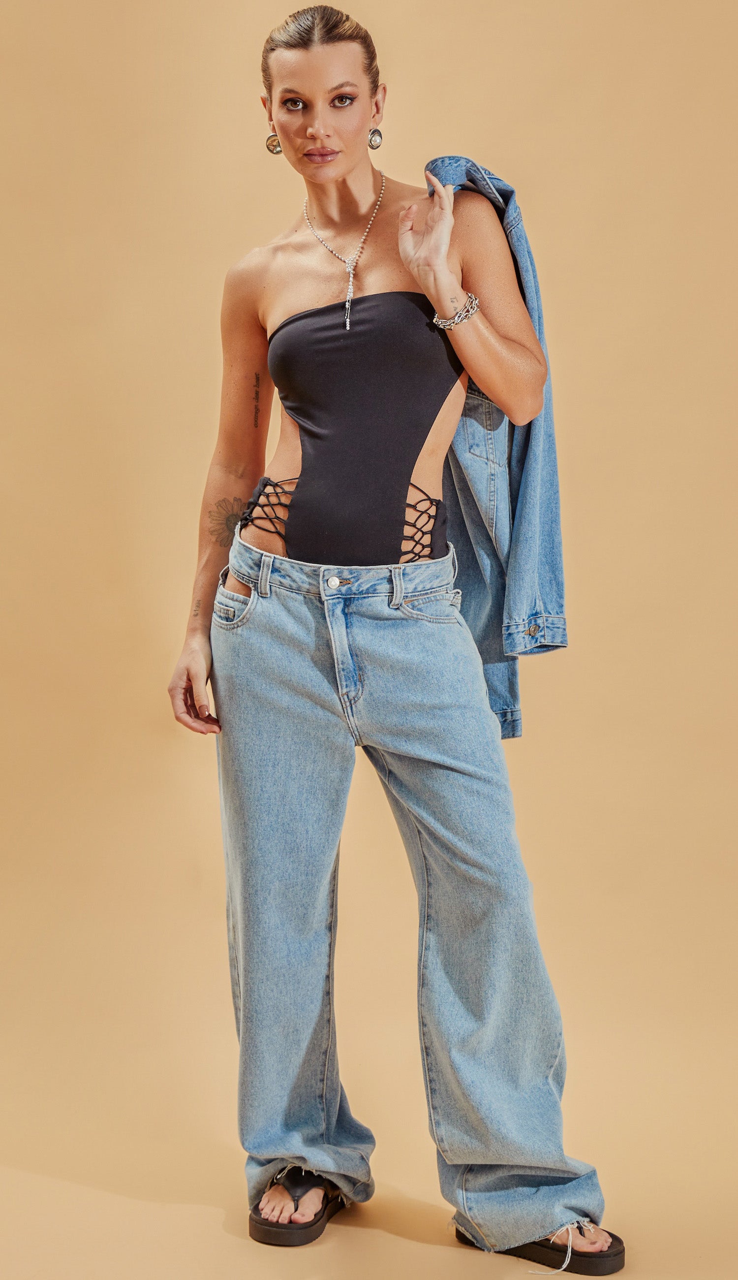 Body confeccionado em malha. Não possui mangas e conta com decote reto; elástico interno no decote para maior sustentação; recortes vazados nas laterais e nas costas, deixando toda a região da cintura à mostra; elástico forrado nas costas com fechamento por fecho de metal; detalhe frontal nas laterais de elásticos finos transpassados e fechamento no gancho por fecho de sutiã.