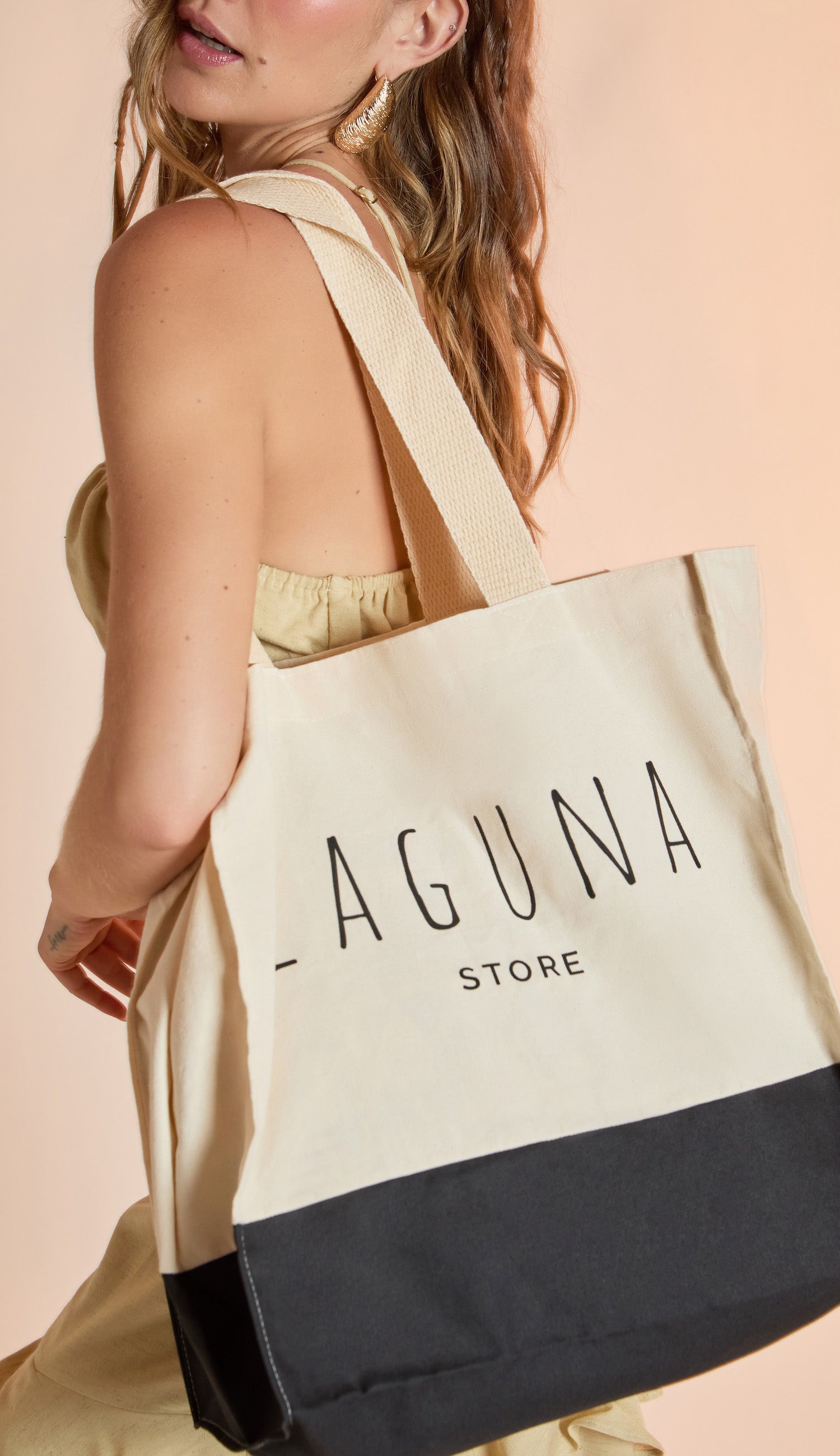Ecobag confeccionada em algodão cru com recorte bicolor. Possui o tamanho ideal para te acompanhar por onde você for! Seja na praia, no trabalho ou em algum passeio informal. Possui a estampa da nossa concha e do nosso logo, pra quem tem orgulho de ser uma #LagunaLover. Faça lindas composições com seus looks Laguna!