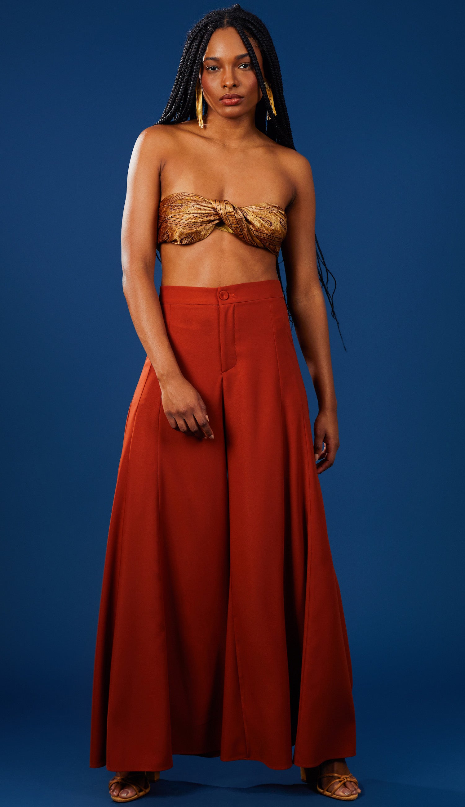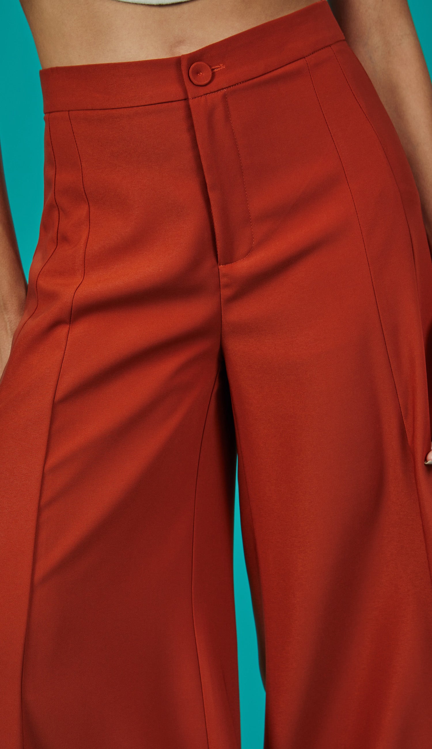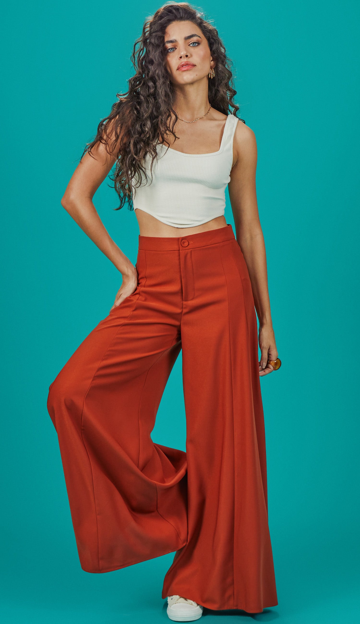 Calça pantalona confeccionada em crepe de alfaiataria com forro. Possui riscas frontais que vão do cós até a barra, deixando a peça mais ampla e a silhueta alongada e o fechamento frontal é por zíper comum e botão forrado.
