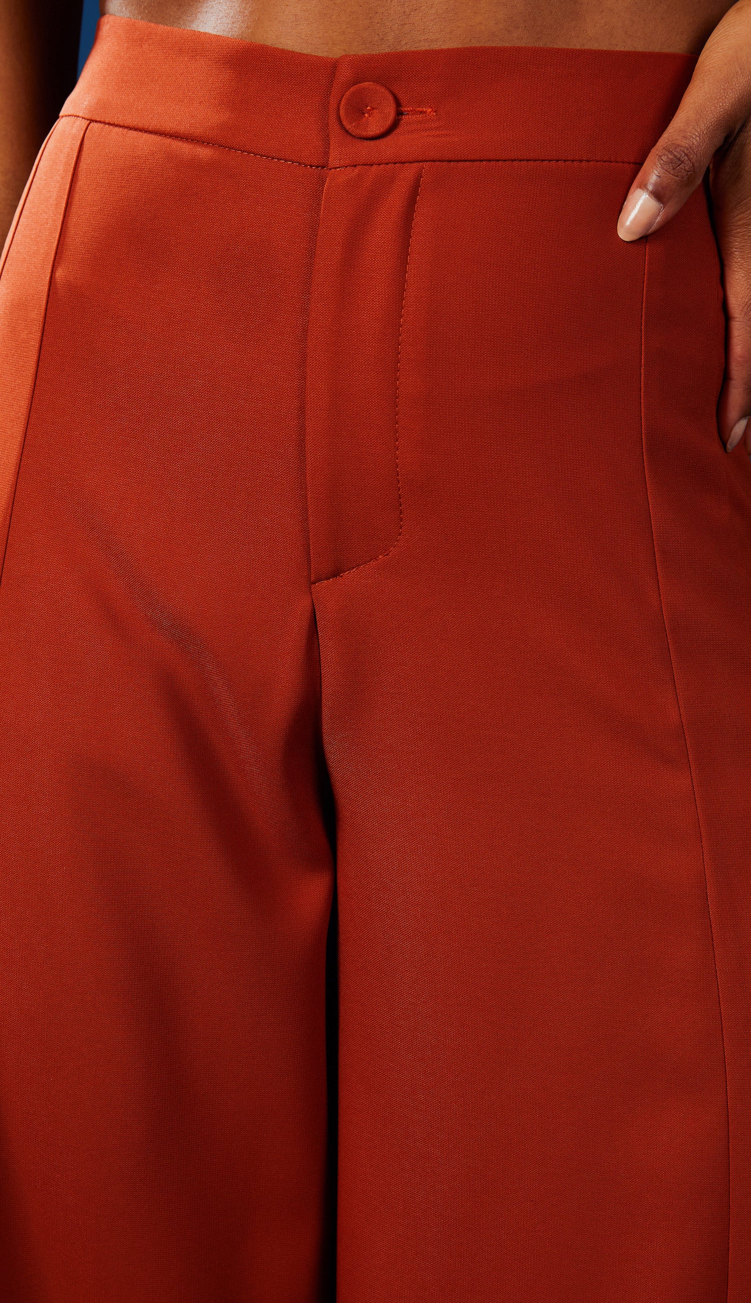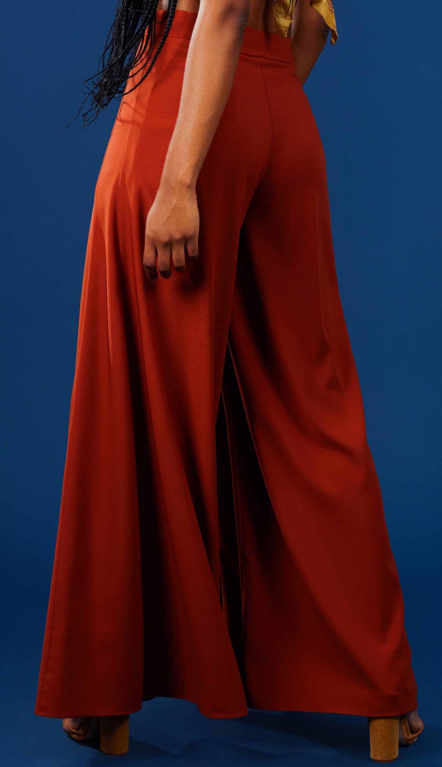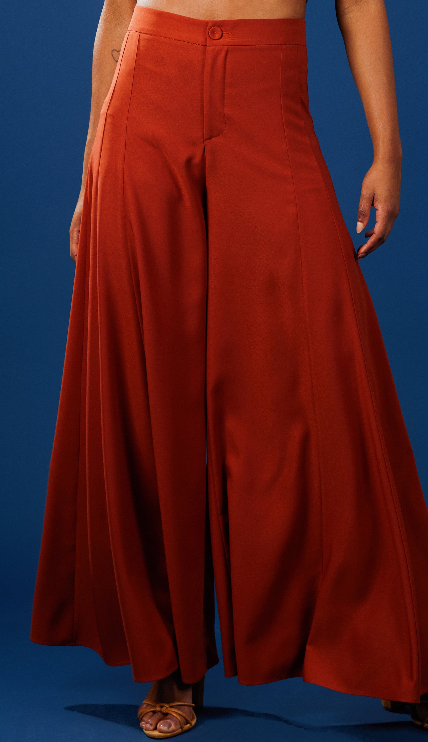 Calça pantalona confeccionada em crepe de alfaiataria com forro. Possui riscas frontais que vão do cós até a barra, deixando a peça mais ampla e a silhueta alongada e o fechamento frontal é por zíper comum e botão forrado.