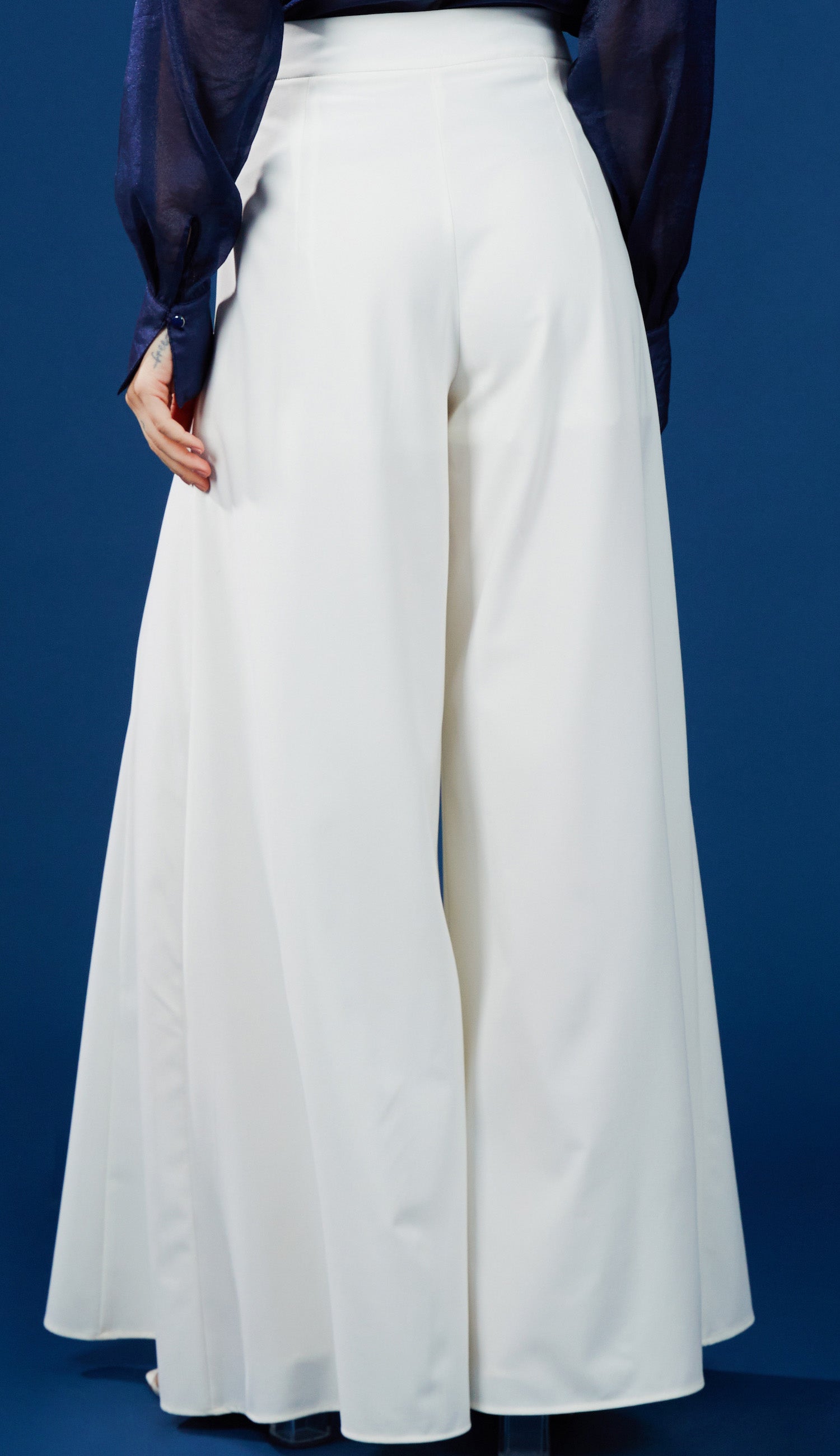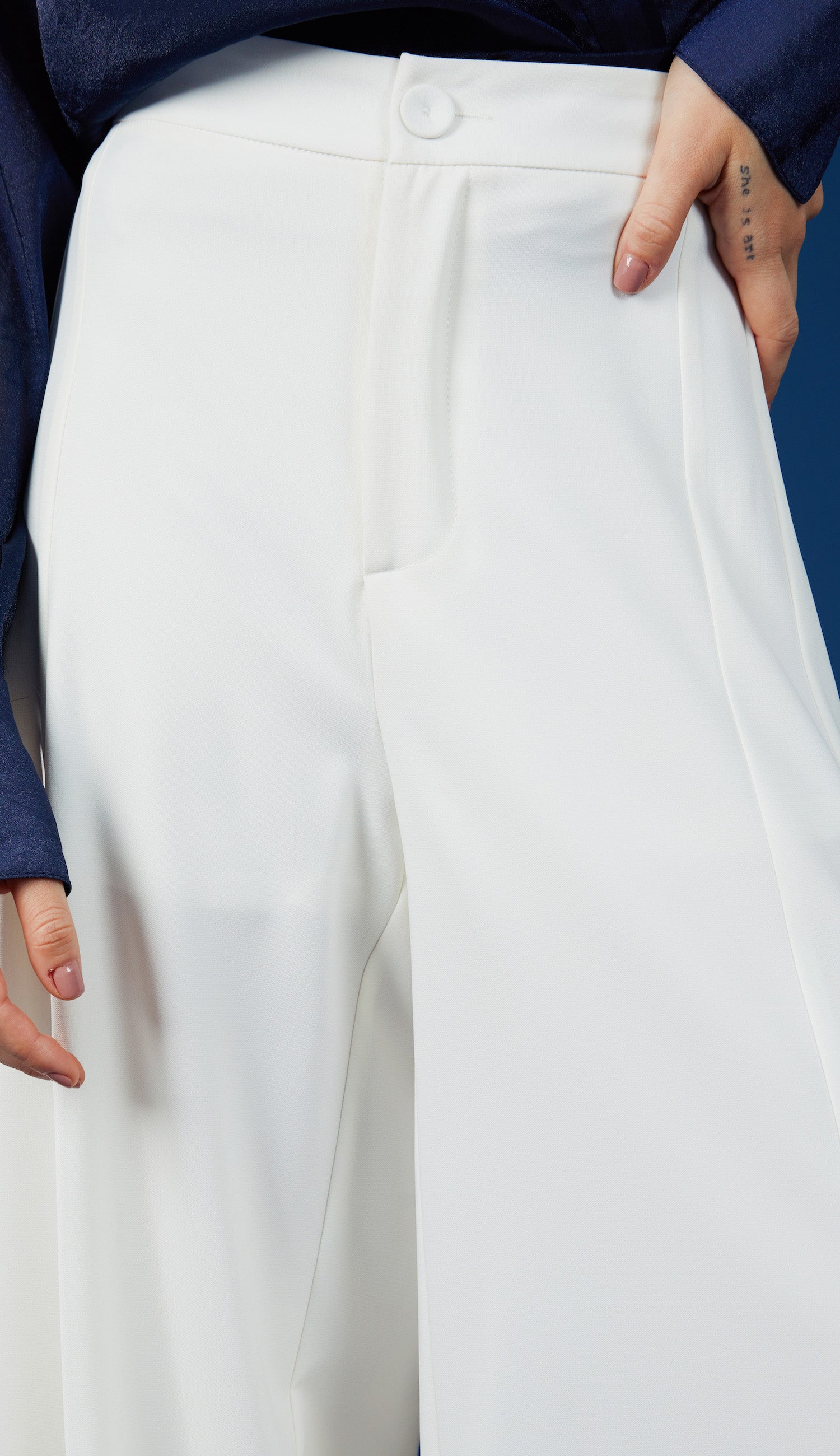 Calça pantalona confeccionada em crepe de alfaiataria com forro. Possui riscas frontais que vão do cós até a barra, deixando a peça mais ampla e a silhueta alongada e o fechamento frontal é por zíper comum e botão forrado.