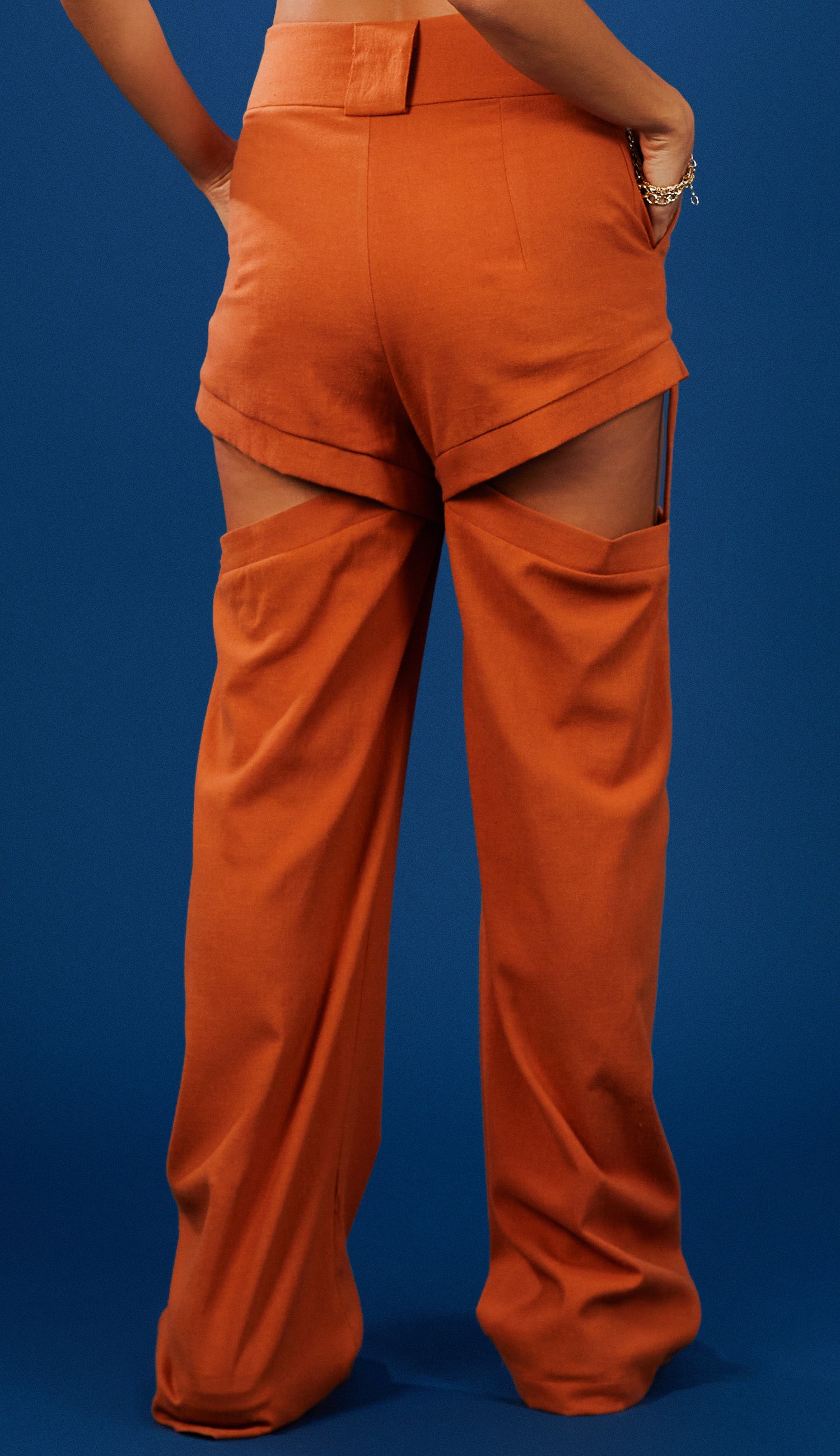 Calça reta confeccionada em linho com forro. Possui fechamento frontal por zíper e botão forrado, passantes no cós, bolsos laterais, recorte vazado na perna presa por tirinha fixa. A peça perfeita para criar looks modernos e estilosos, até mesmo no dia a dia.