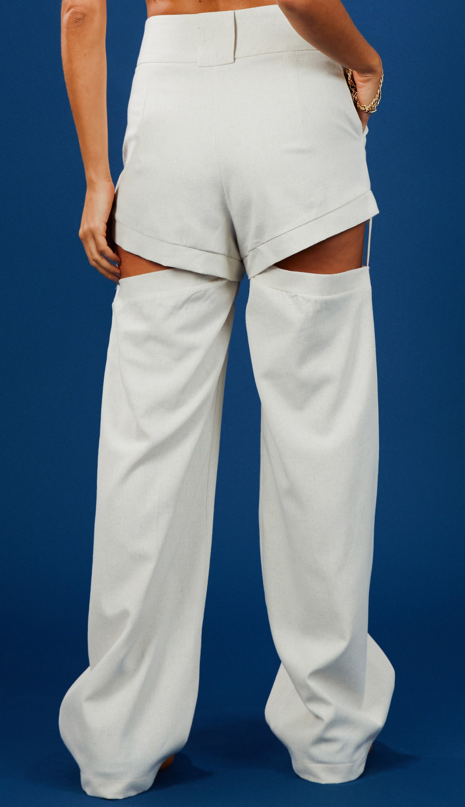 Calça reta confeccionada em linho com forro. Possui fechamento frontal por zíper e botão forrado, passantes no cós, bolsos laterais, recorte vazado na perna presa por tirinha fixa. A peça perfeita para criar looks modernos e estilosos, até mesmo no dia a dia.