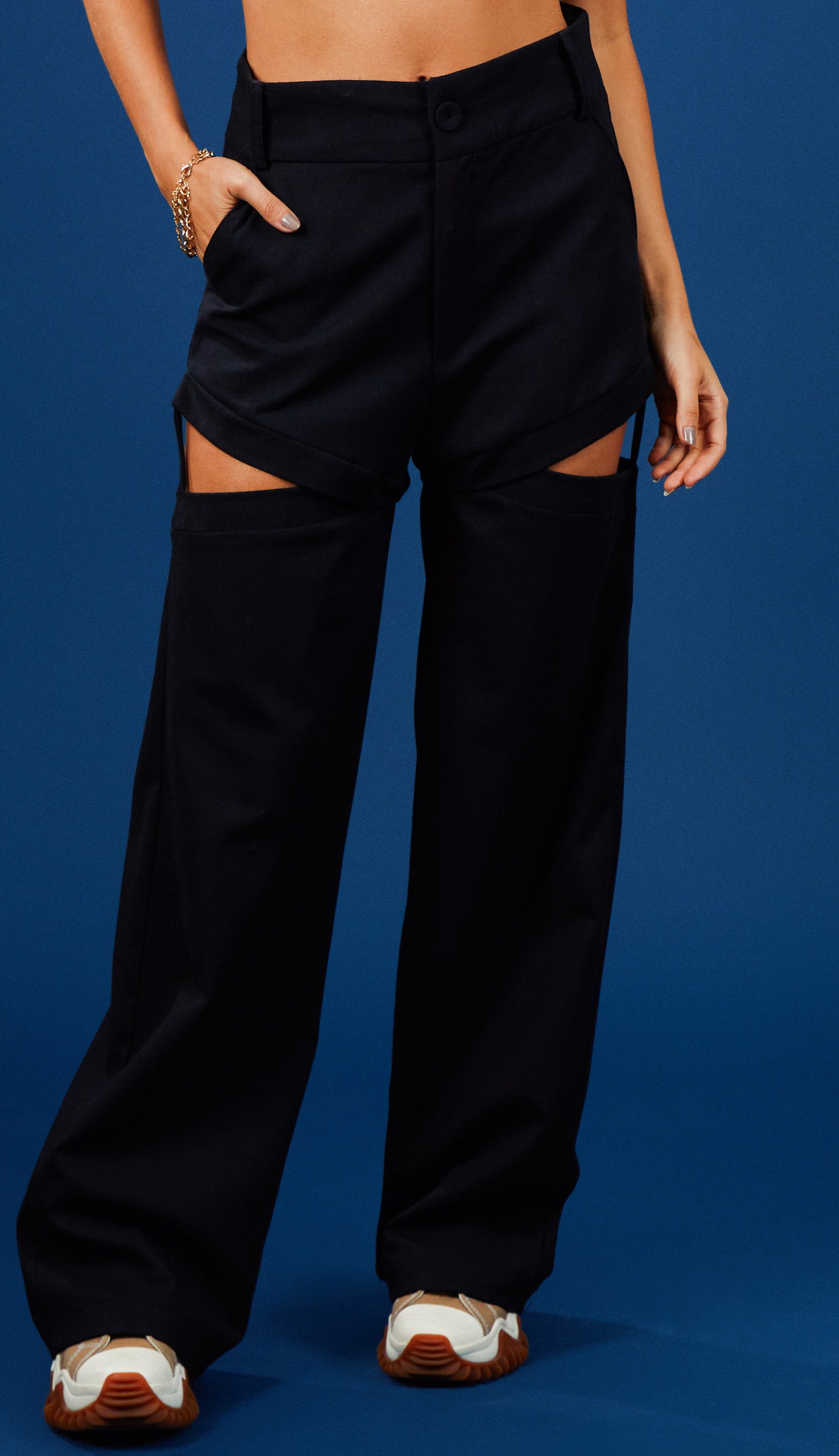Calça reta confeccionada em linho com forro. Possui fechamento frontal por zíper e botão forrado, passantes no cós, bolsos laterais, recorte vazado na perna presa por tirinha fixa. A peça perfeita para criar looks modernos e estilosos, até mesmo no dia a dia.