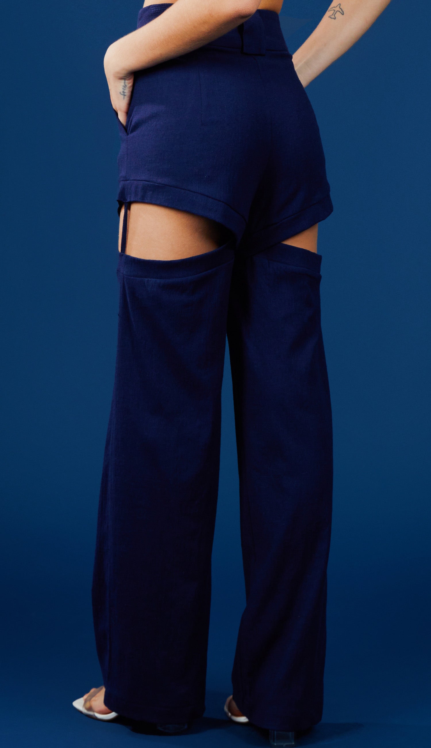 Calça reta confeccionada em linho com forro. Possui fechamento frontal por zíper e botão forrado, passantes no cós, bolsos laterais, recorte vazado na perna presa por tirinha fixa. A peça perfeita para criar looks modernos e estilosos, até mesmo no dia a dia.