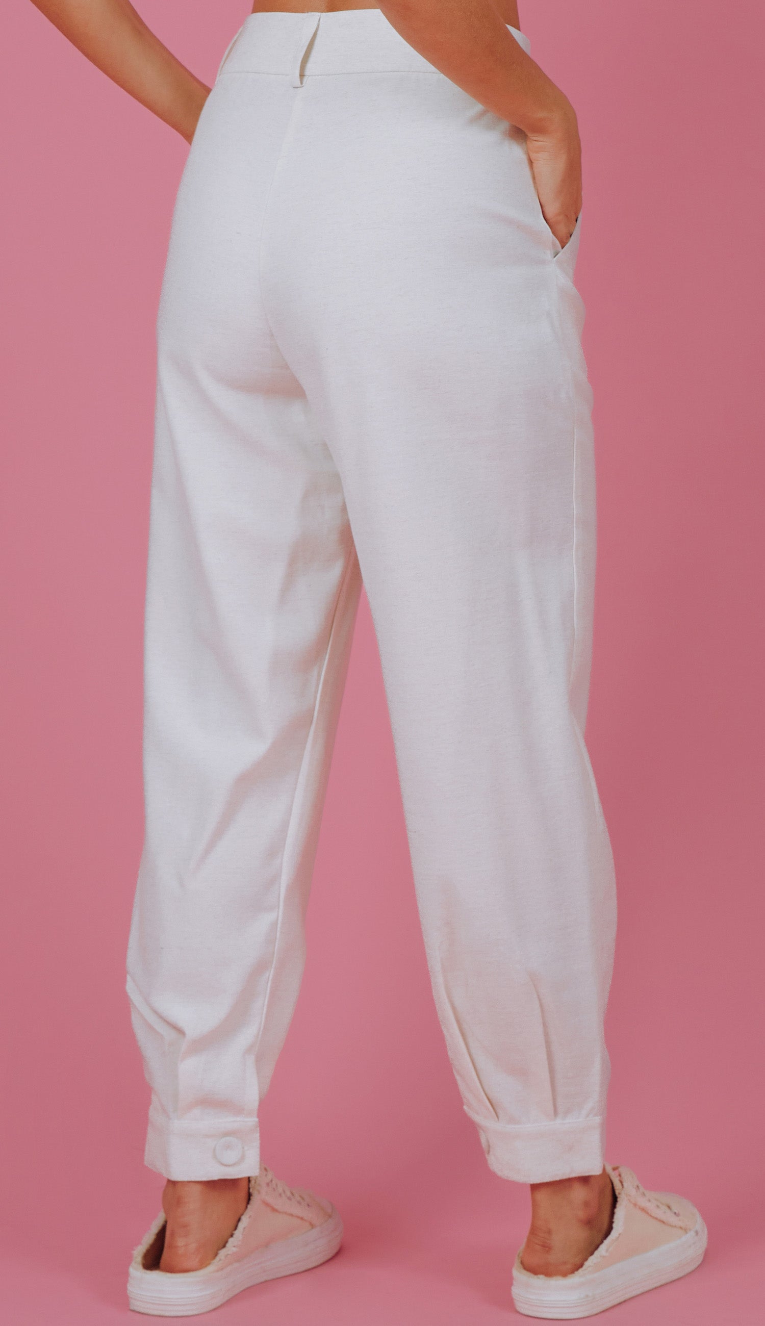 Calça confeccionada em linho com modelagem clássica de alfaiataria. Possui pregas no cós e na barra, bolsos laterais, passantes e fechamento frontal por zíper e botão forrado. Peça bem versátil que pode ser usada para compor looks mais formais ou despojados.