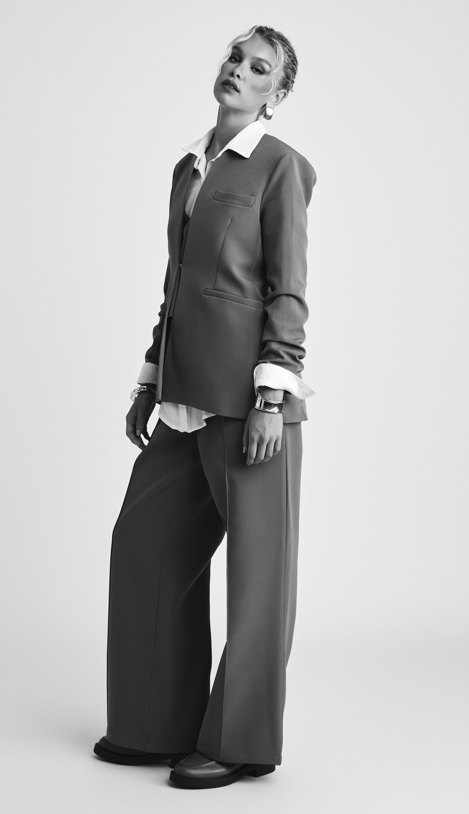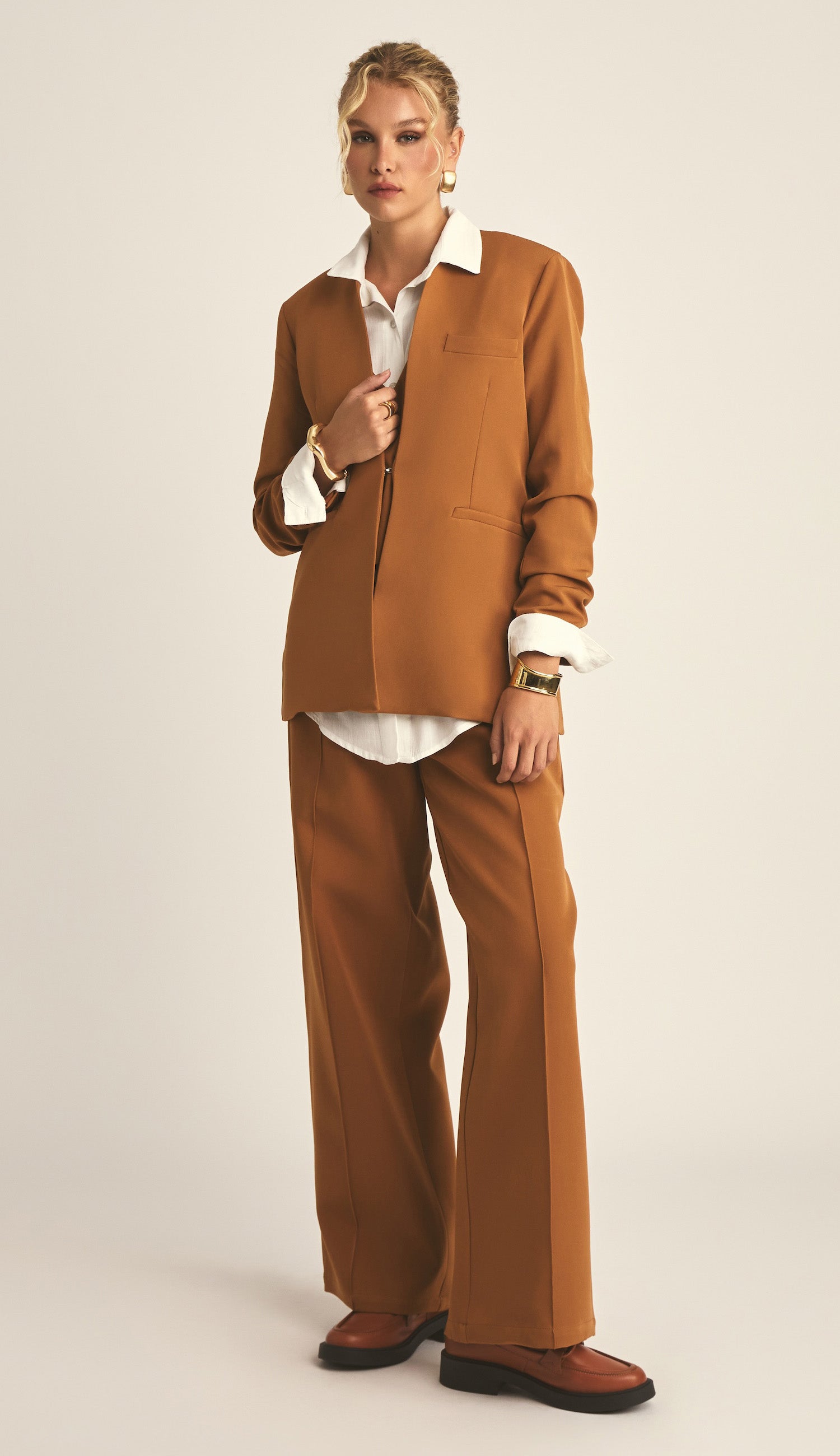 Calça confeccionada em crepe de alfaiataria. Possui modelagem reta, clássica de alfaiataria; vincos frontais nas pernas e elástico franzido no cós com recorte e pala na parte frontal dele. Peça clássica, atemporal e versátil que combina com todo tipo de look.