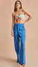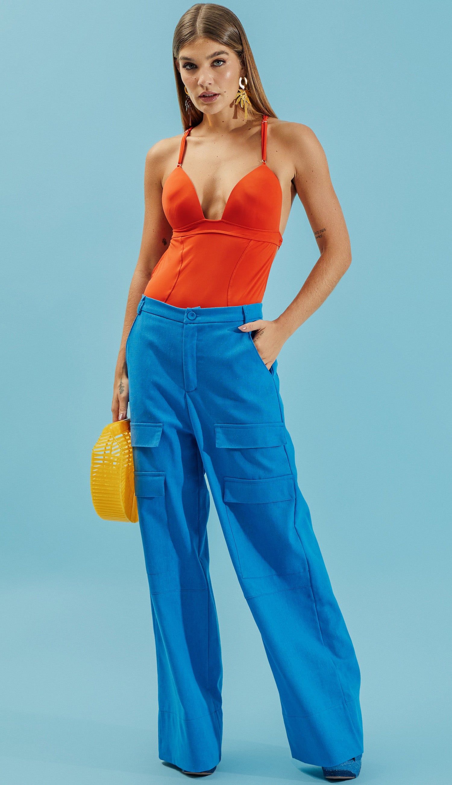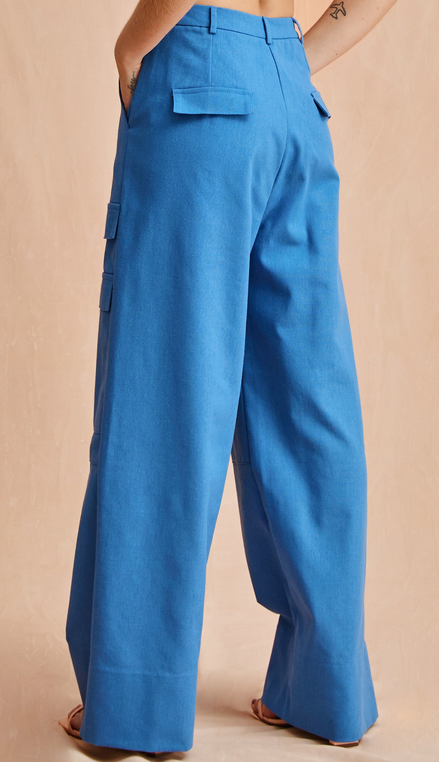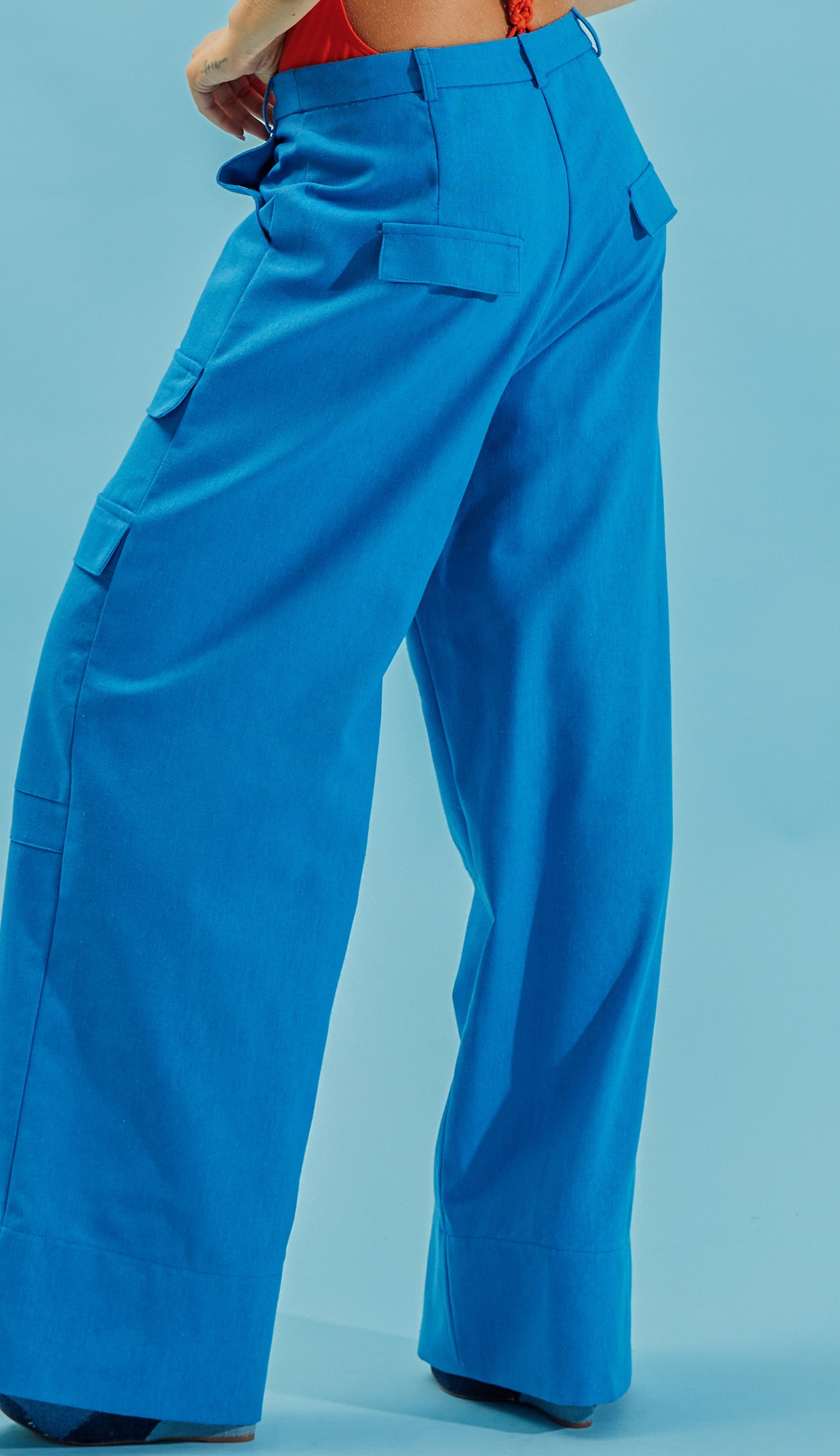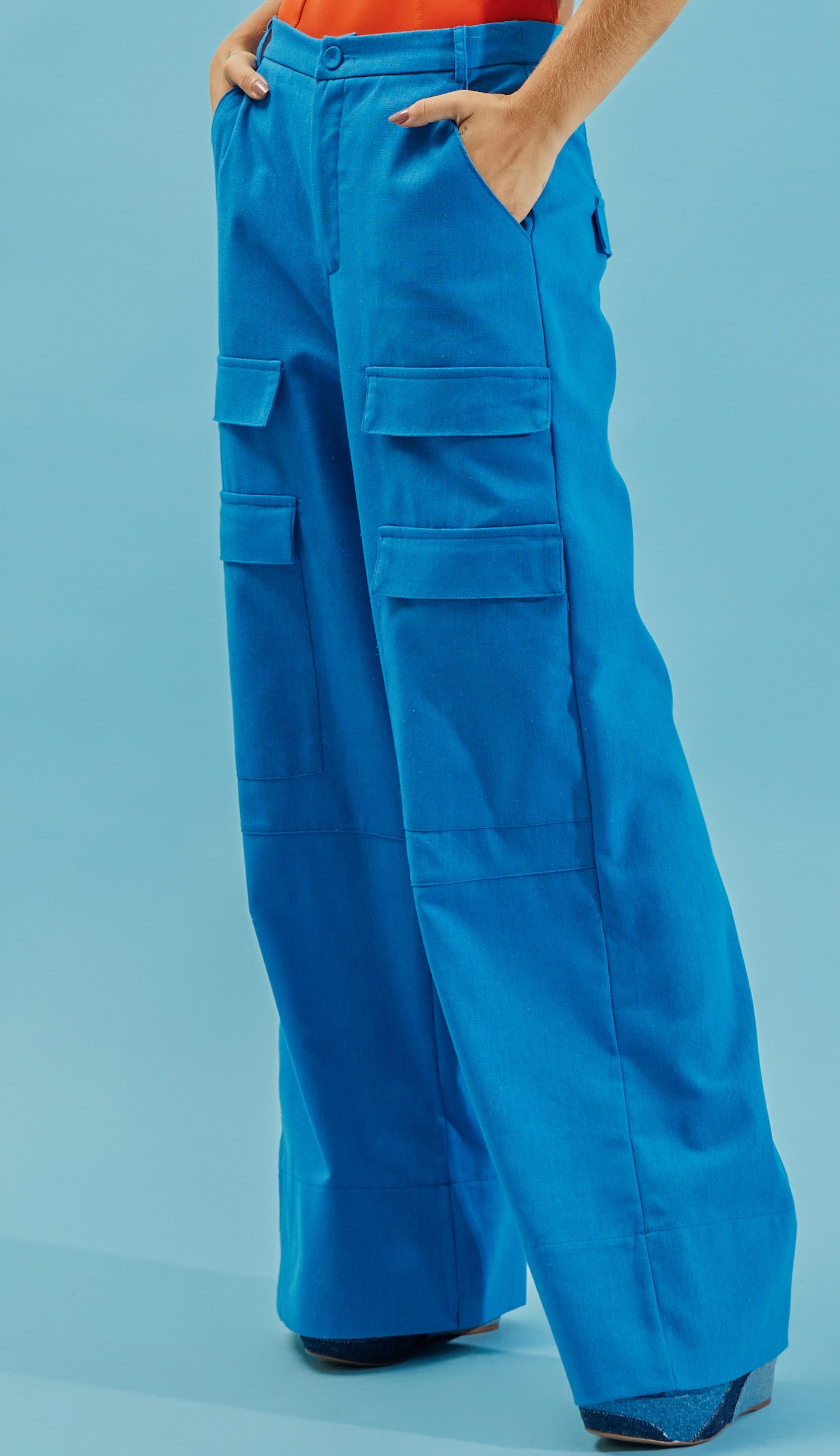 Calça wide leg confeccionada em linho com forro. Possui passantes no cós, fechamento frontal por zíper e botão forrado, bolsos faca laterais e nas pernas conta com recortes, bolsos no estilo cargo e lapelas fake na frente e atrás.