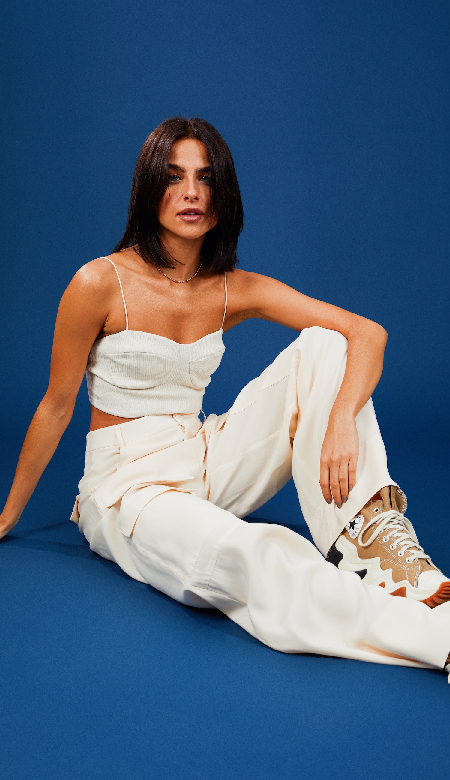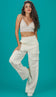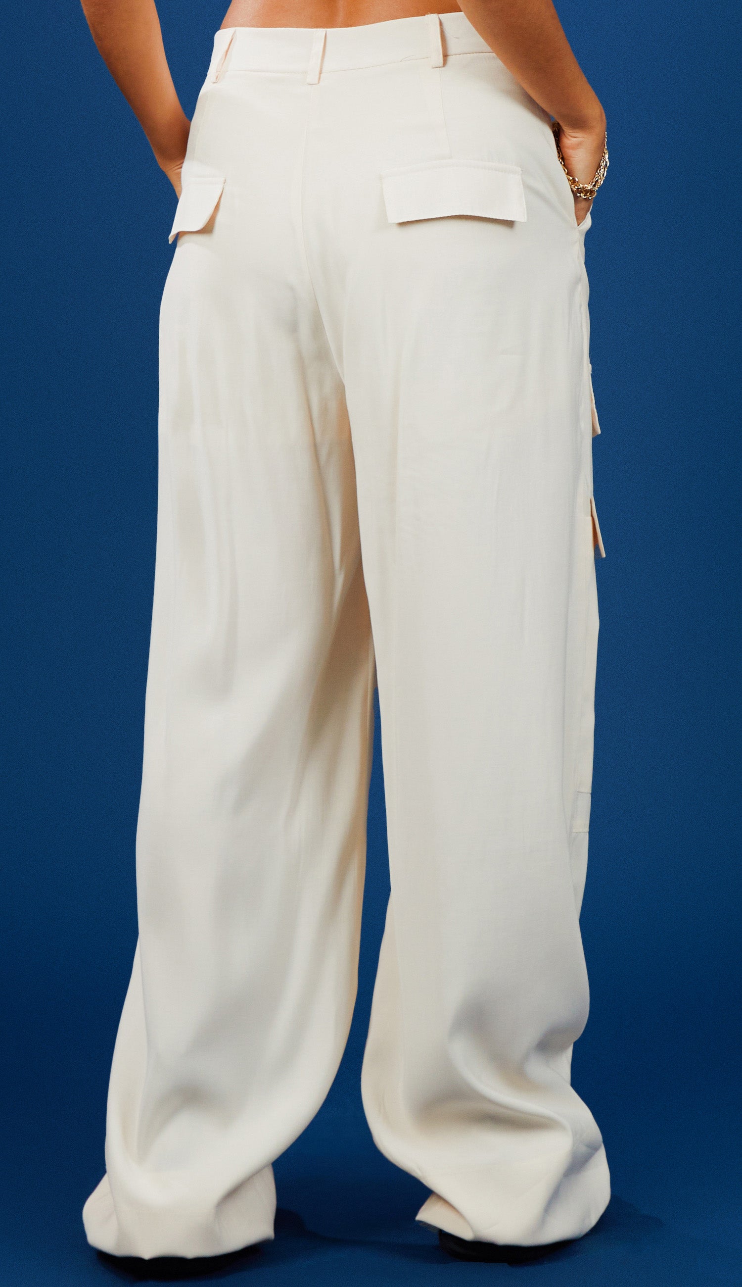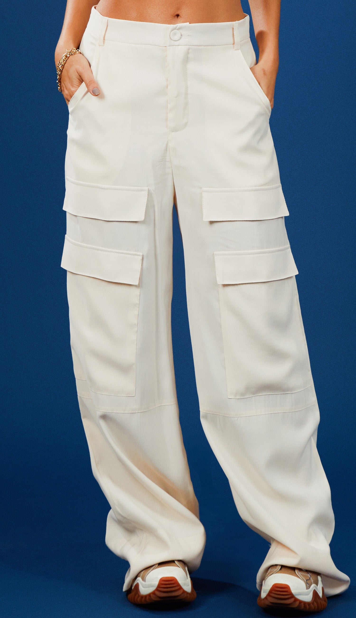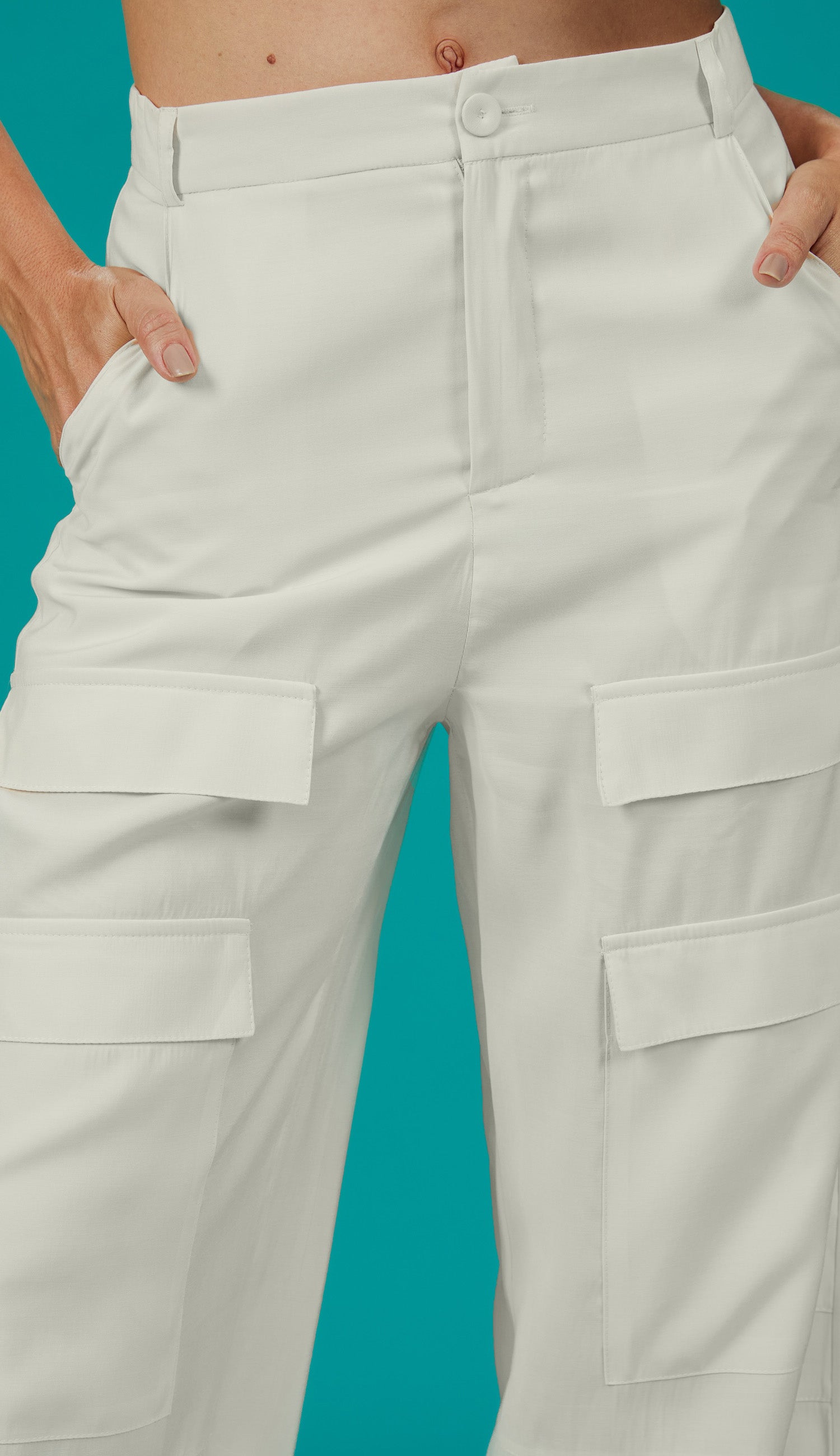 Calça wide leg com forro, confeccionada em poliviscose com aspecto de liocel. Possui passantes no cós, fechamento frontal por zíper e botão forrado, bolsos faca laterais e nas pernas conta com recortes, bolsos no estilo cargo e lapelas fake na frente e atrás. O aspecto de 'tecido nobre' dá um ar sofisticado ao look.