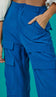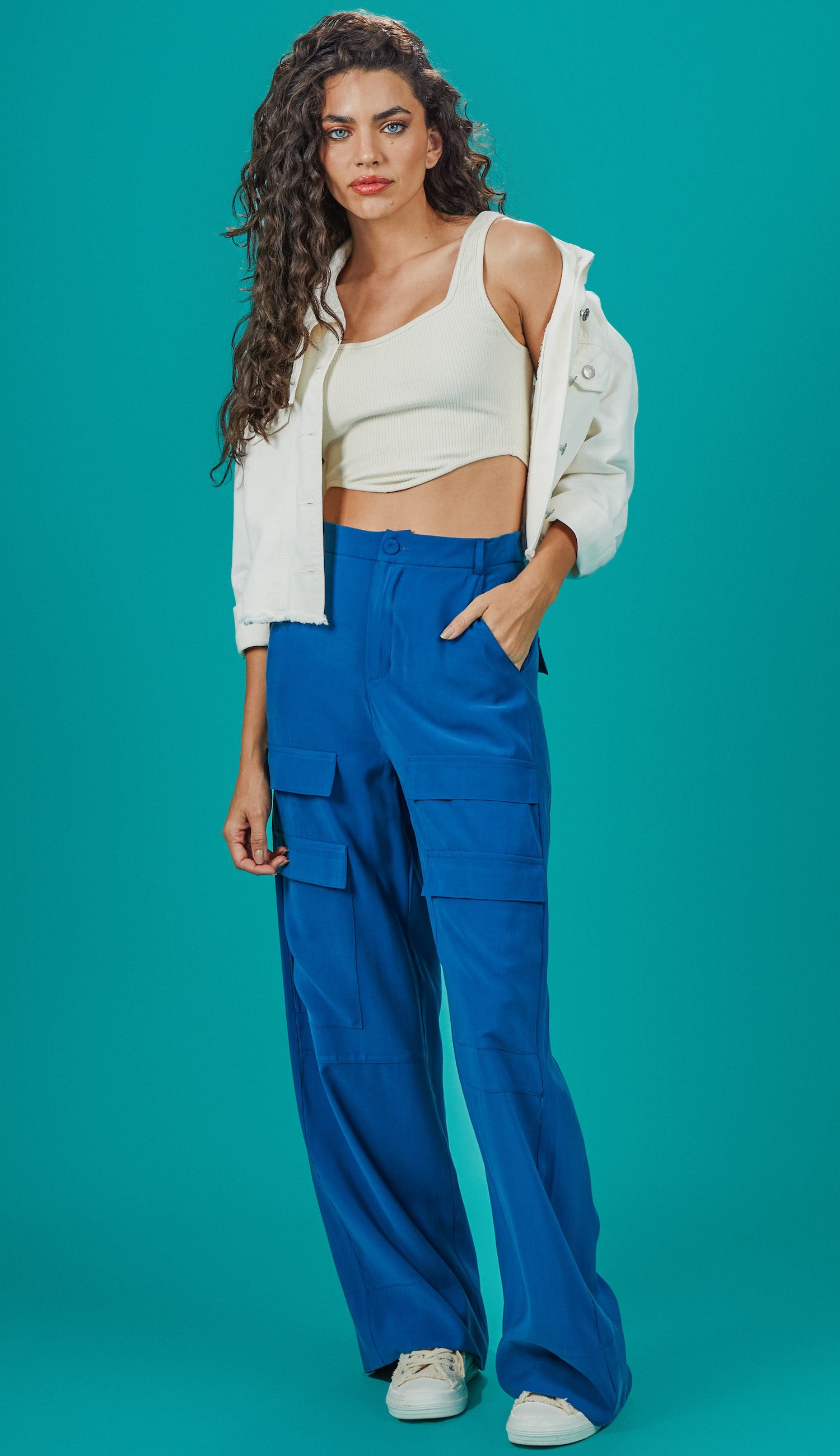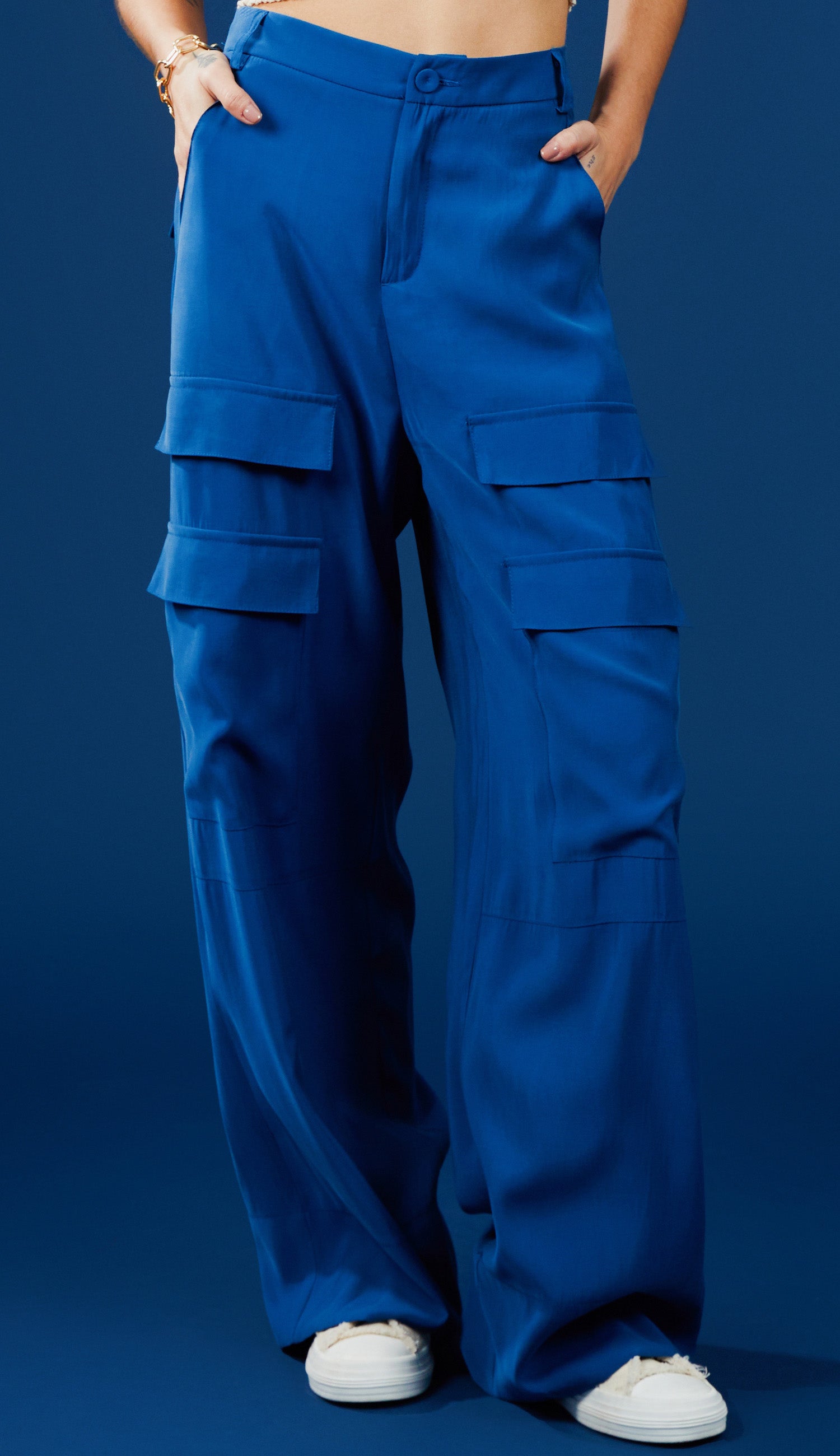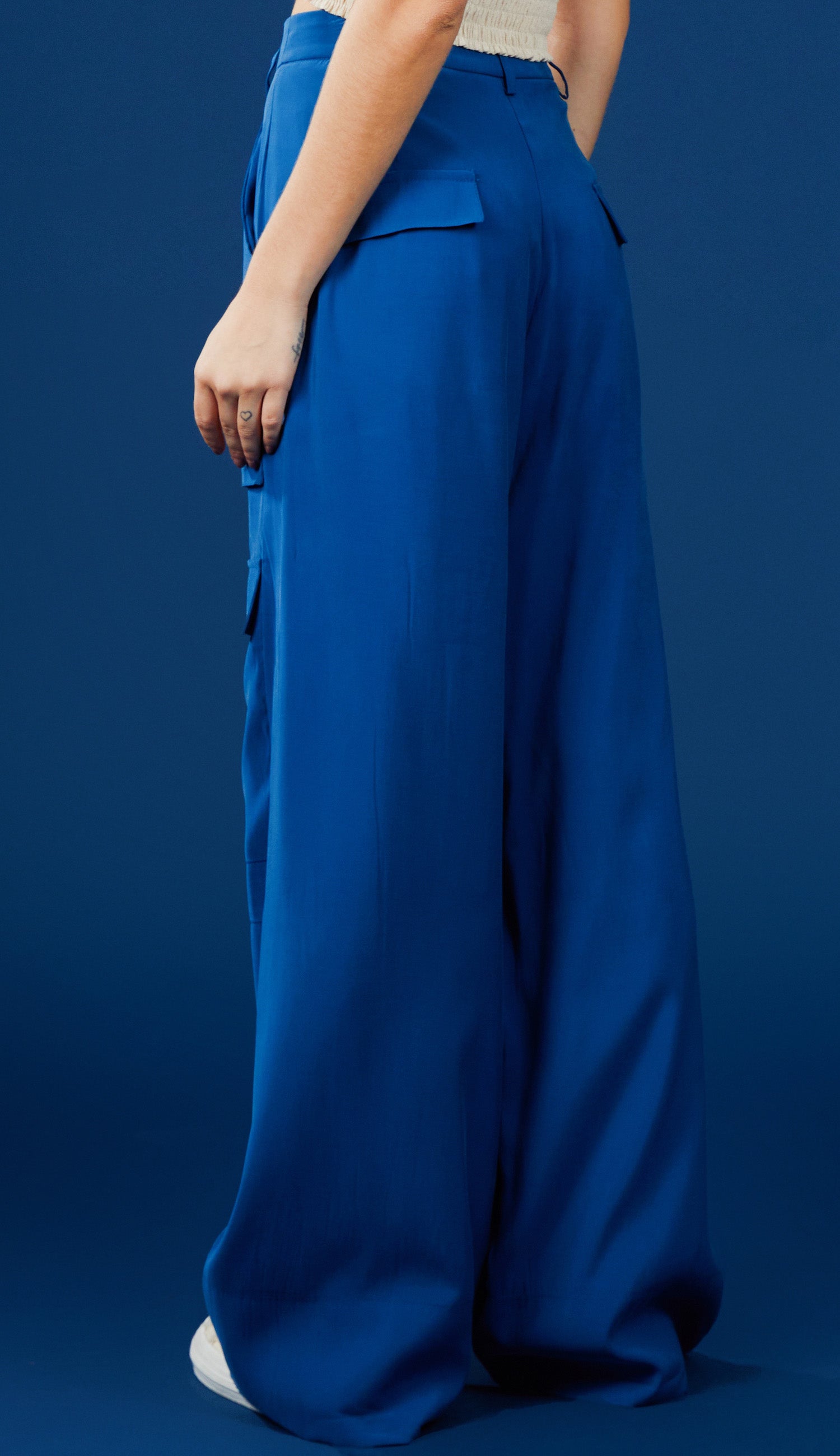 Calça wide leg com forro, confeccionada em poliviscose com aspecto de liocel. Possui passantes no cós, fechamento frontal por zíper e botão forrado, bolsos faca laterais e nas pernas conta com recortes, bolsos no estilo cargo e lapelas fake na frente e atrás. O aspecto de 'tecido nobre' dá um ar sofisticado ao look.