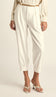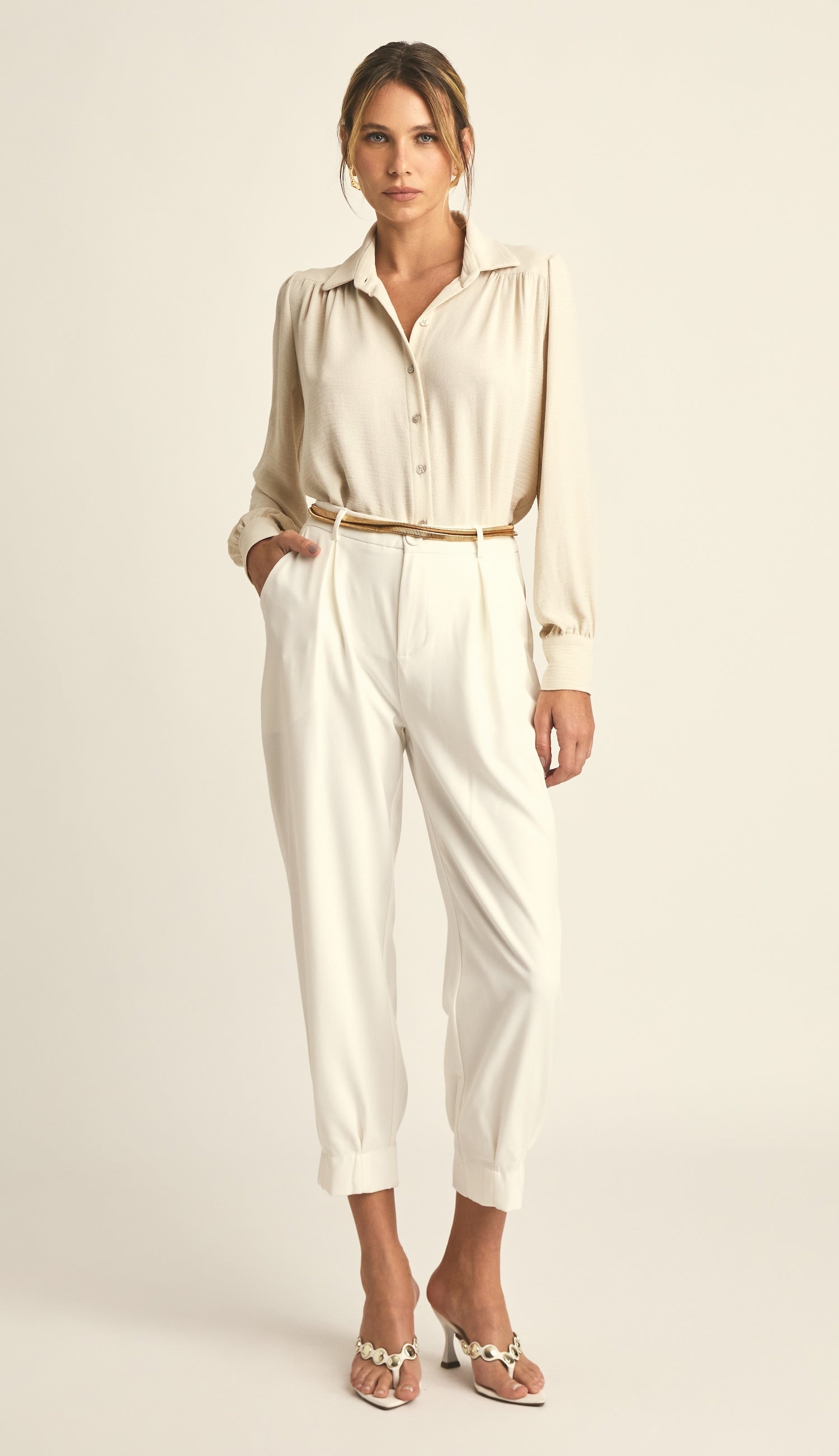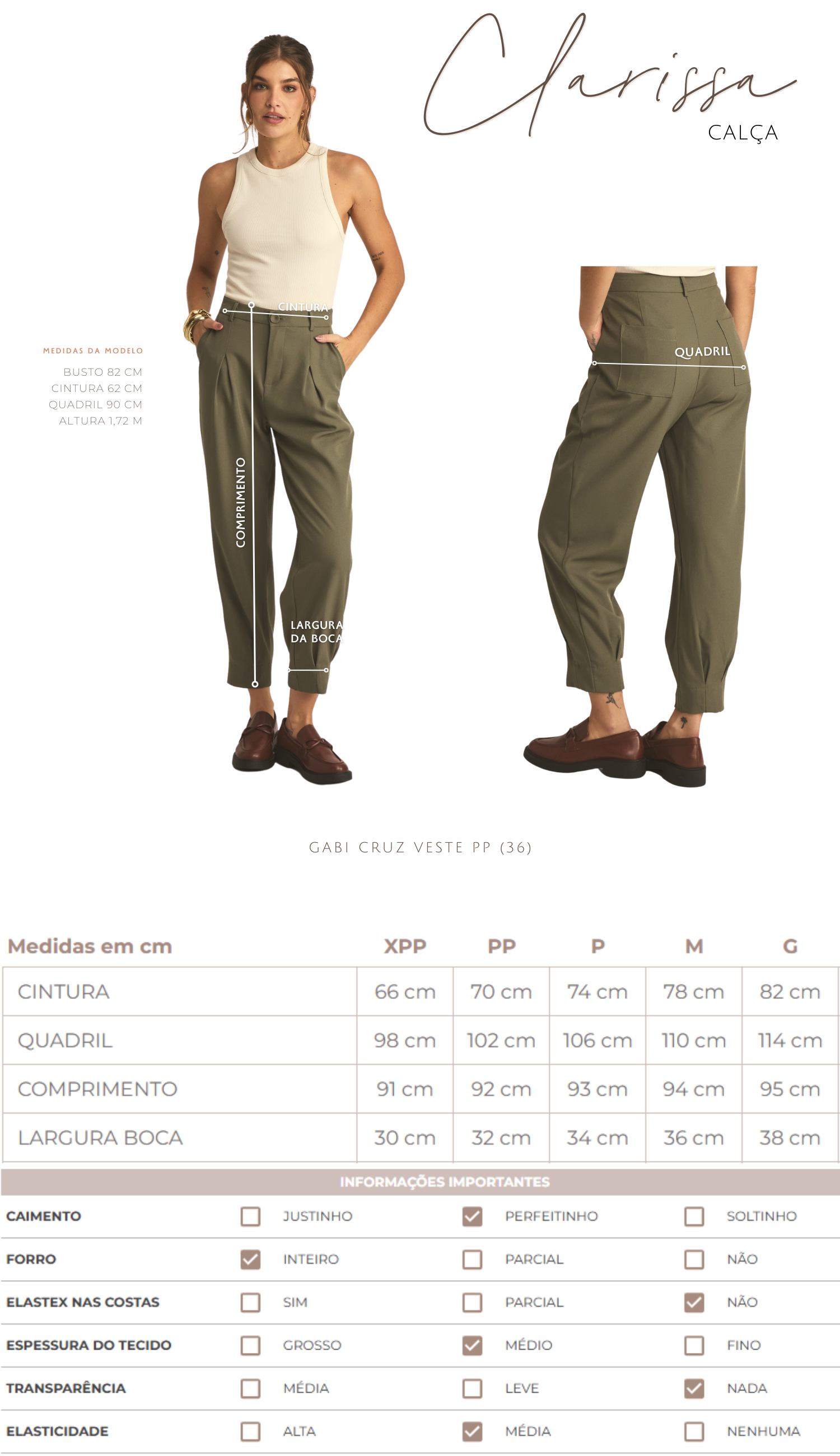 Calça carrot confeccionada em crepe de alfaiataria com forro na peça inteira. Possui modelagem clássica com pregas frontais e na barra que dão um volume muito charmoso, passantes no cós, bolsos faca laterais, bolsos chapados traseiros e fechamento frontal por zíper, botão interno e botão forrado.