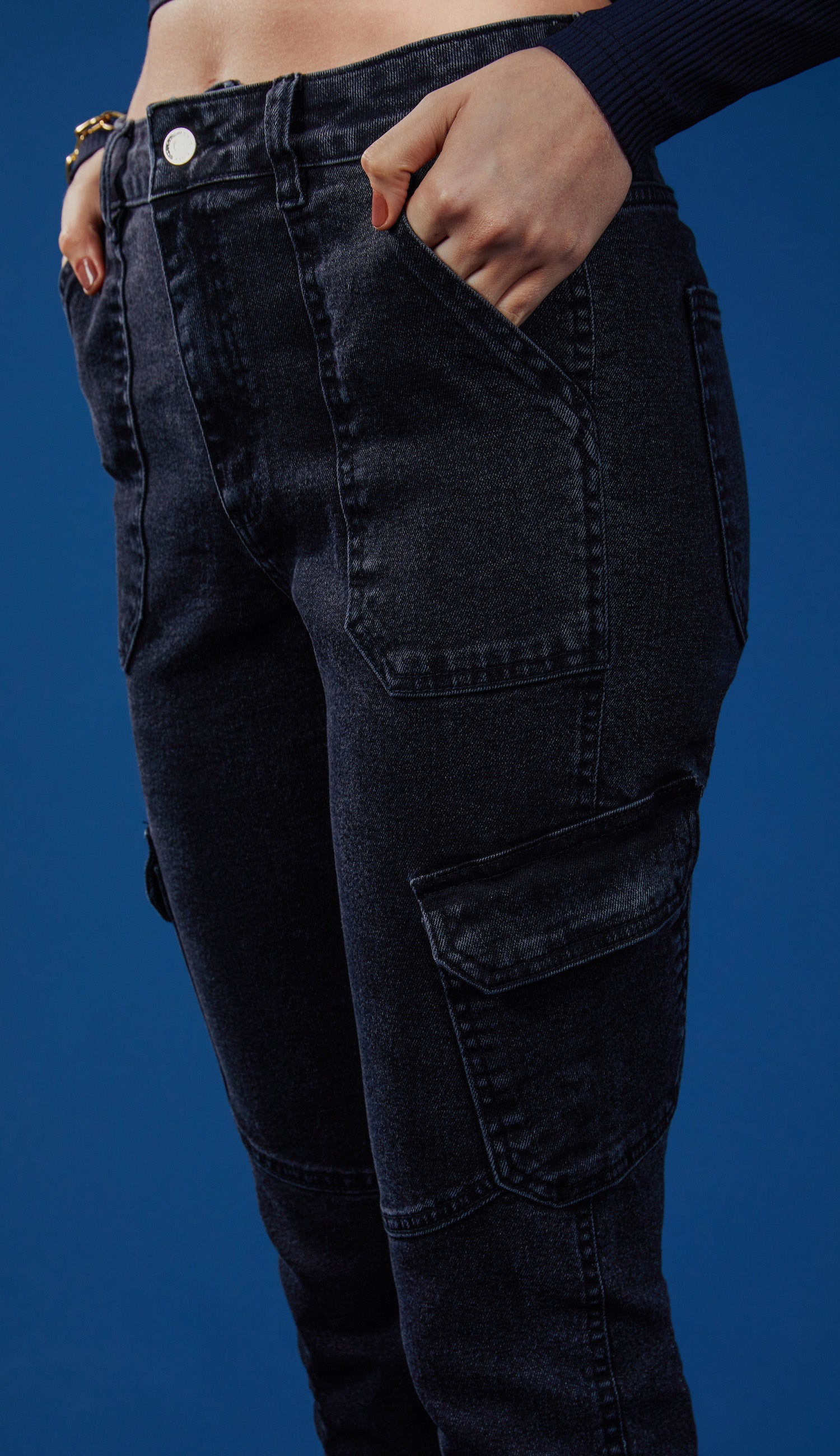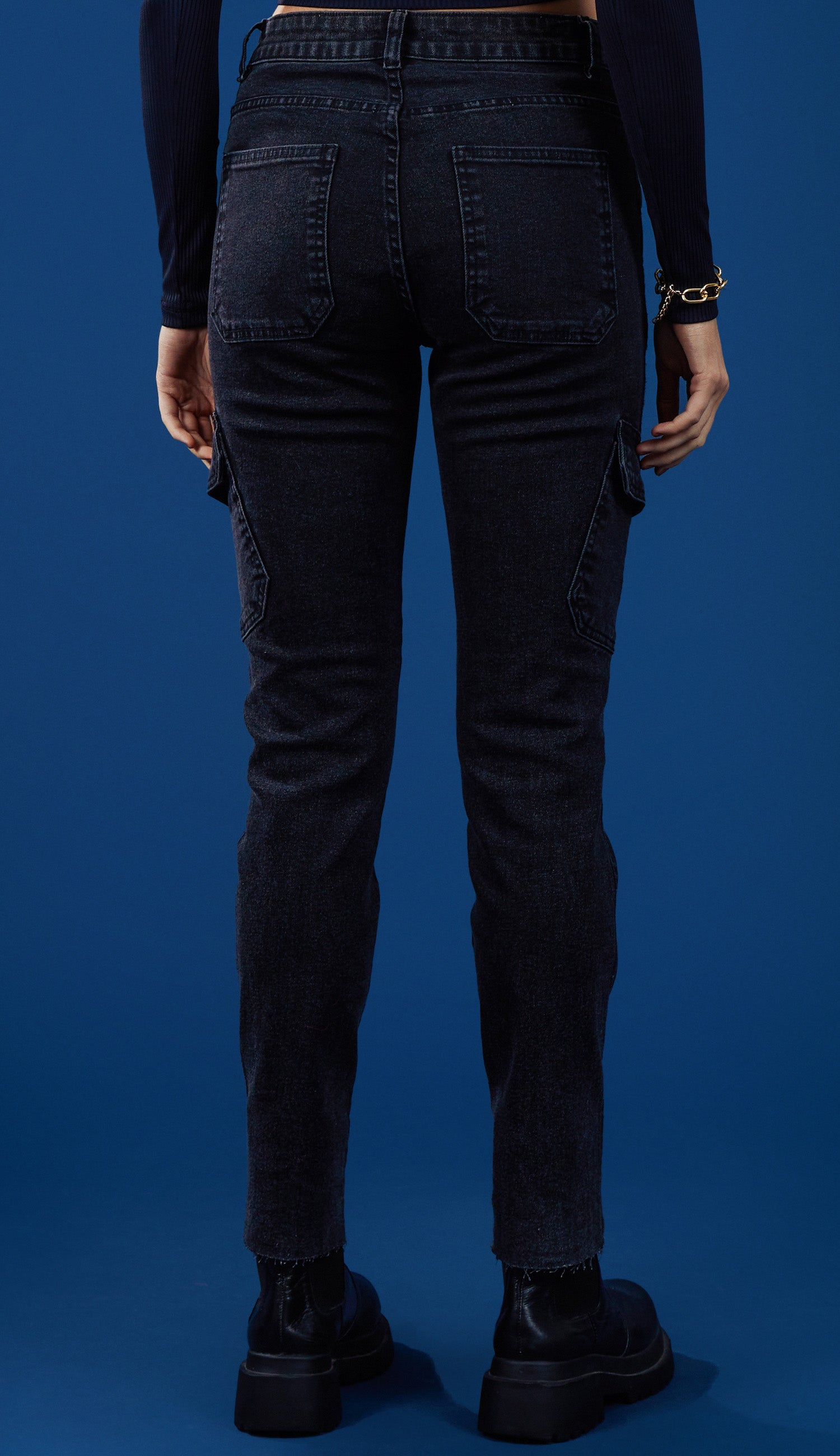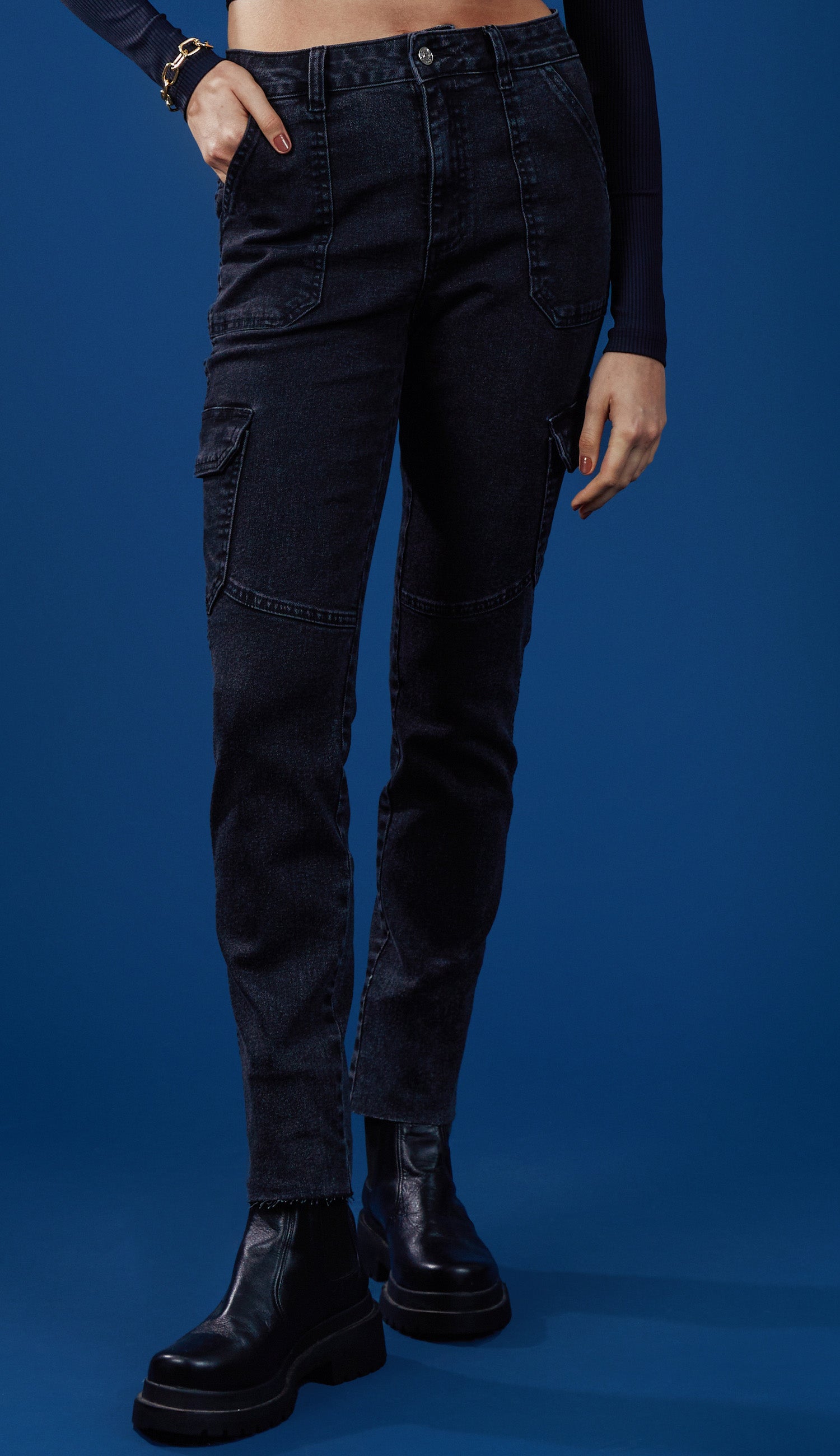Calça jeans com leve elasticidade. Possui modelagem ajustada; passantes no cós; bolsos laterais, traseiros e na perna com lapela, no estilo cargo; fechamento frontal por botão e zíper de metal e barra a fio.