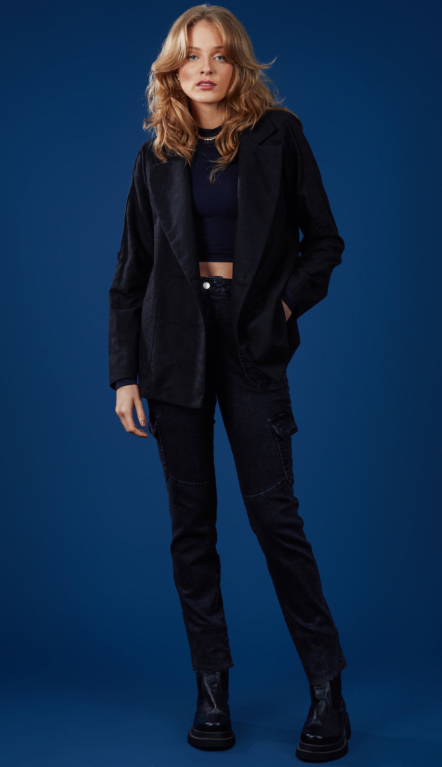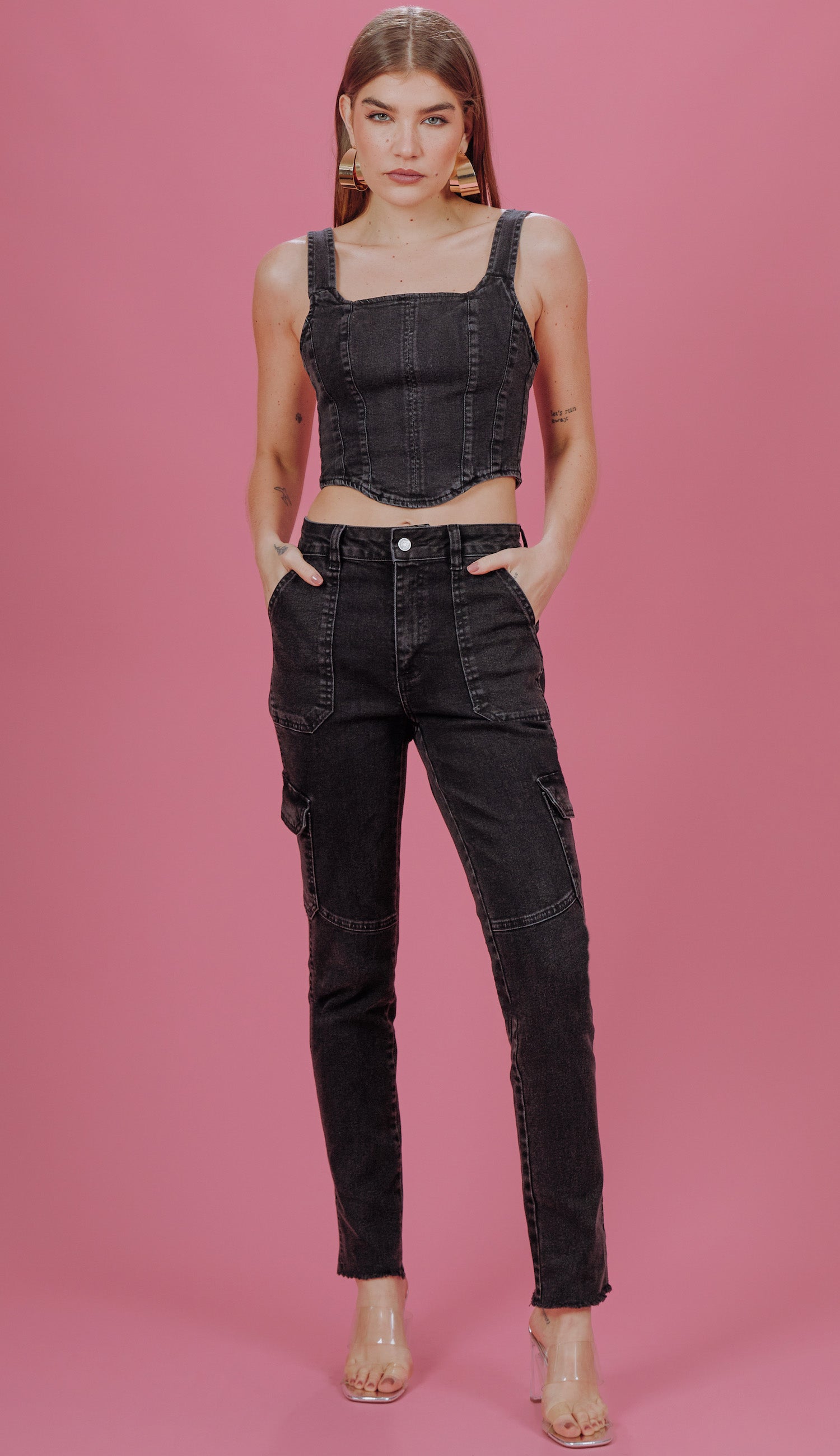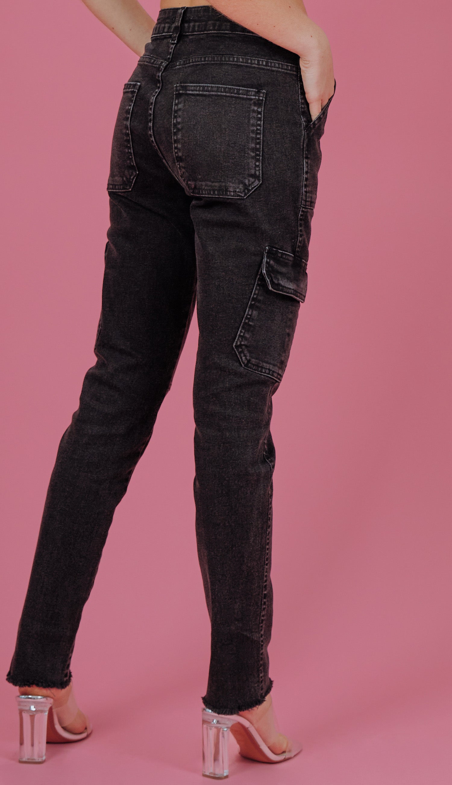 Calça jeans com leve elasticidade. Possui modelagem ajustada; passantes no cós; bolsos laterais, traseiros e na perna com lapela, no estilo cargo; fechamento frontal por botão e zíper de metal e barra a fio.