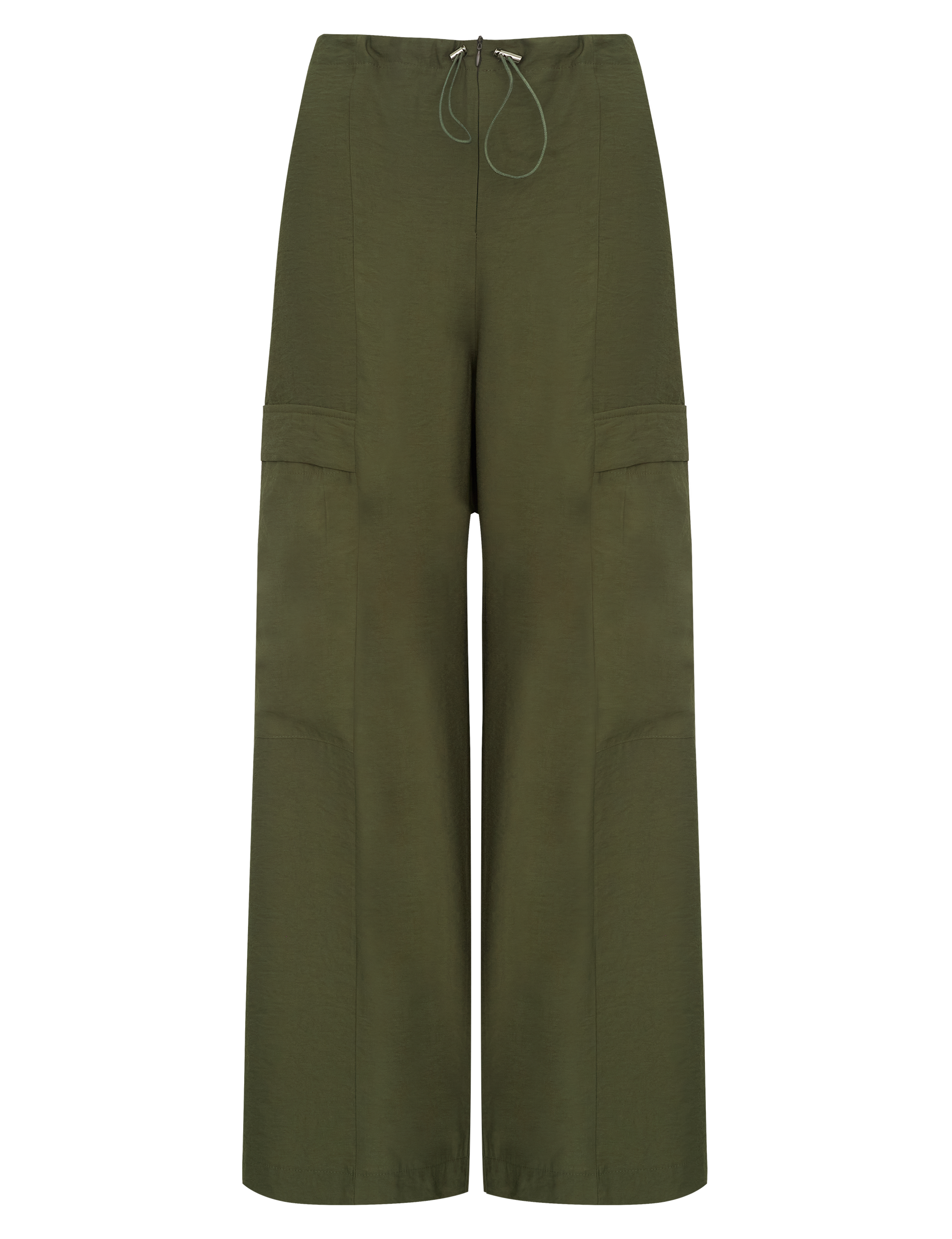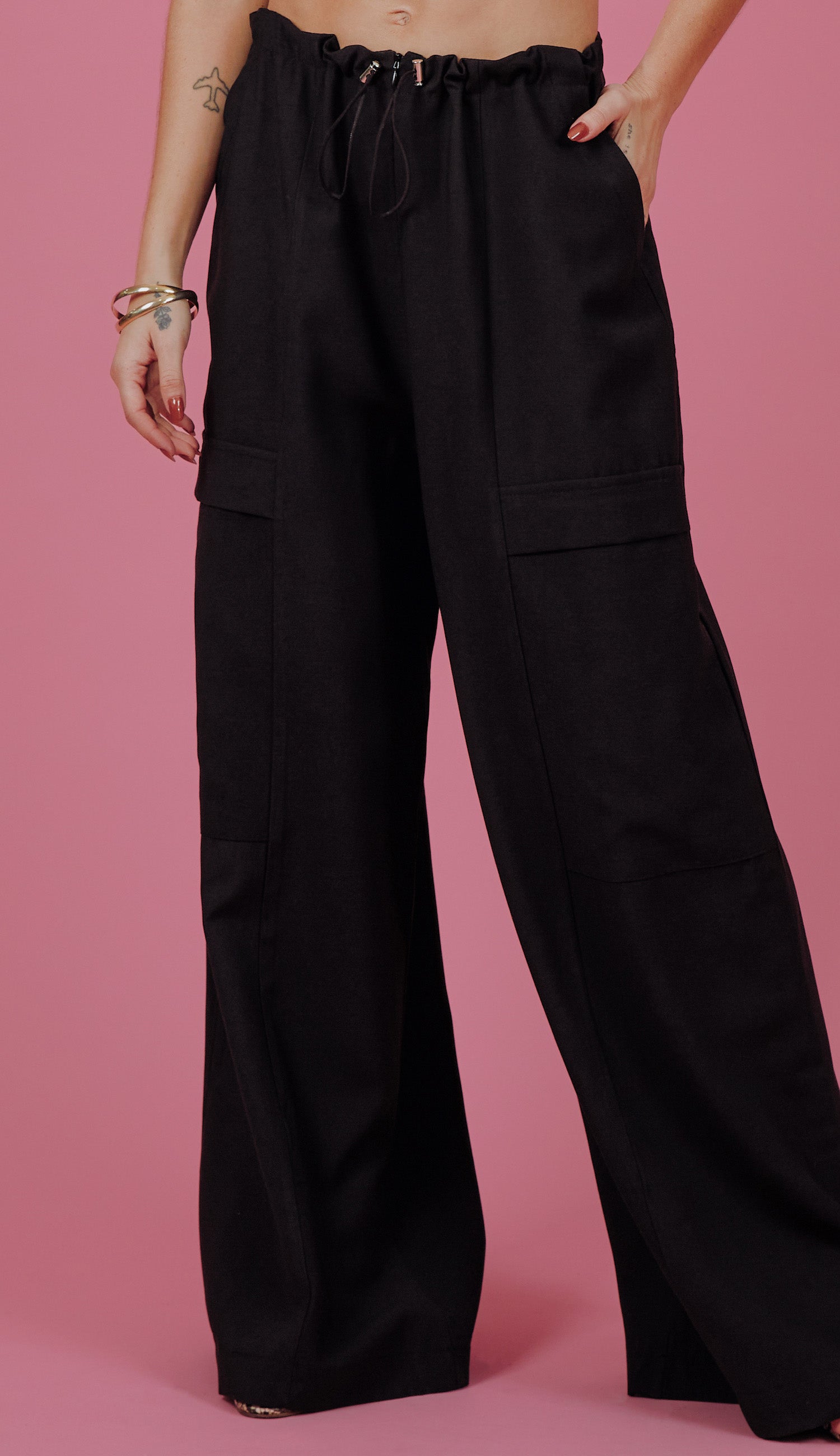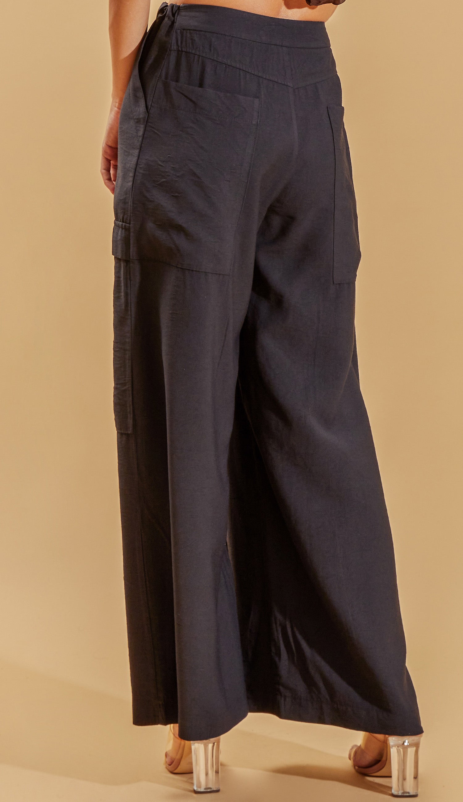 Calça pantalona confeccionada em alfaiataria de viscose com aspecto de liocel e efeito amassadinho Possui fechamento frontal por zíper invisível, elástico interno no cós frente com reguladores de metal, recortes frontais, bolsos laterais, traseiros e maxi bolsos nas pernas no estilo cargo.