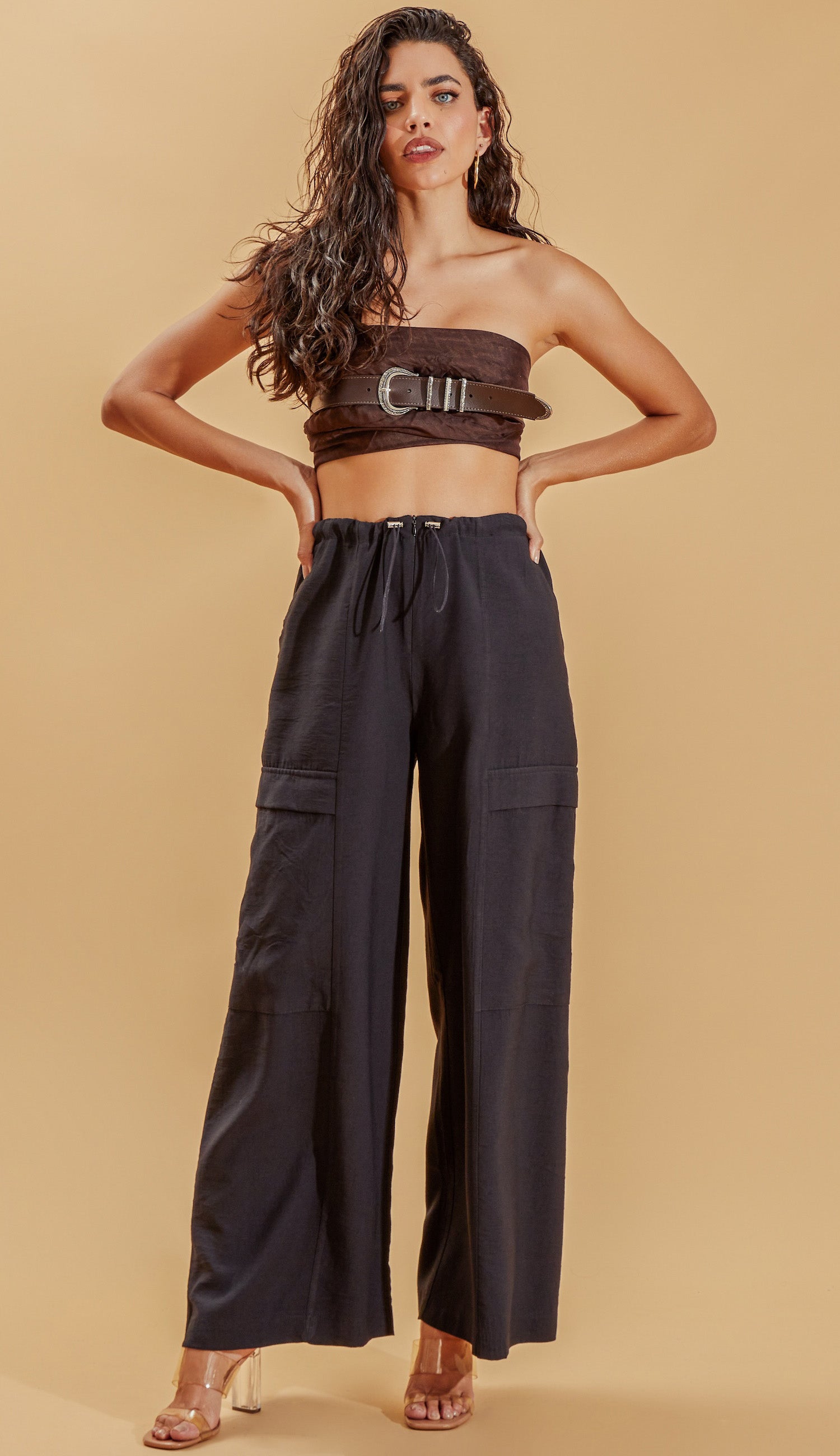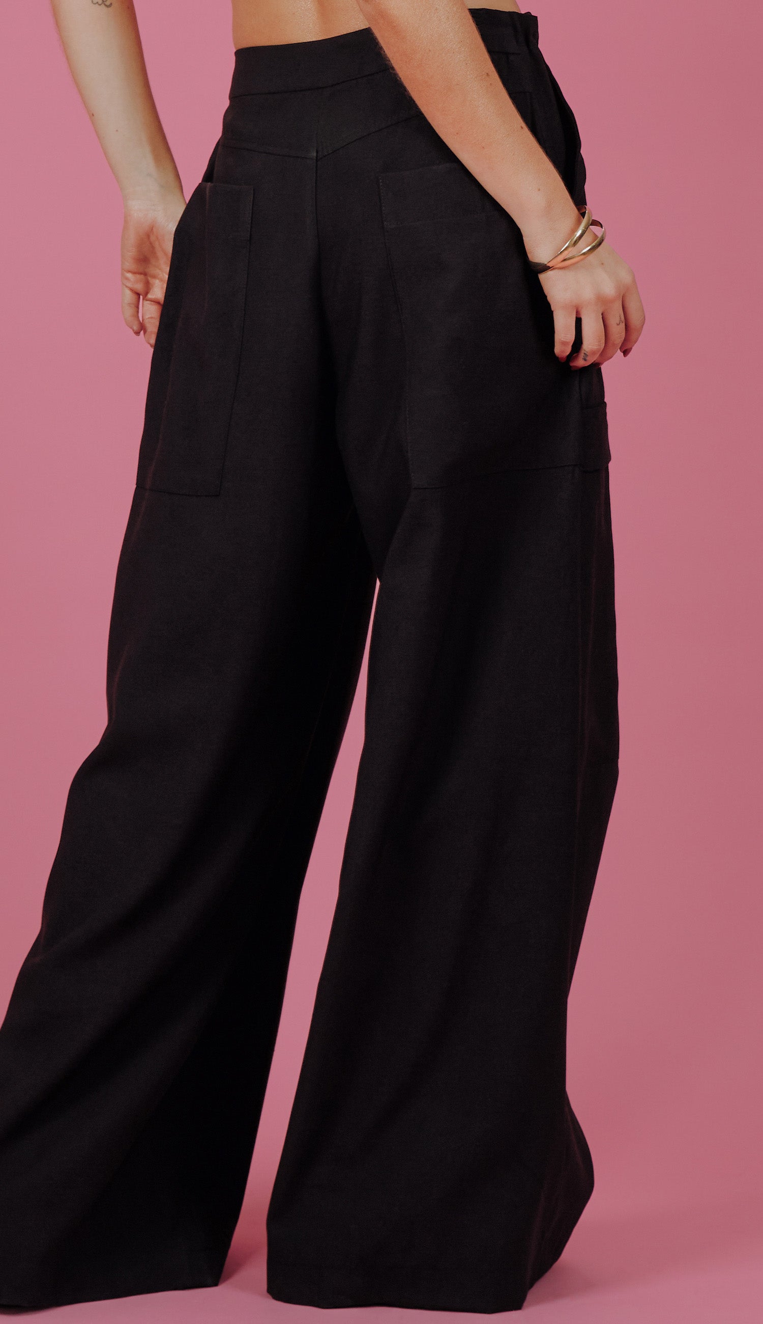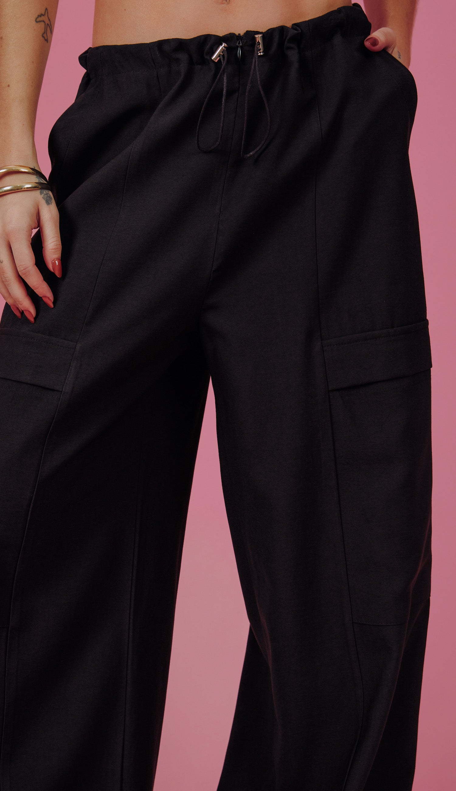 Calça pantalona confeccionada em alfaiataria de viscose com aspecto de liocel e efeito amassadinho Possui fechamento frontal por zíper invisível, elástico interno no cós frente com reguladores de metal, recortes frontais, bolsos laterais, traseiros e maxi bolsos nas pernas no estilo cargo.