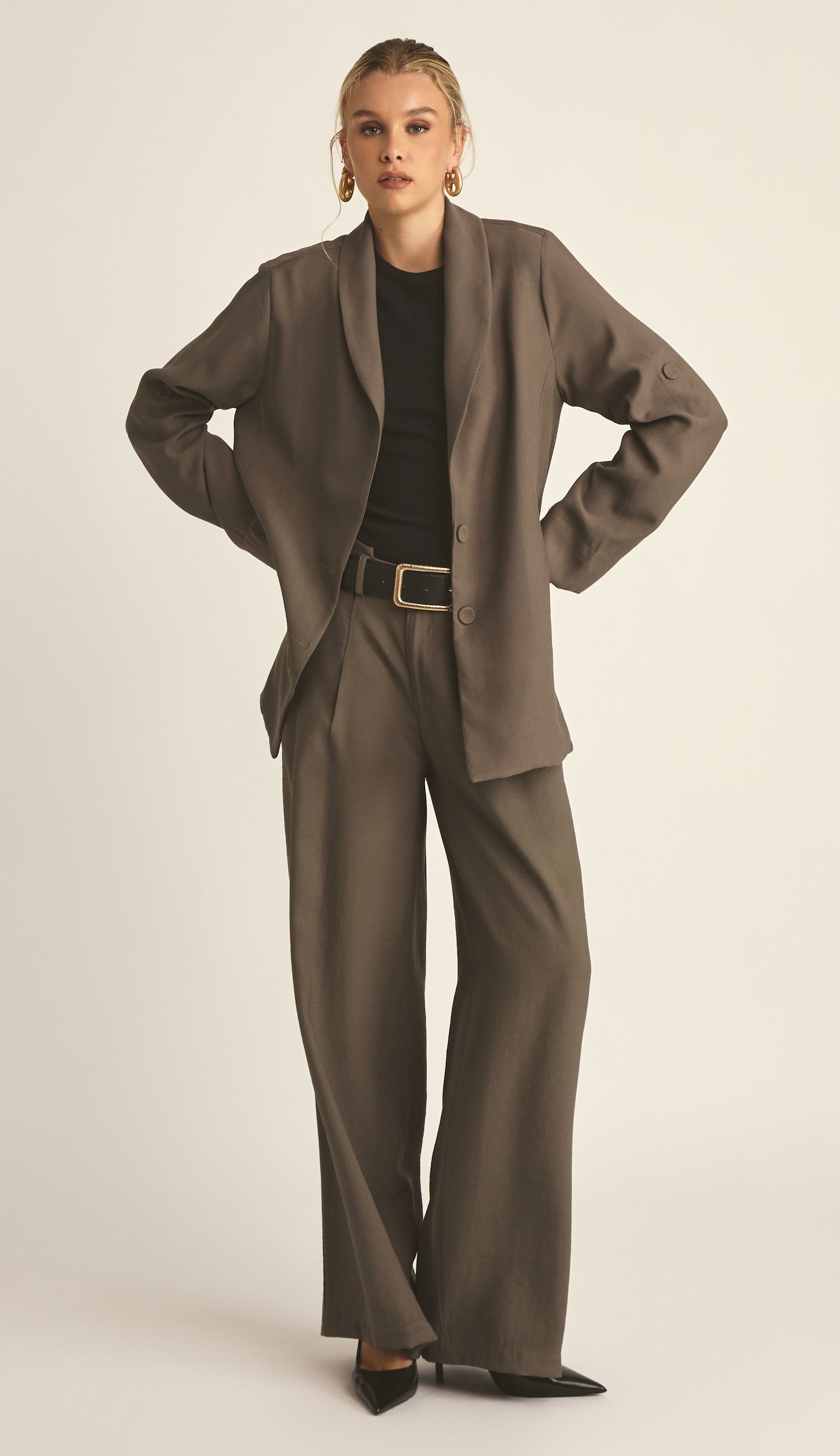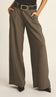 Calça wide confeccionada em sarja de alfaiataria em poliviscose mais encorpada com aspecto amassadinho. Possui fechamento frontal por zíper e botão forrado, pregas frontais, cós com recorte deslocado e discretas aberturinhas, passantes no cós, bolsos faca laterais e bolsos traseiros embutidos.