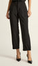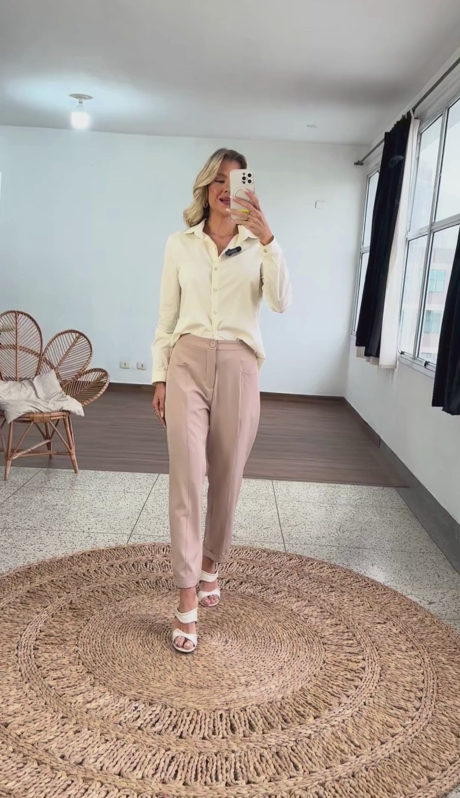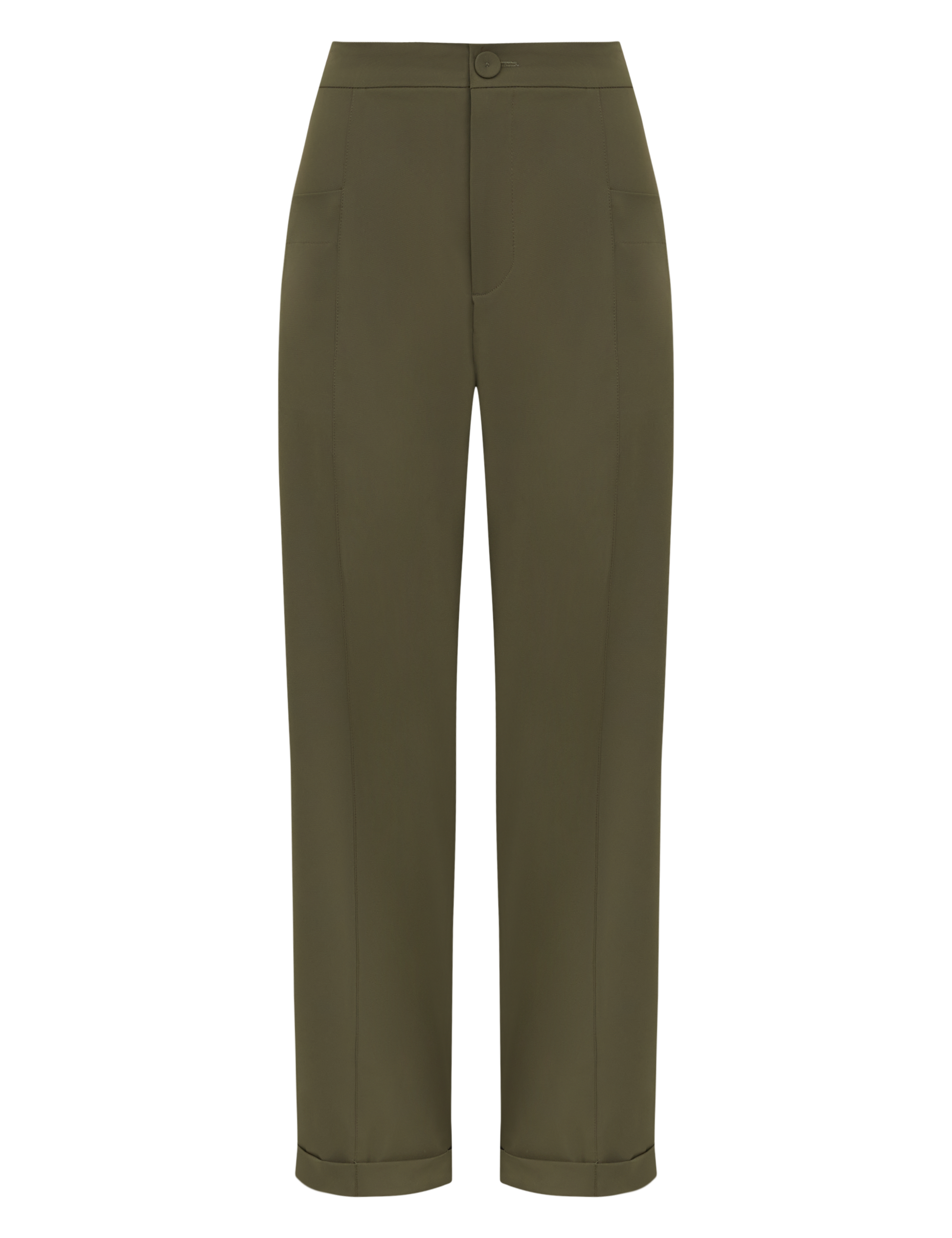 Calça capri com forro inteiro, confeccionada em crepe de alfaiataria com toque levemente acetinado. Possui fechamento frontal por zíper e botão forrado, elástico franzido nas costas do cós, barrinha dobrada, recortes frontais pespontados que alongam a sihueta e modelam a peça, bolsos frontais com recorte diagonal e bolsos traseiros.