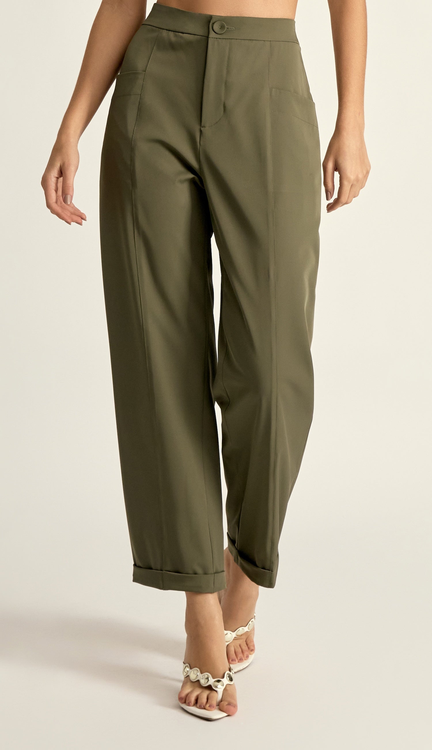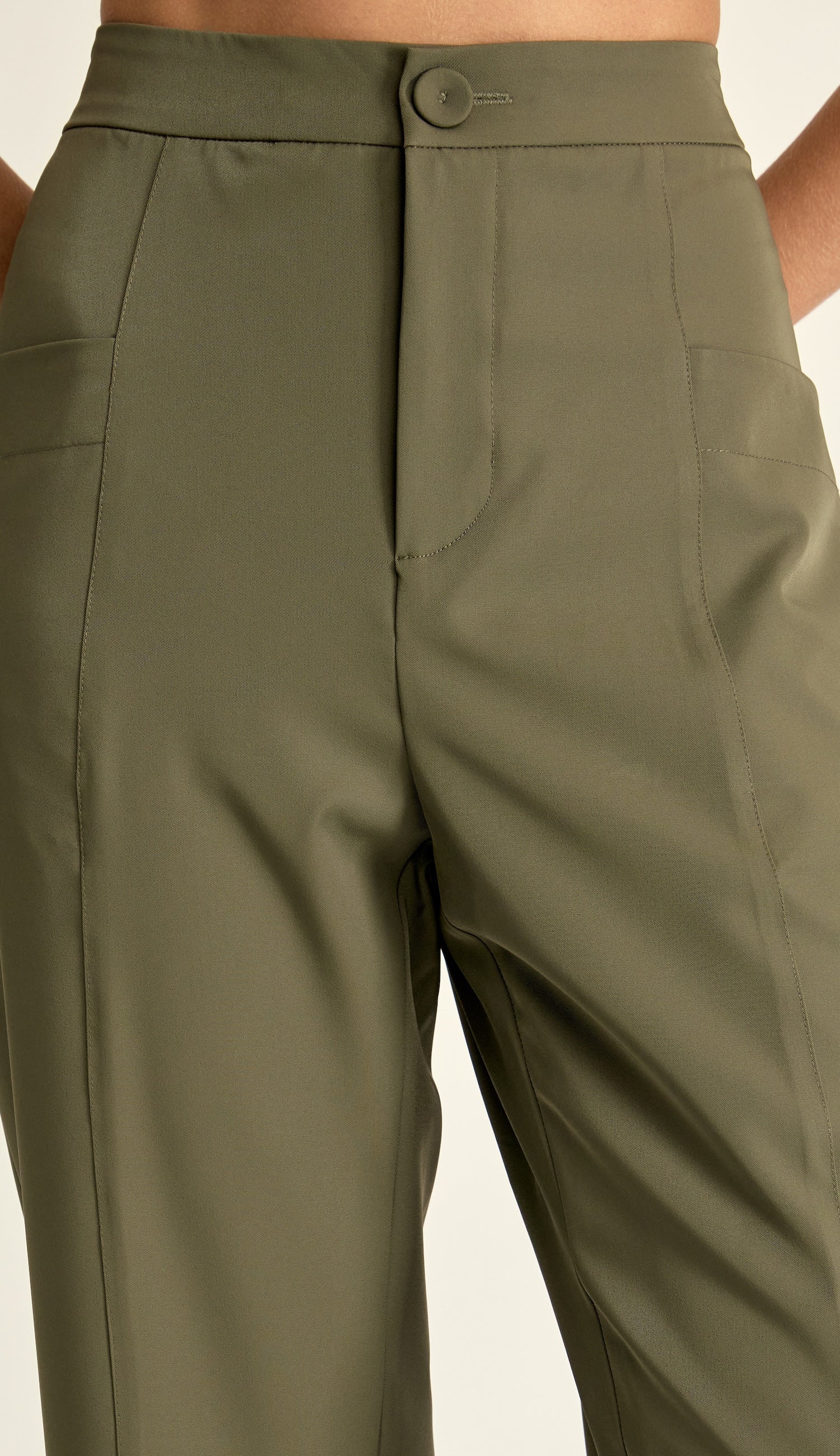 Calça capri com forro inteiro, confeccionada em crepe de alfaiataria com toque levemente acetinado. Possui fechamento frontal por zíper e botão forrado, elástico franzido nas costas do cós, barrinha dobrada, recortes frontais pespontados que alongam a sihueta e modelam a peça, bolsos frontais com recorte diagonal e bolsos traseiros.