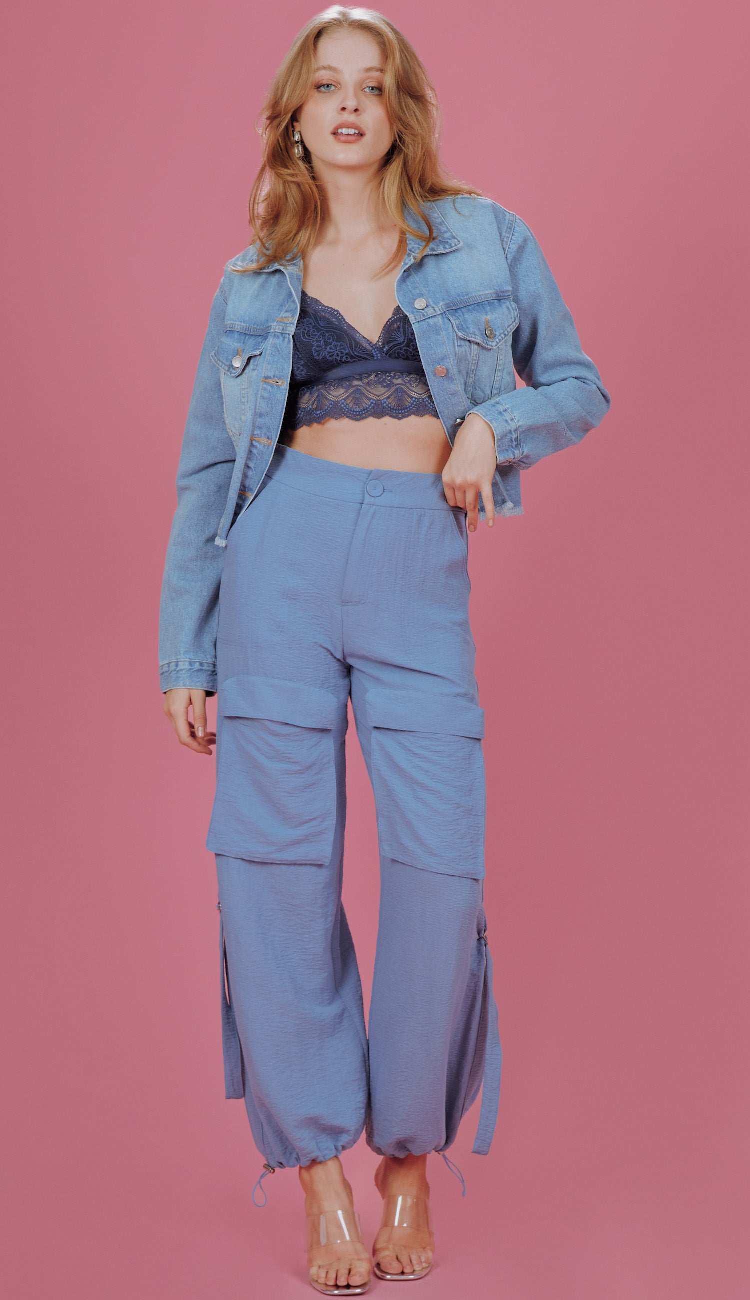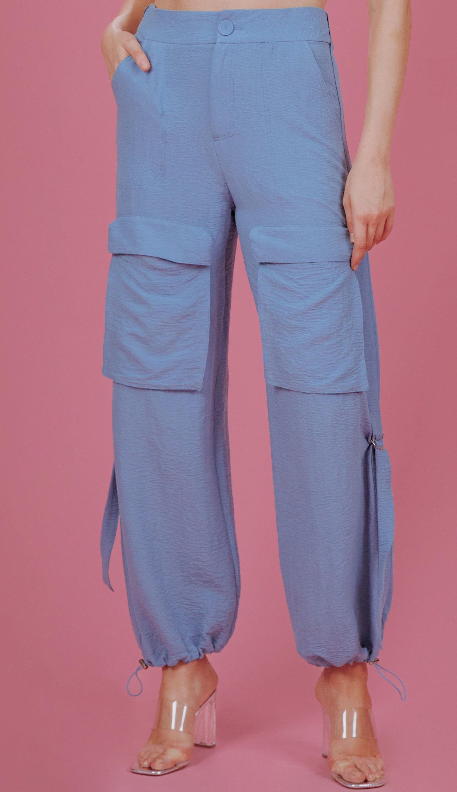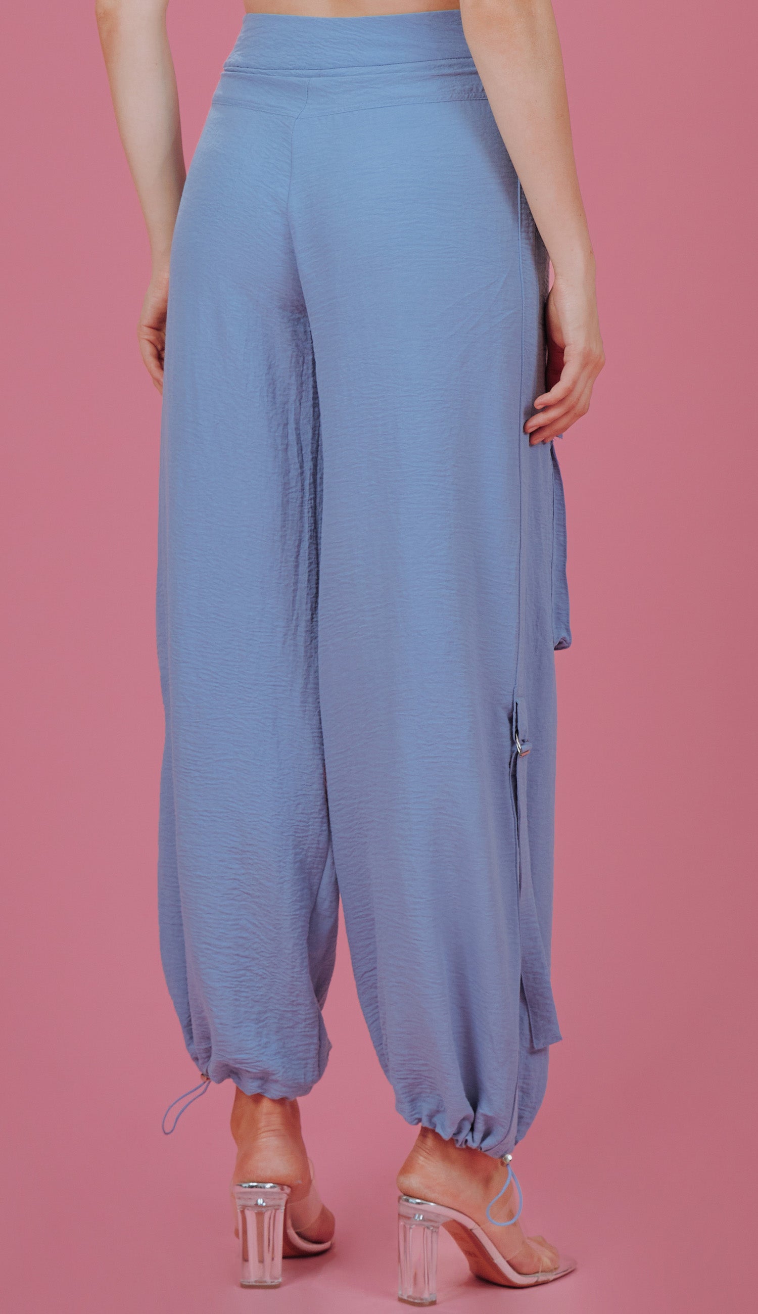 Calça wide confeccionada em poliéster com aspecto de liocel e efeito amassadinho. Possui fechamento frontal por zíper e botão forrado, bolsos laterais e maxi bolsos frontais aplicado com lapela, barra com elástico embutido e regulador de metal para ajuste e detalhe lateral nas pernas com argolas meia lua de metal e faixa para enfeite. Esse tecido garante praticidade e elegância, pois, devido à sua composição, não amassa facilmente e o aspecto de 'tecido nobre' dá um ar sofisticado ao look.