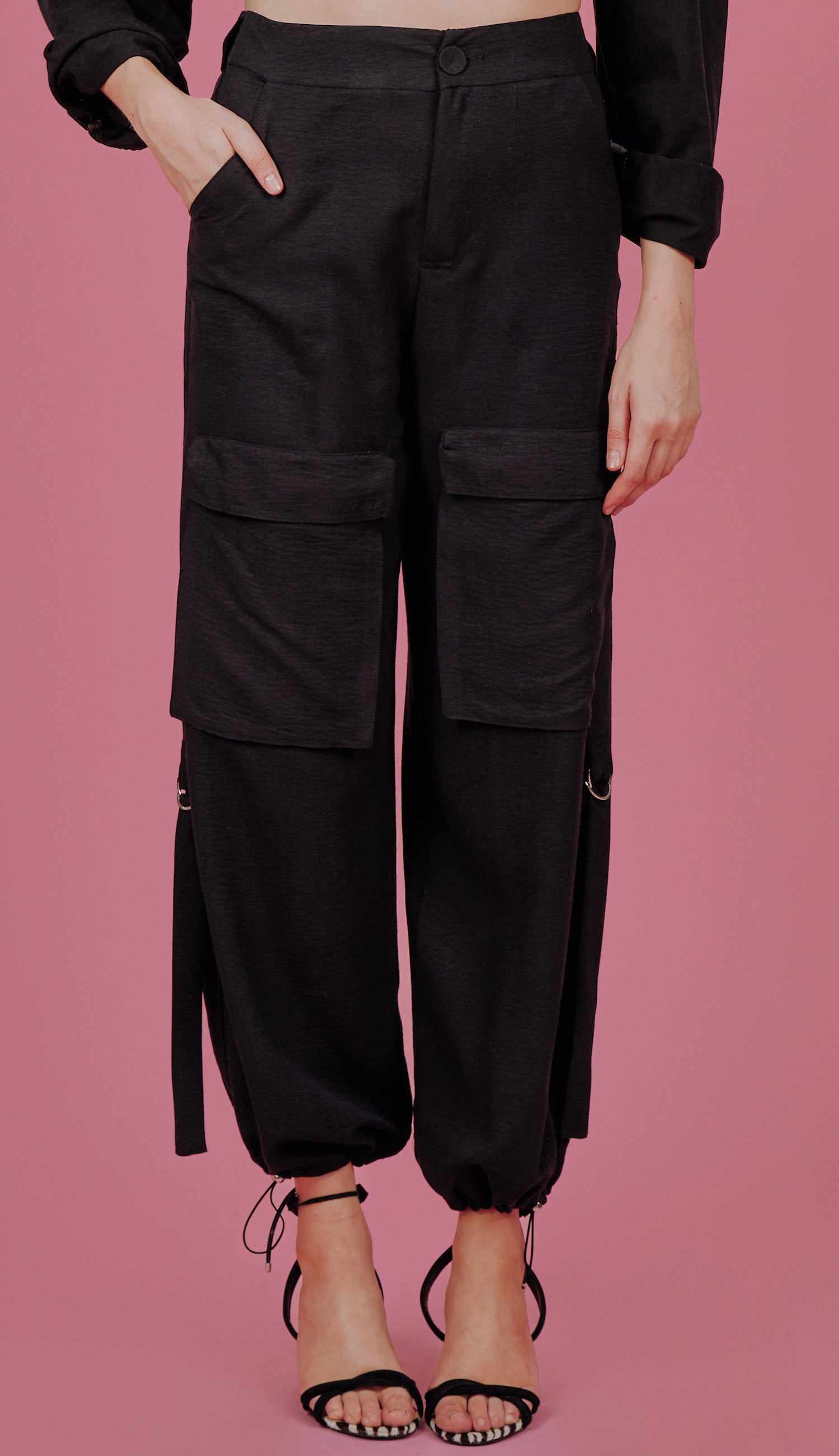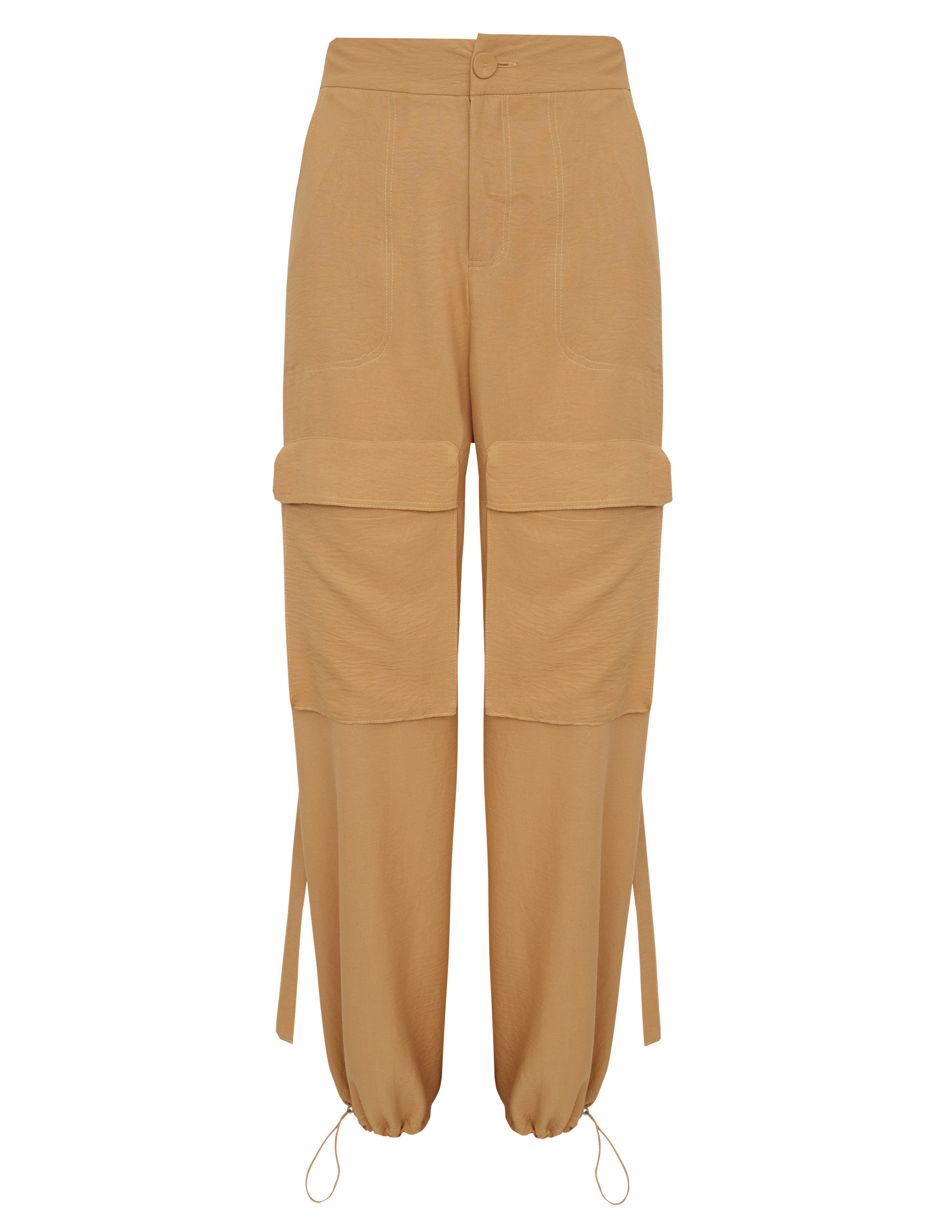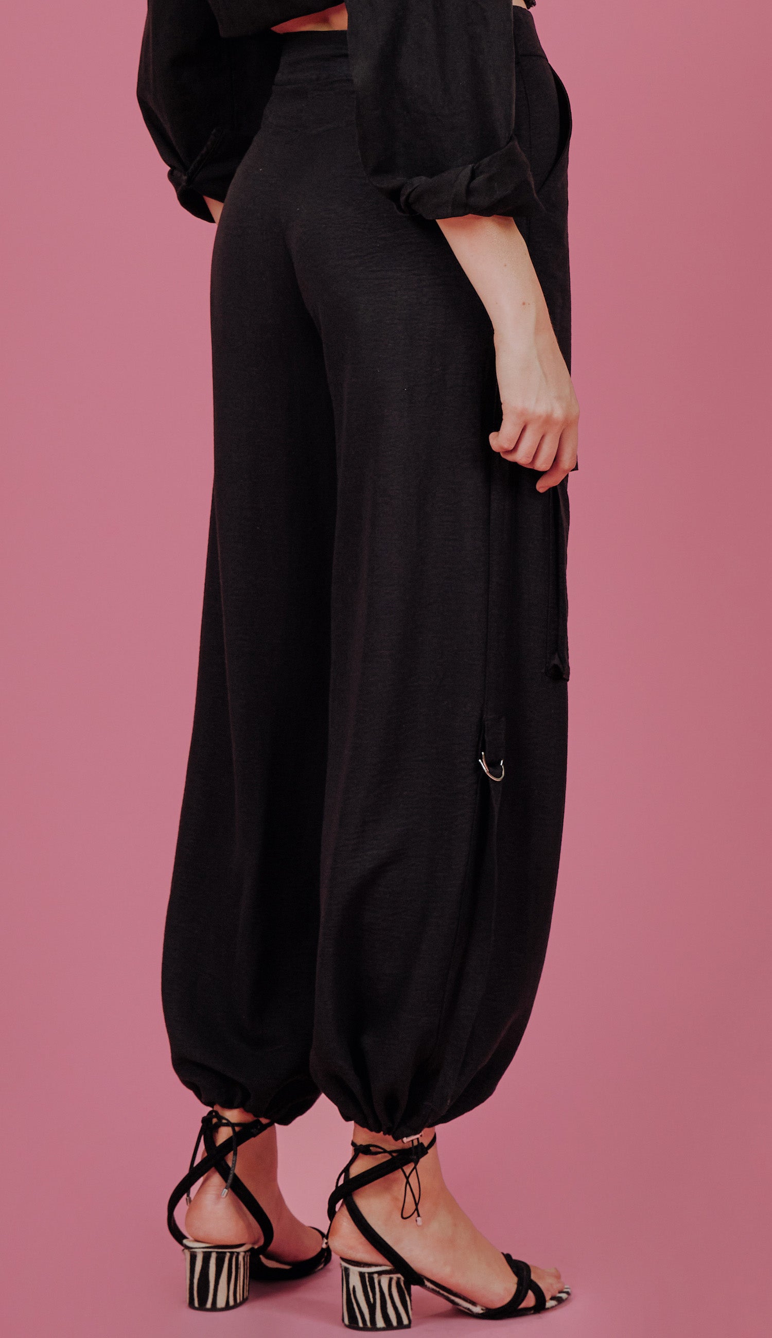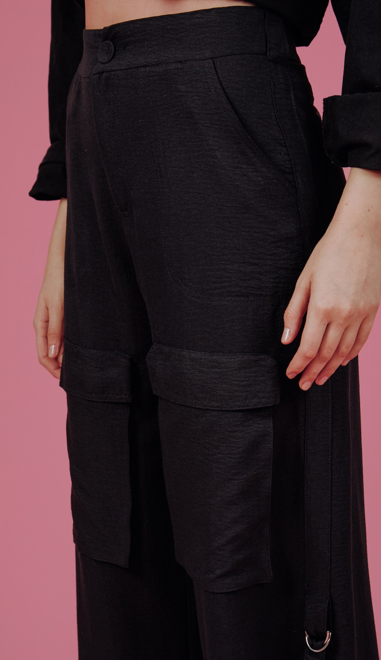 Calça larga confeccionada em poliéster com aspecto de liocel e efeito amassadinho. Possui fechamento frontal por zíper e botão forrado, bolsos laterais e maxi bolsos frontais aplicados com lapela, barra com elástico embutido e regulador de metal para ajuste e detalhe lateral nas pernas com argolas meia lua de metal e faixa para acessório. Esse tecido garante praticidade e moda, pois, devido à sua composição, não amassa facilmente e o visual de 'tecido nobre' dá um ar sofisticado ao visual.