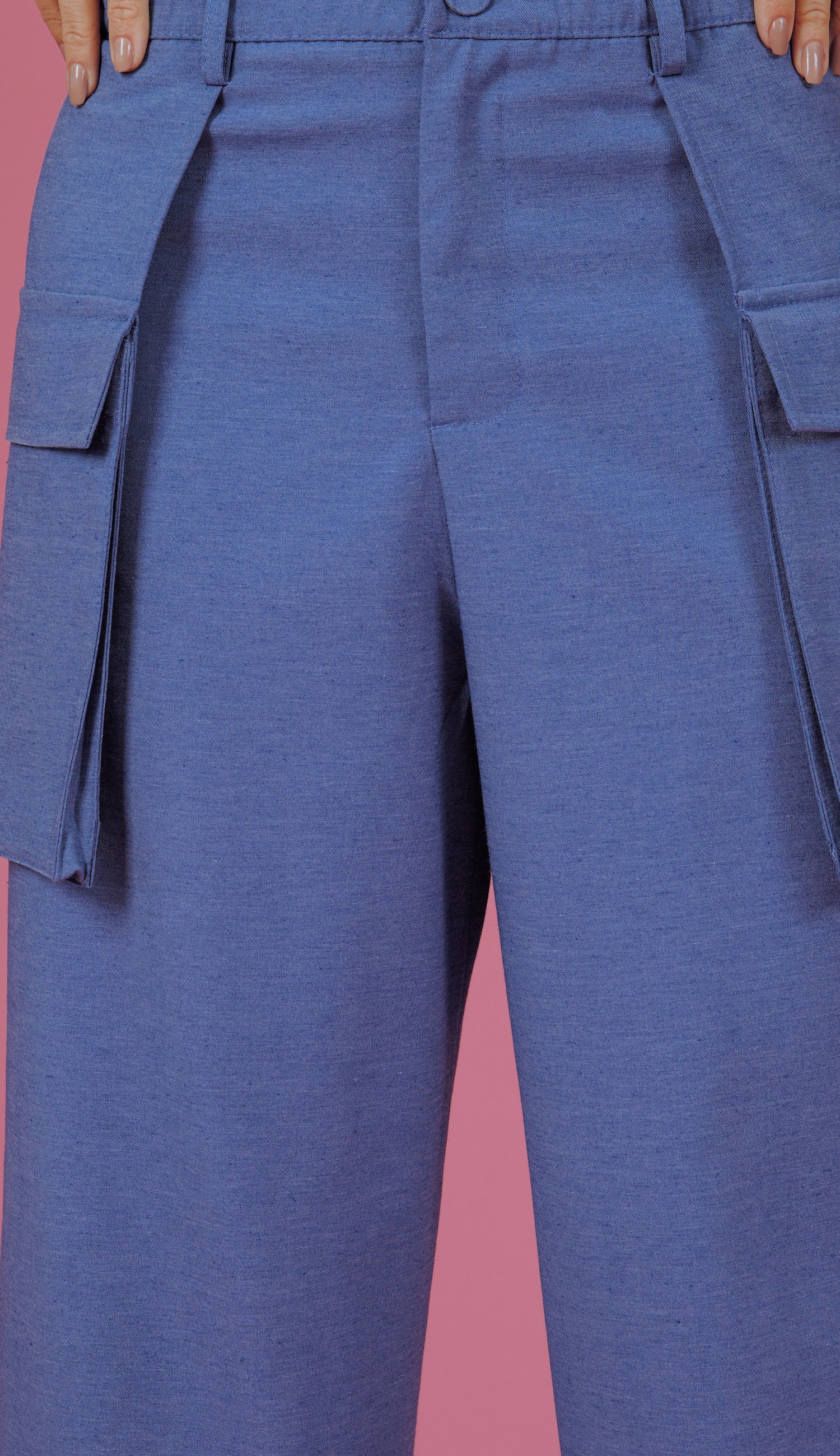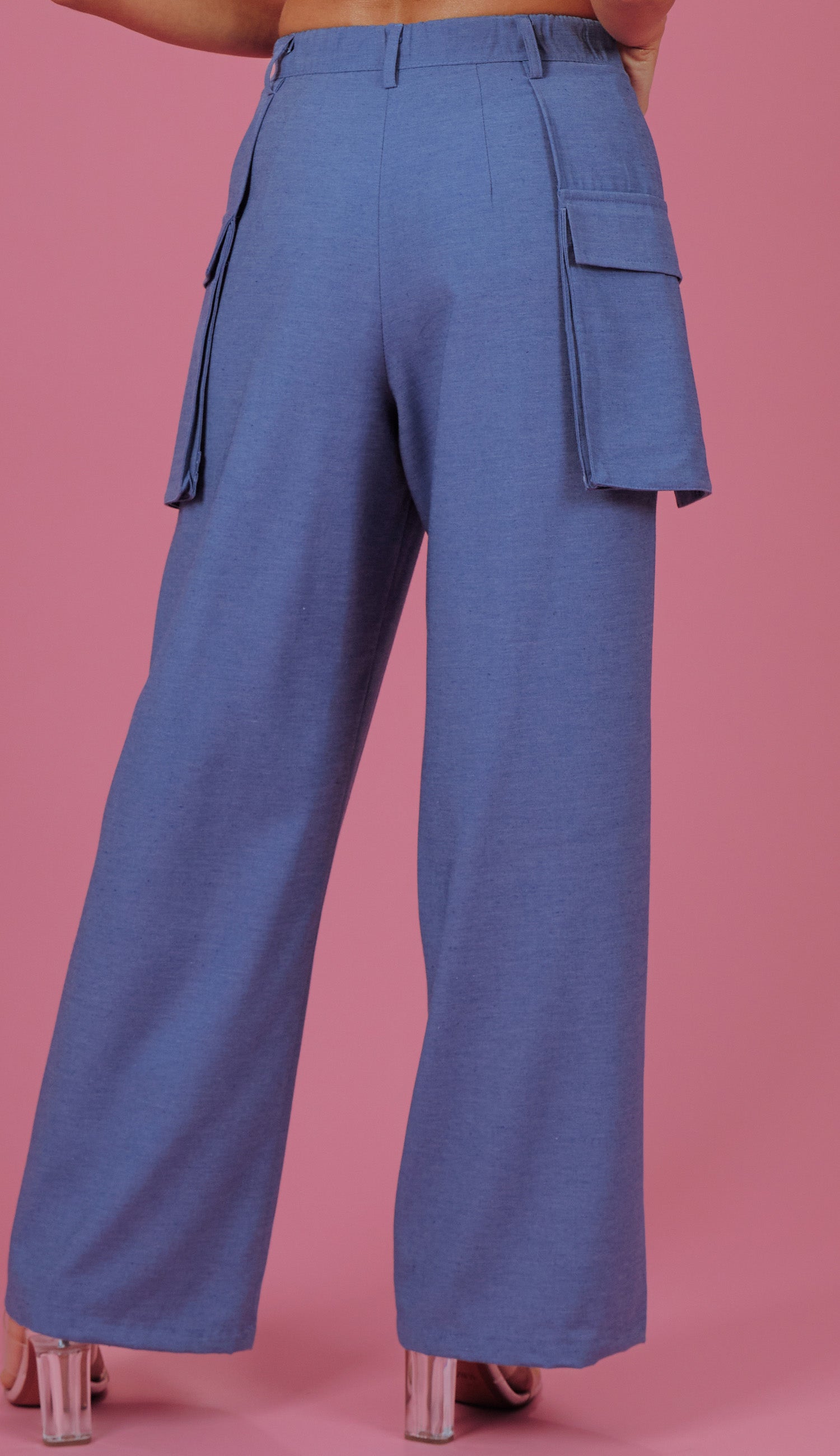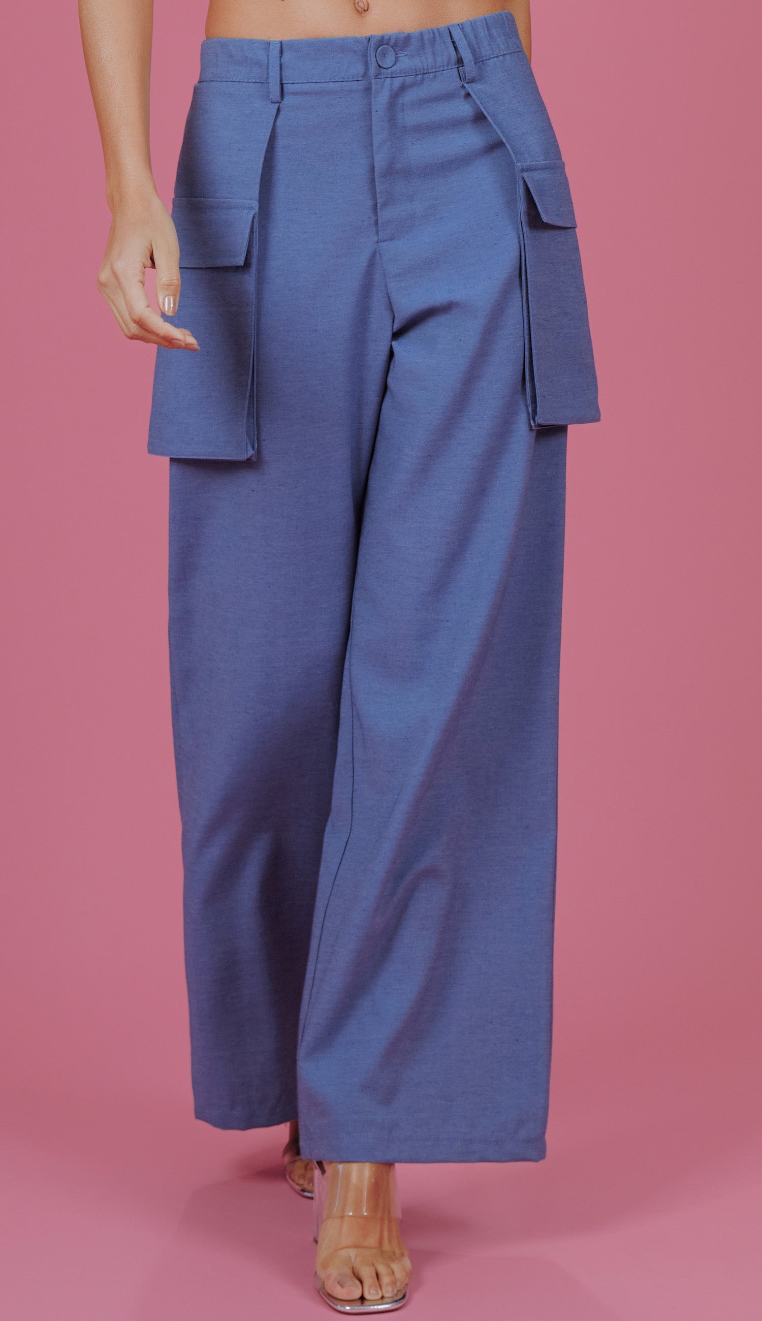 Calça wide confeccionada em linho com revestimento e padronagem rajada. Possui elástico no cós, fechamento frontal por zíper e botão forrado, passantes no cós, sobreposição de tecido nas laterais com maxi bolso aplicado com lapela.