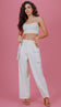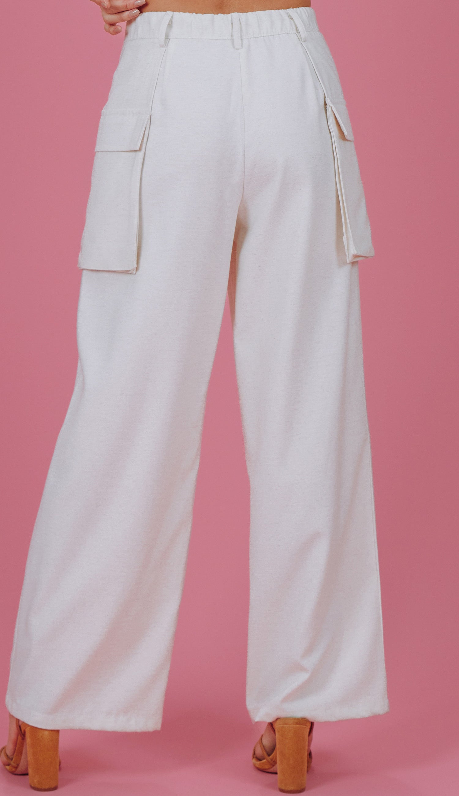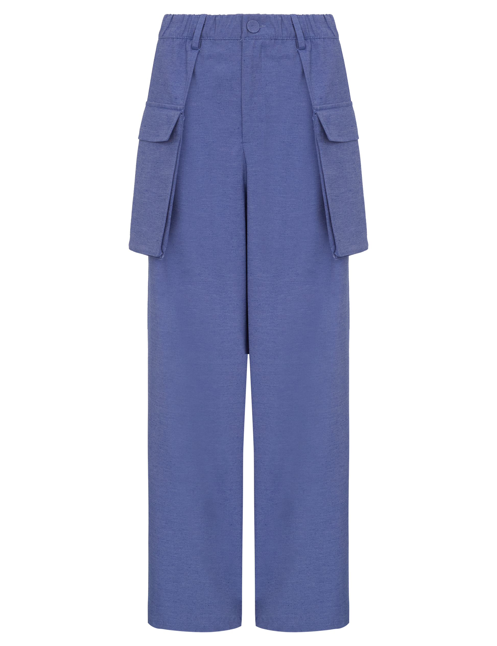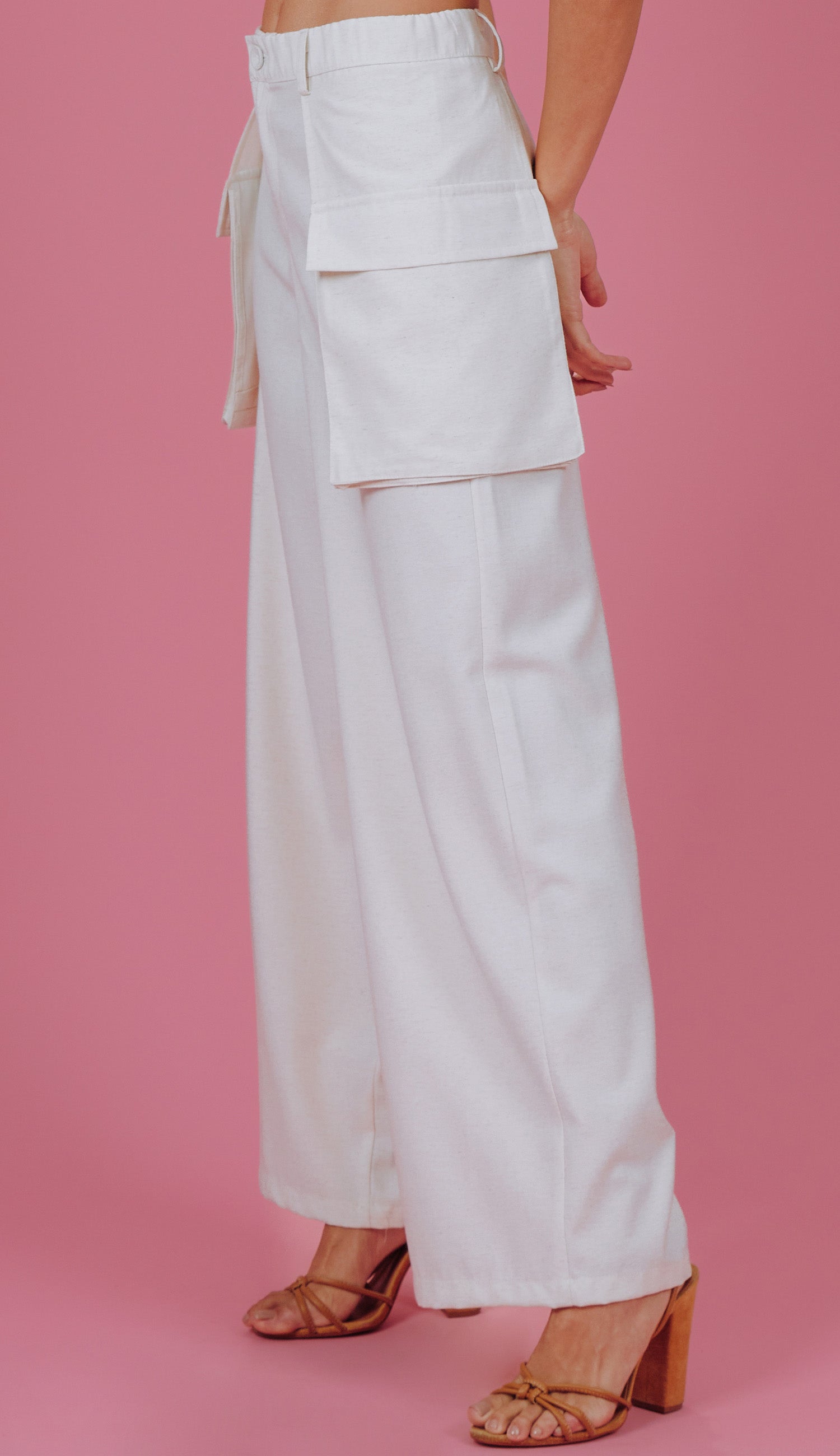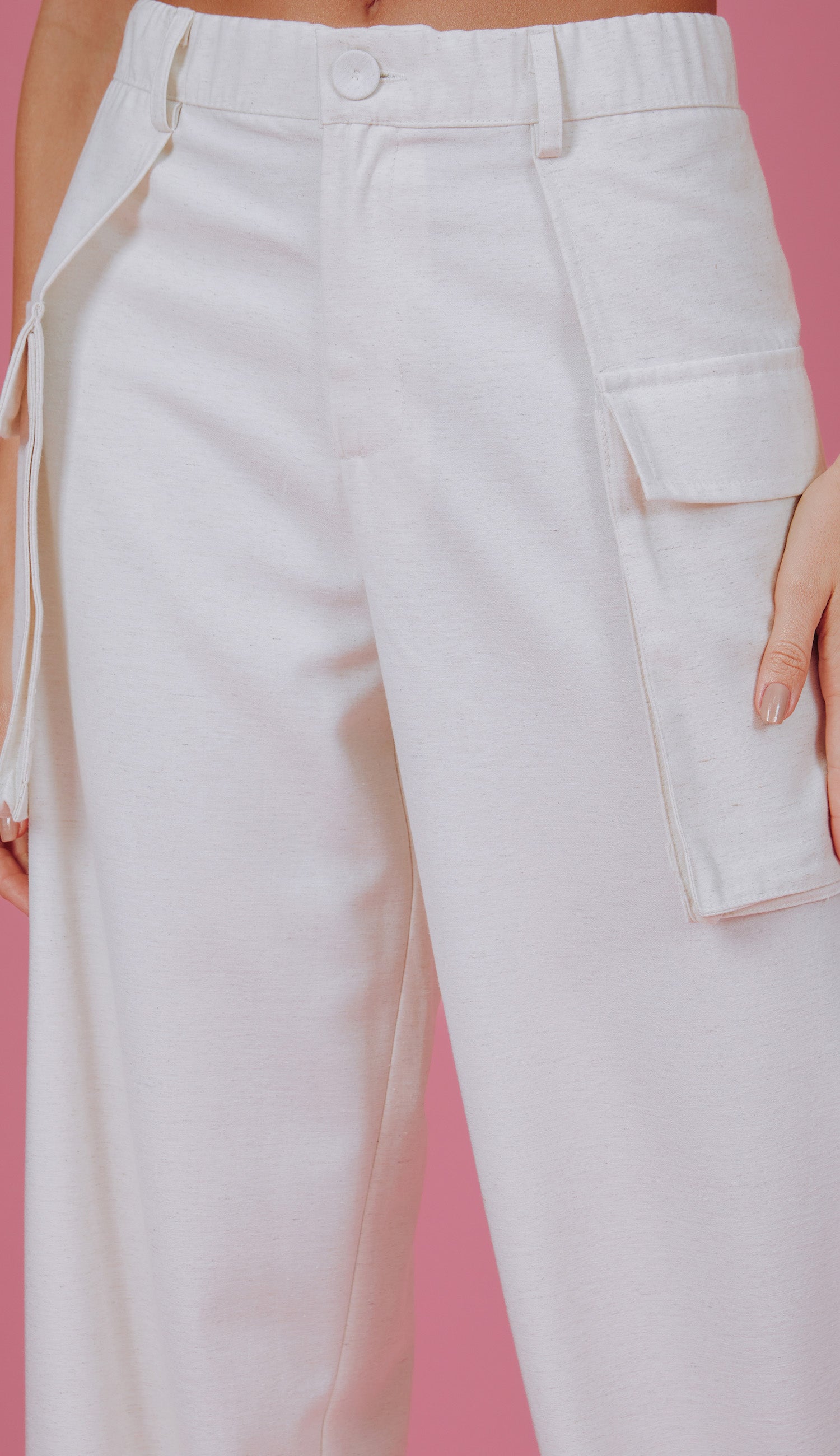 Calça wide confeccionada em linho com revestimento e padronagem rajada. Possui elástico no cós, fechamento frontal por zíper e botão forrado, passantes no cós, sobreposição de tecido nas laterais com maxi bolso aplicado com lapela.