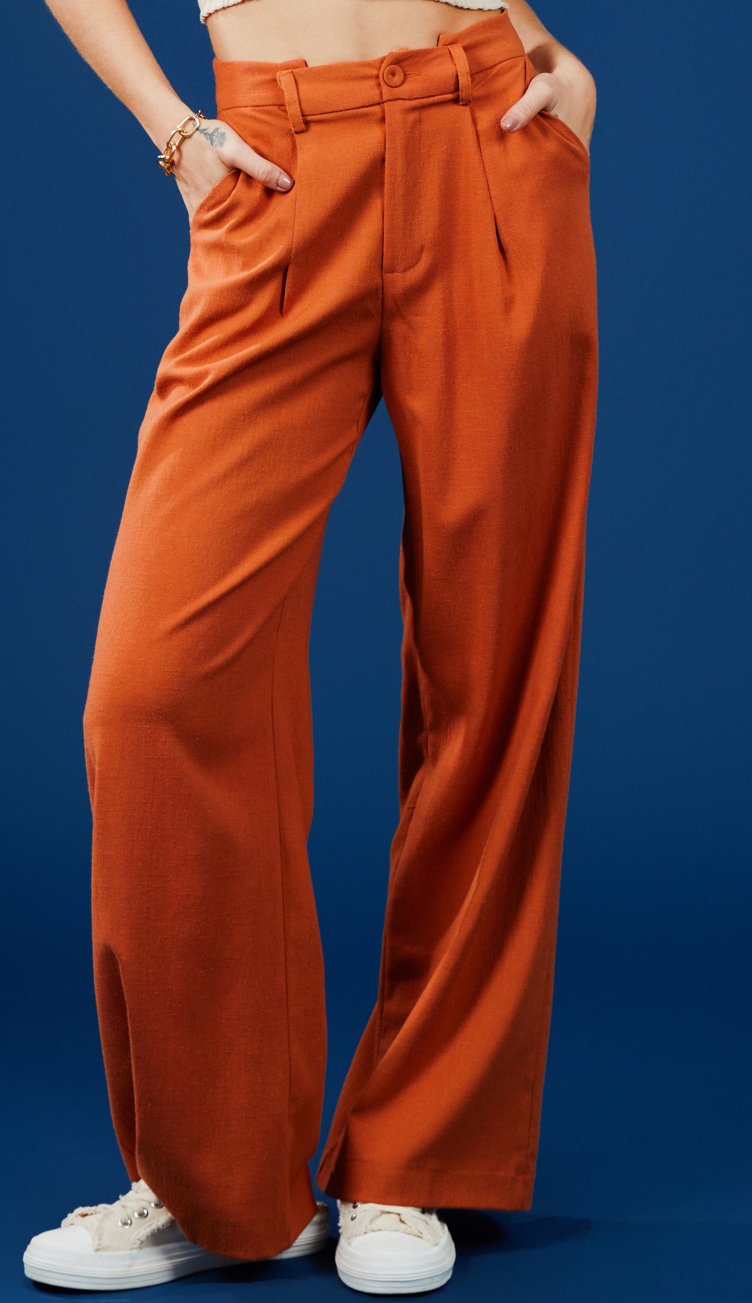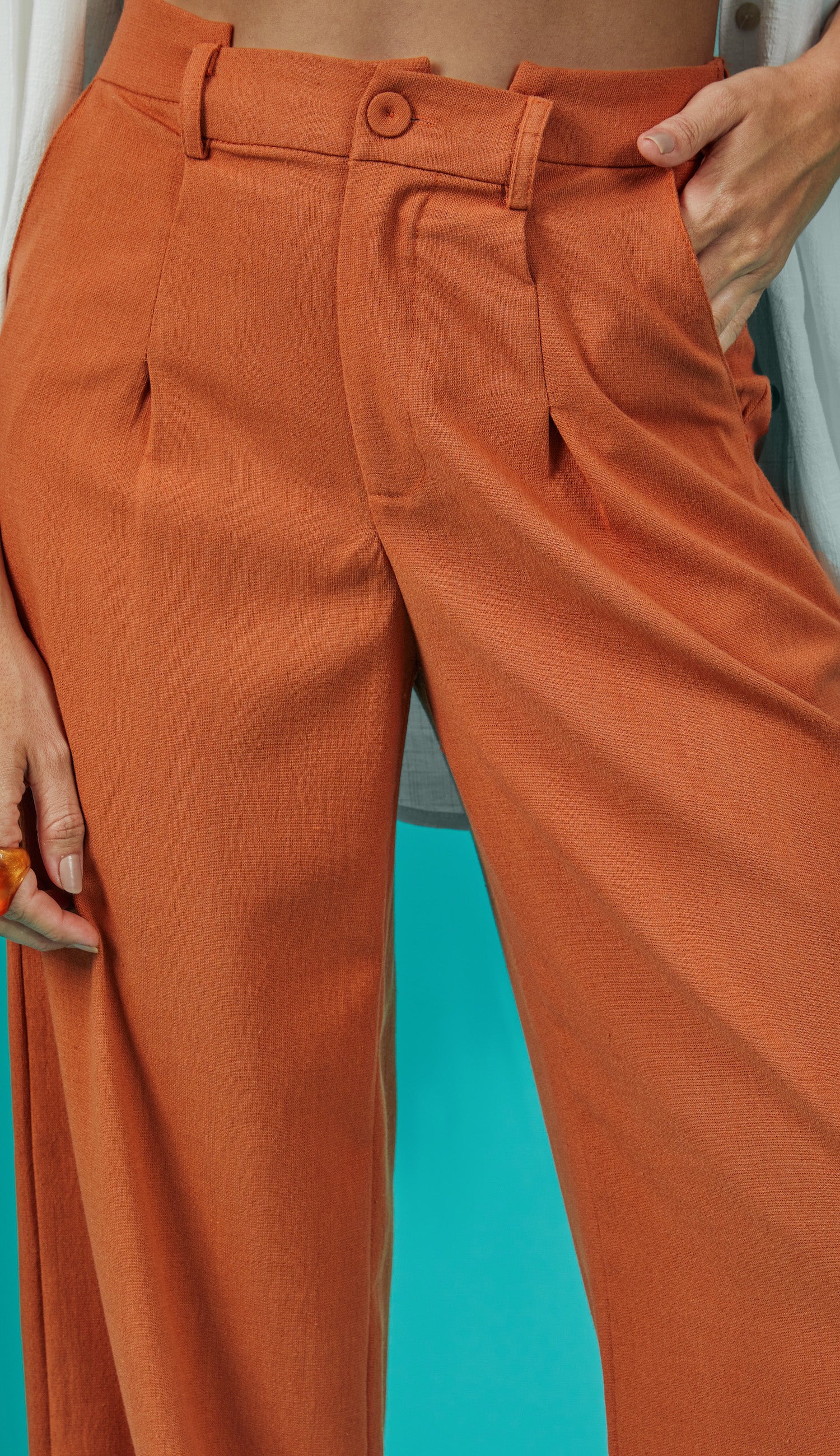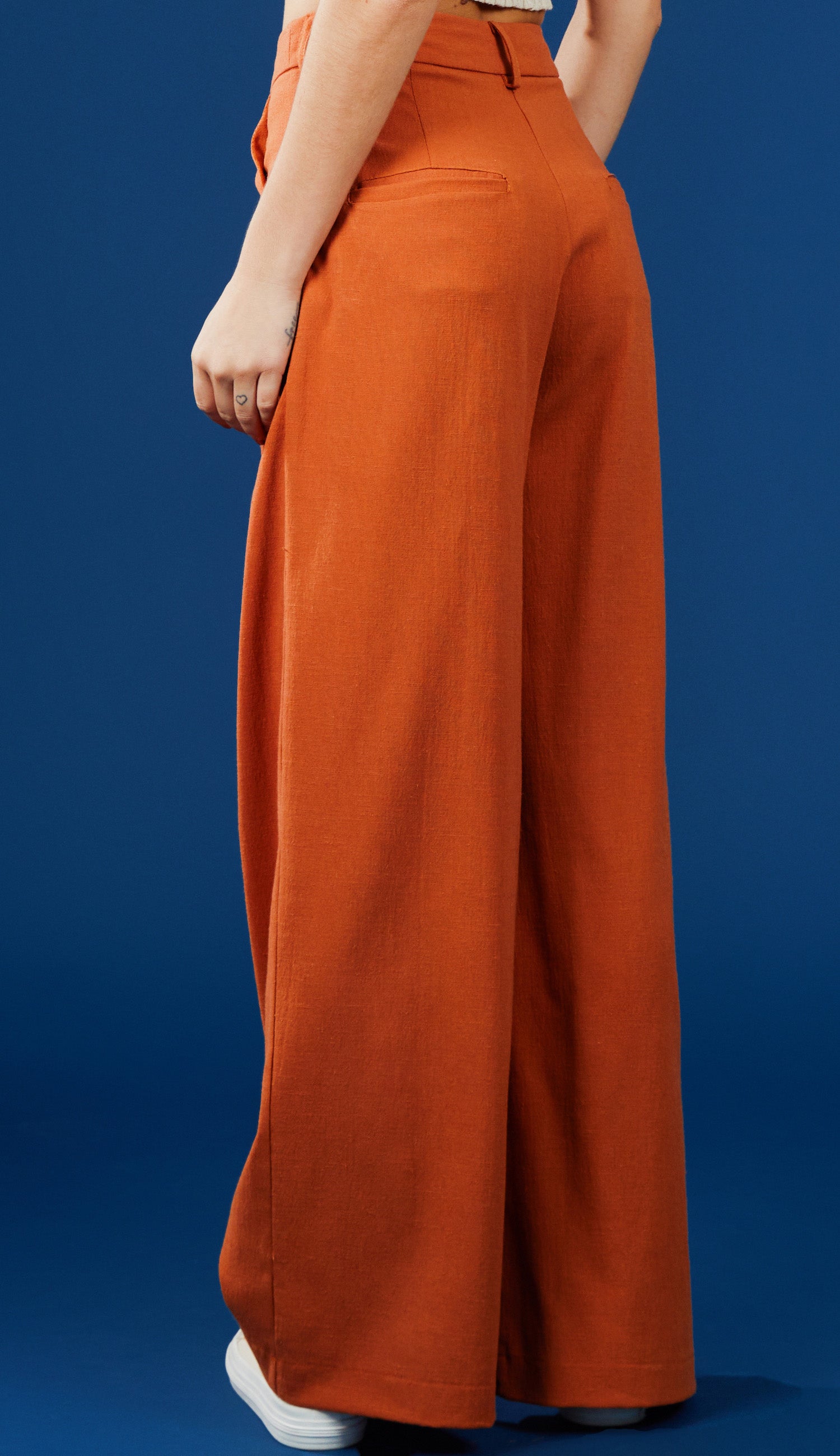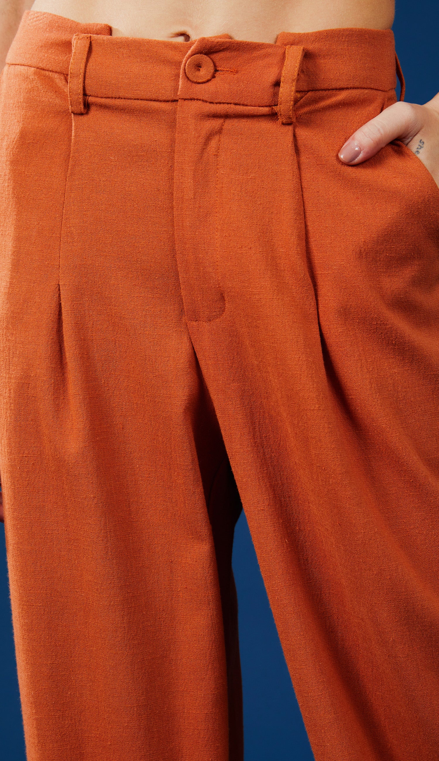 Calça wide leg confeccionada em linho com aspecto amassadinho. Possui cós assimétrico com passantes, pregas frontais, bolsos traseiros e fechamento frontal por zíper e botão forrado. Uma peça elegante e confortável para criar vários looks versáteis.